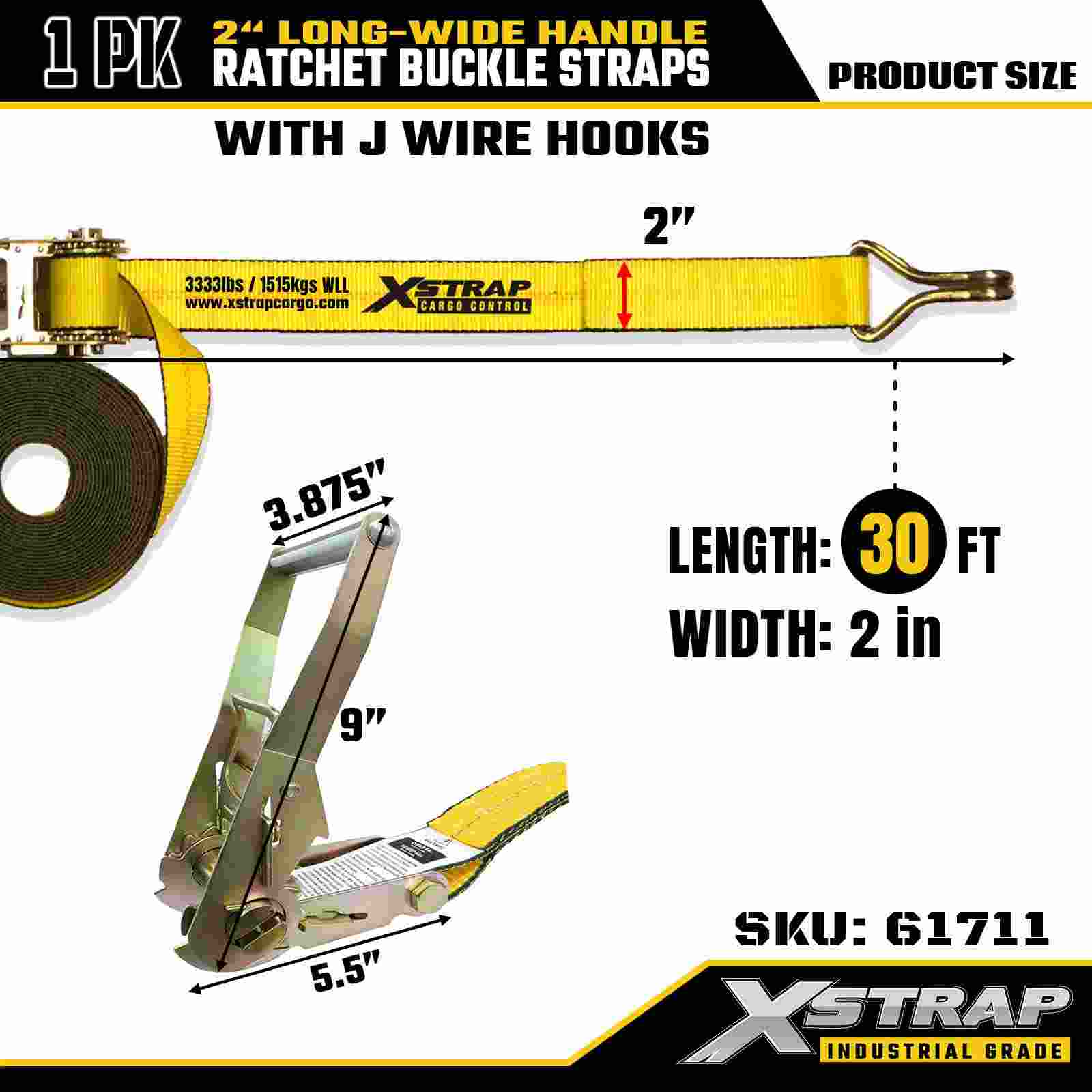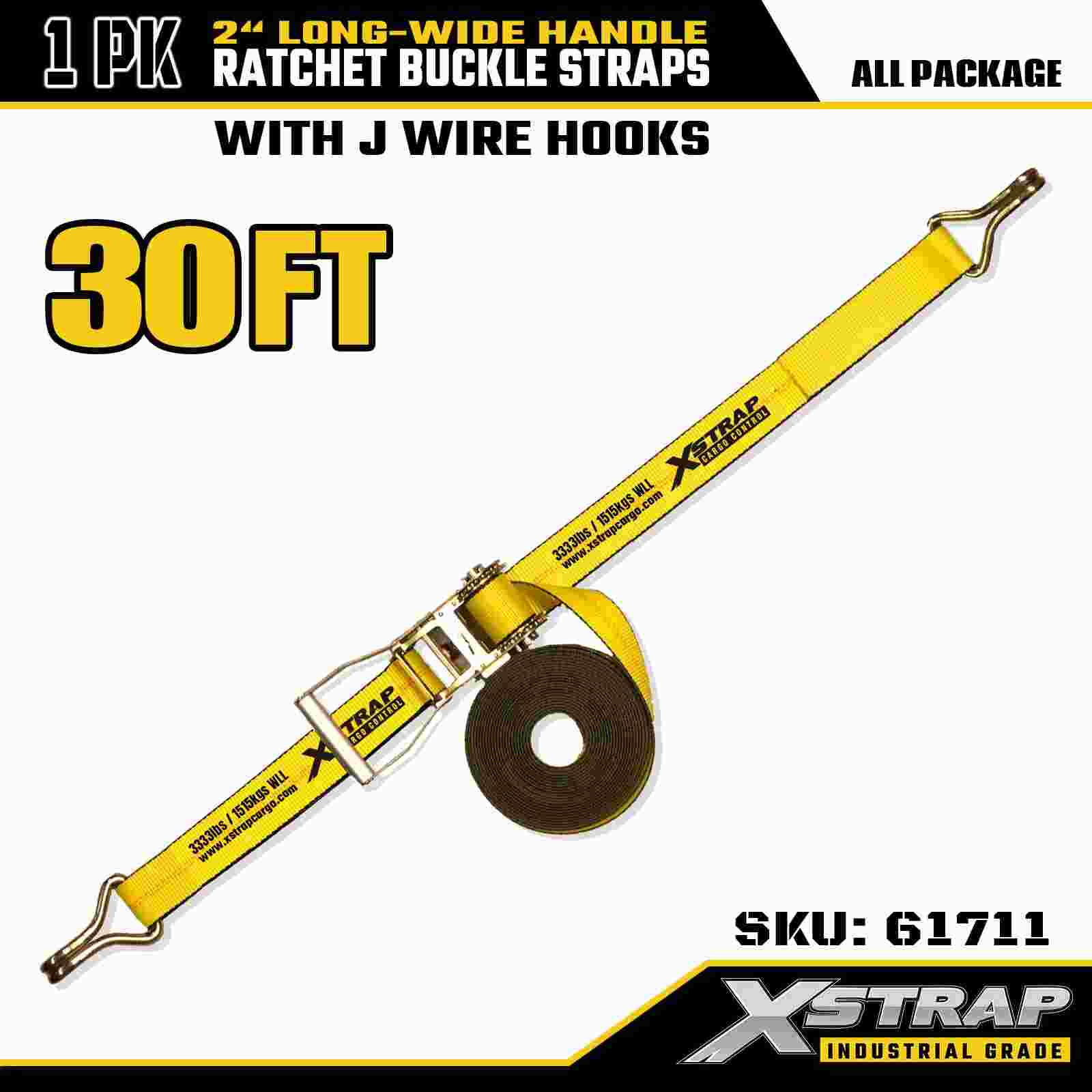 Xstrap 61711 أشرطة ربط سقاطة ممتازة 2 بوصة × 30 قدم (عبوة واحدة) مع خطافات سلكية، قوة كسر 10,000 رطل، ربط شديد التحمل من أجل النقل المطلوب