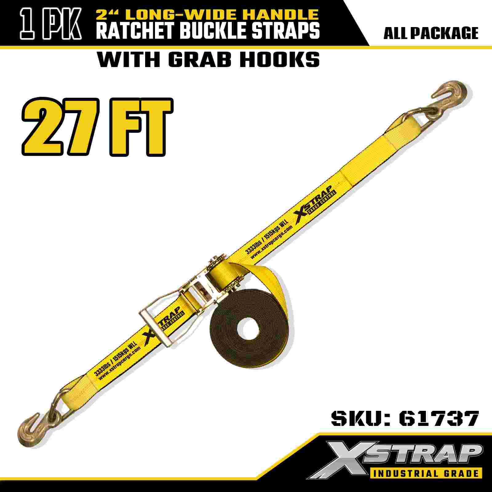 Xstrap 61737 حزام سقاطة عالي التحمل مقاس 2 بوصة × 27 قدم قطعة واحدة مع خطافات للإمساك باللون الأصفر، WLL 3,333 رطل، حزام سقاطة طويل بمقبض عريض للآلات والمعدات