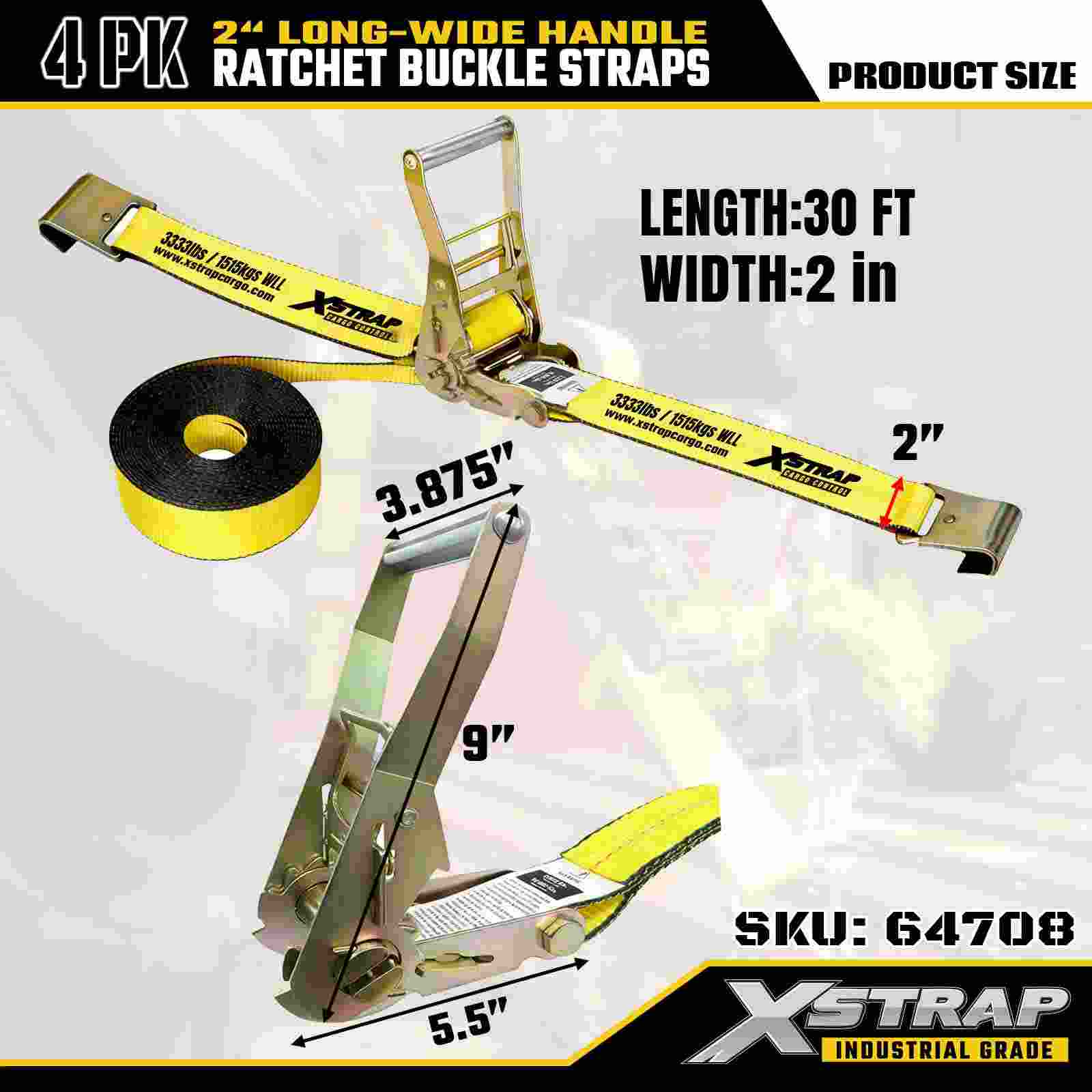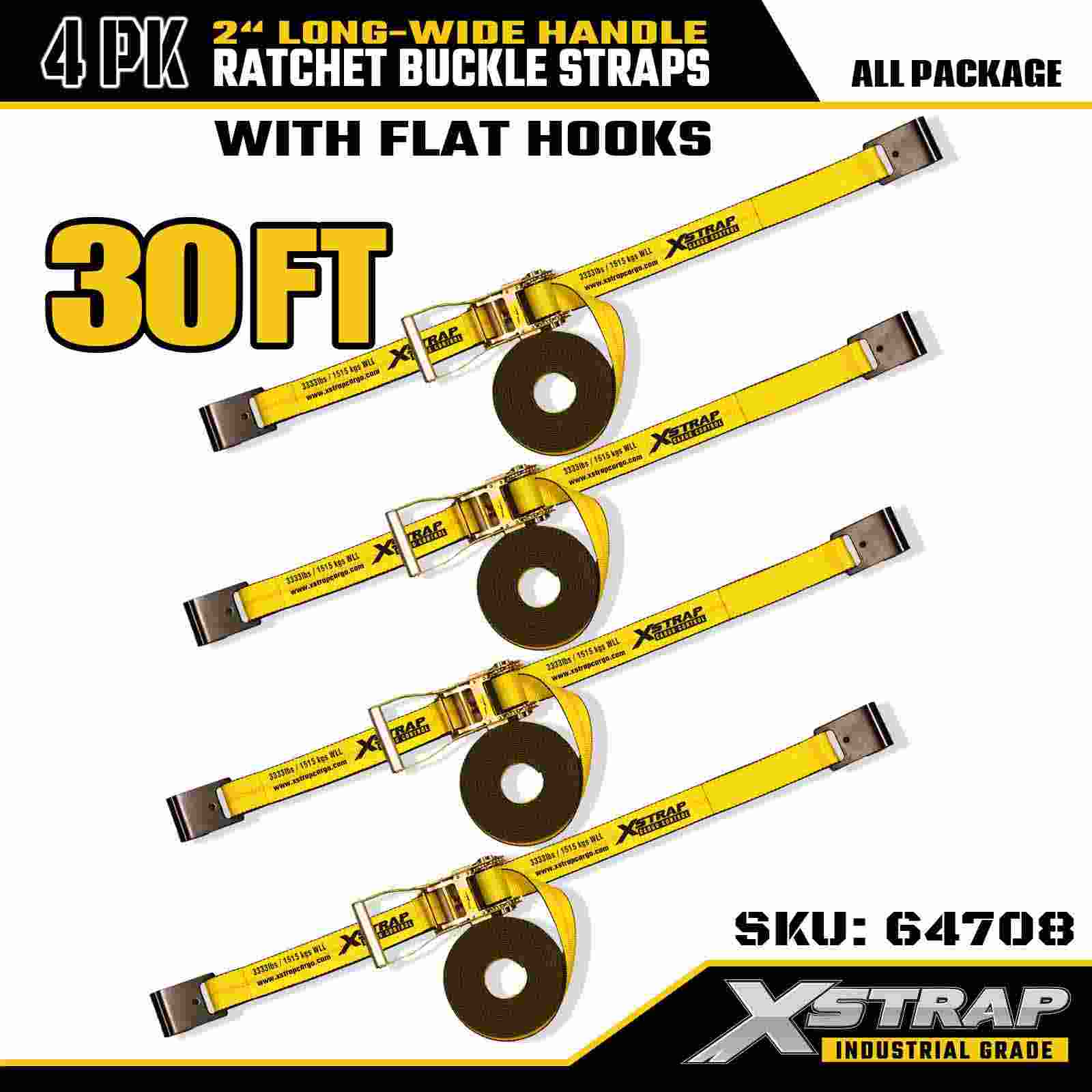 Xstrap 64708 أشرطة بإبزيم بسقاطة بمقبض ممتد 2 بوصة × 30 قدم (4 عبوات) - خطافات مسطحة، قوة مصنفة 10,000 رطل، حل للتحكم في البضائع الصناعية