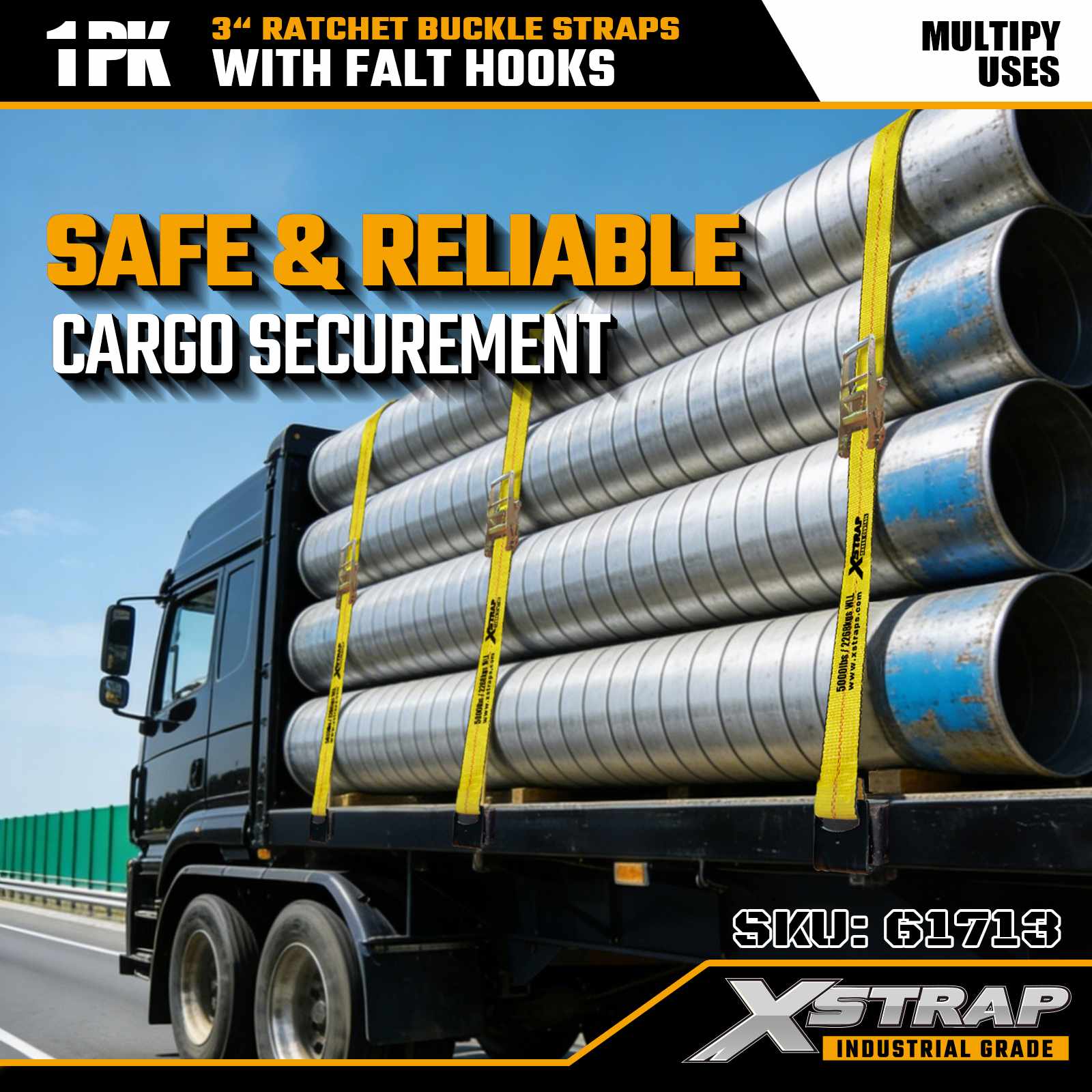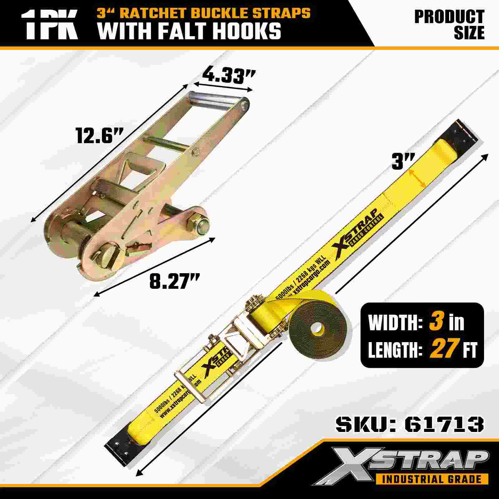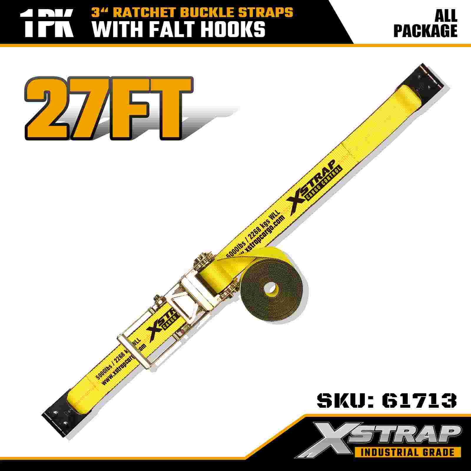 Xstrap 61713 أشرطة بإبزيم بسقاطة 3 بوصة × 27 قدم (عبوة واحدة) خطافات مسطحة، سعة تحميل 5000 رطل، قوة كسر 15000 رطل، ربط شديد التحمل للشاحنات والمقطورات ونقل البضائع الصناعية.