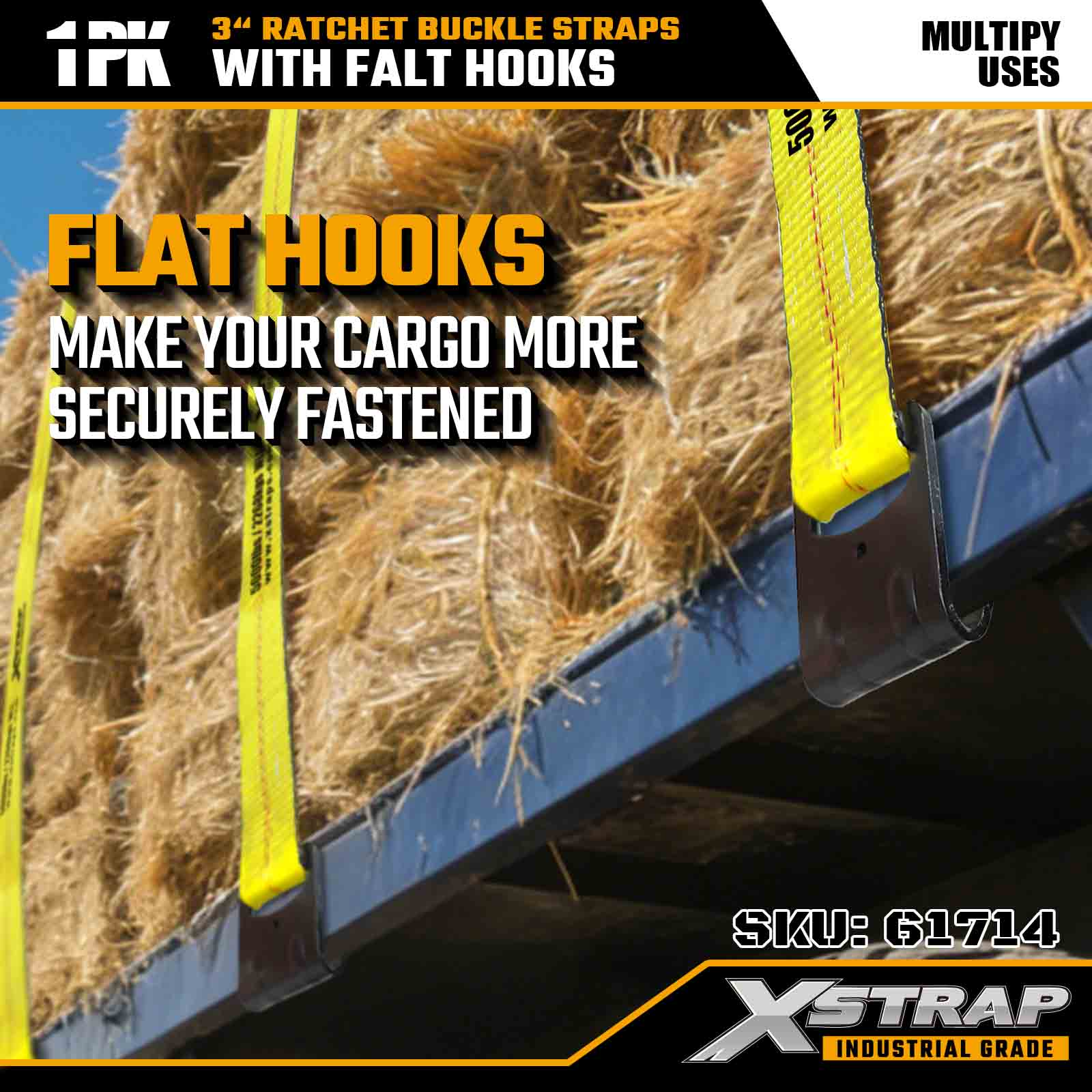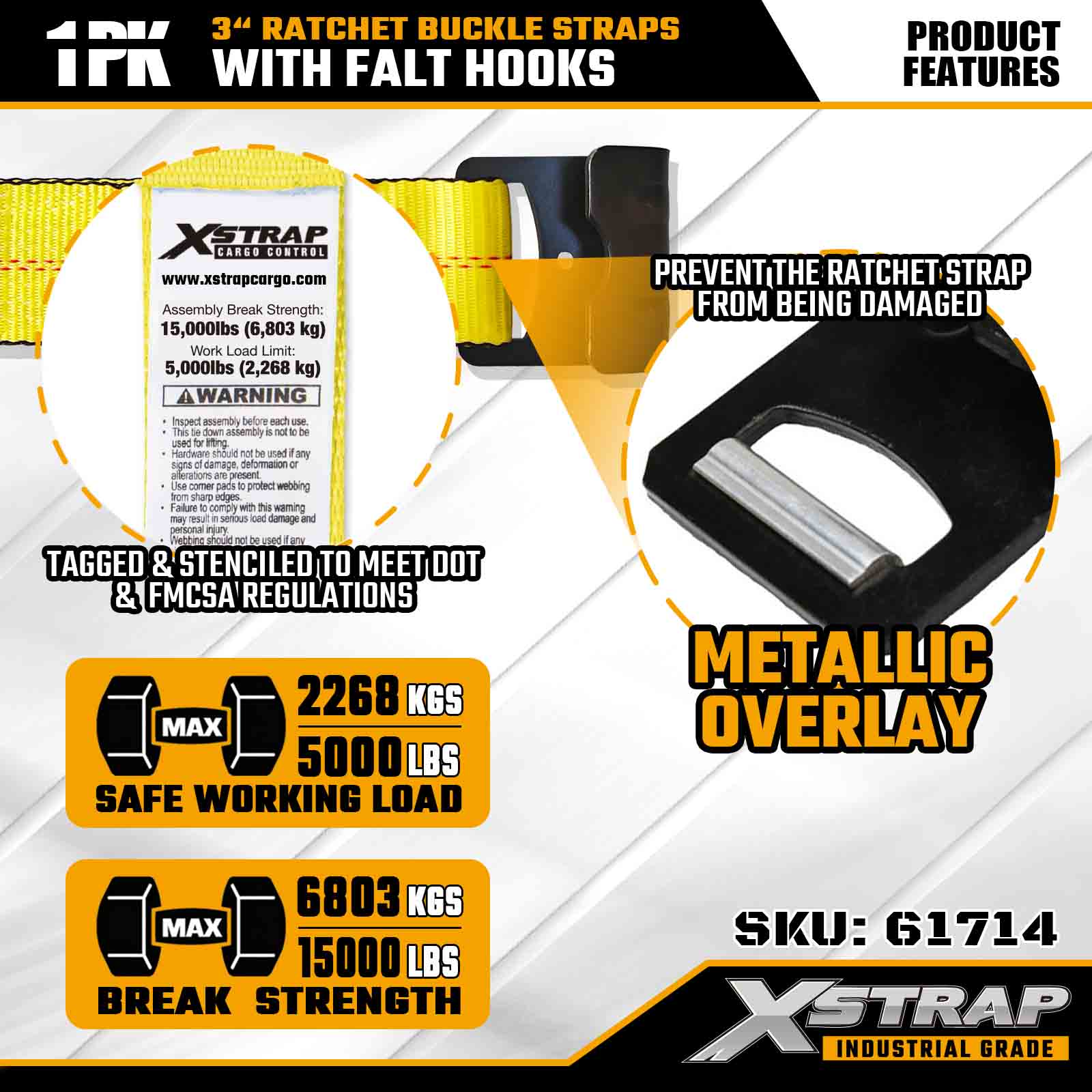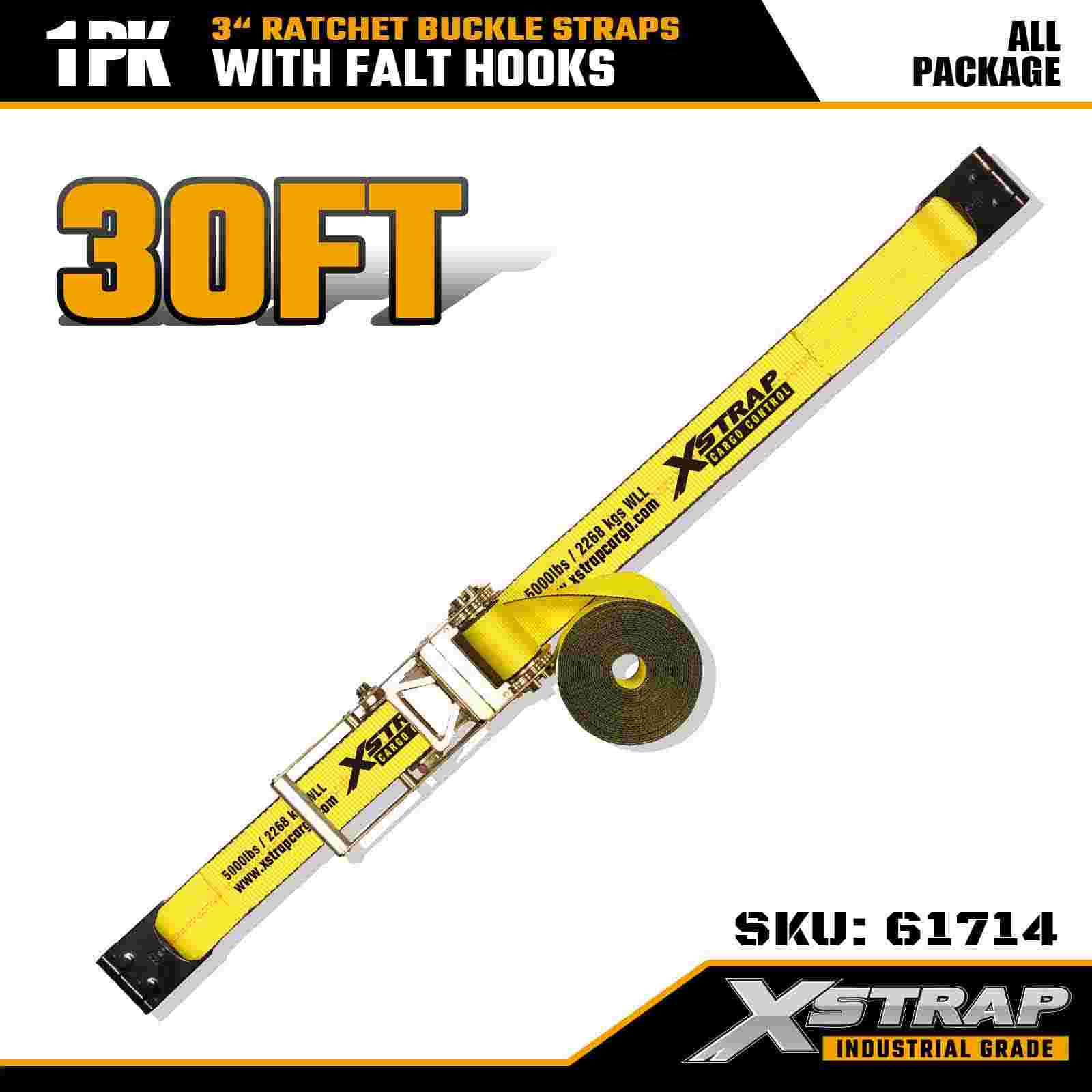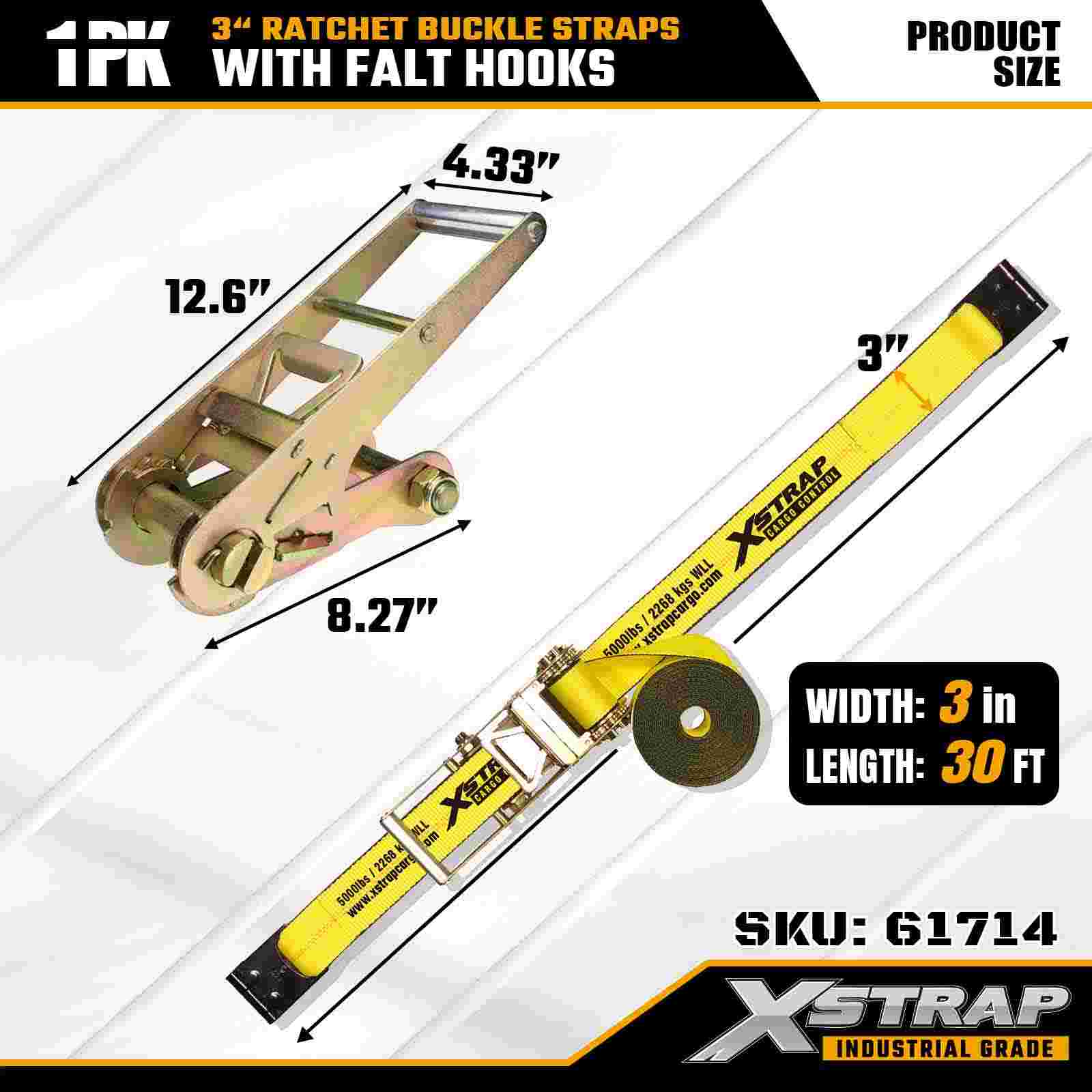 Xstrap 61714 أشرطة بإبزيم بسقاطة 3 بوصة × 30 قدم (عبوة واحدة) - خطافات مسطحة، سعة تحميل 5000 رطل، قوة كسر 15000 رطل، ربط شديد التحمل للشاحنات والمقطورات ونقل البضائع الصناعية.