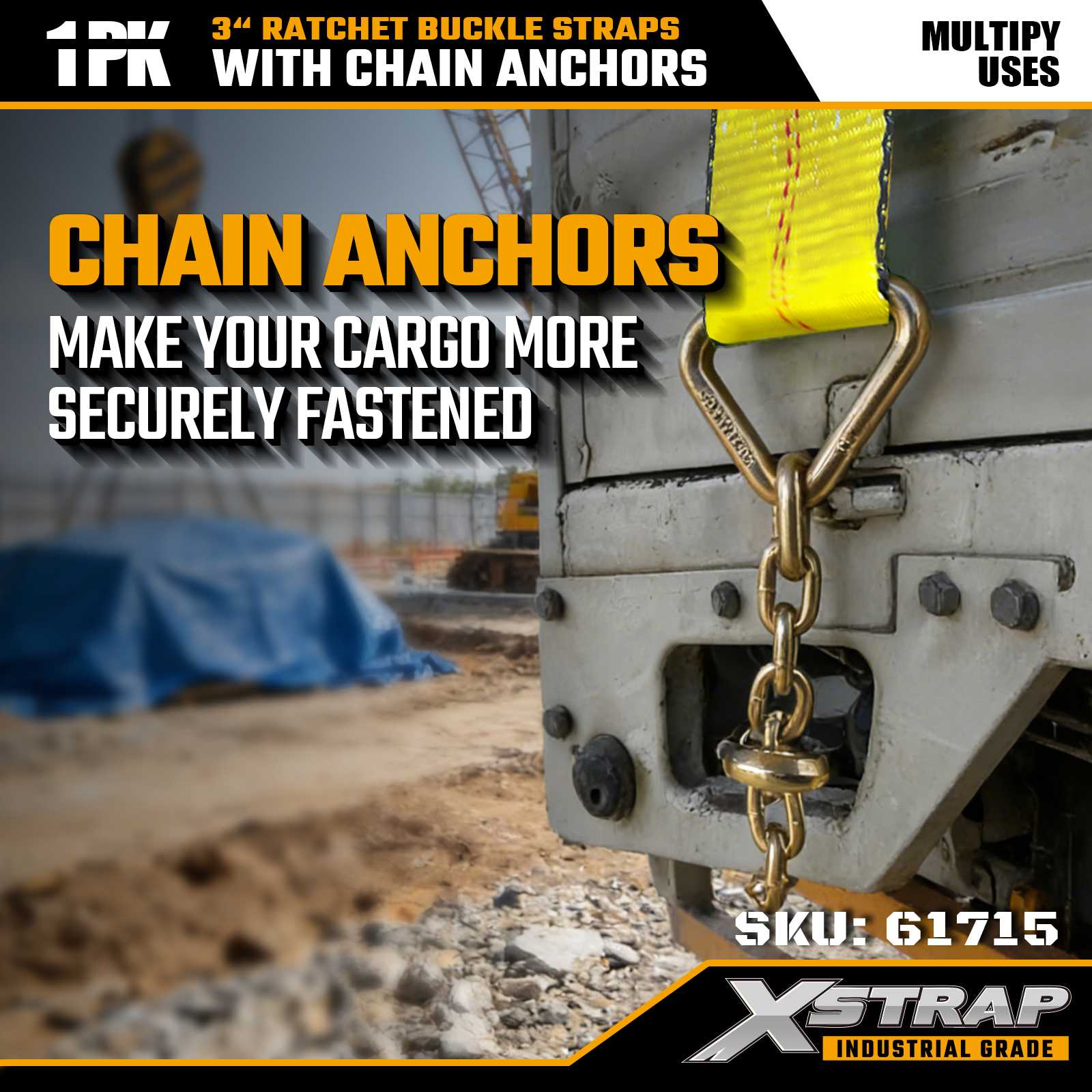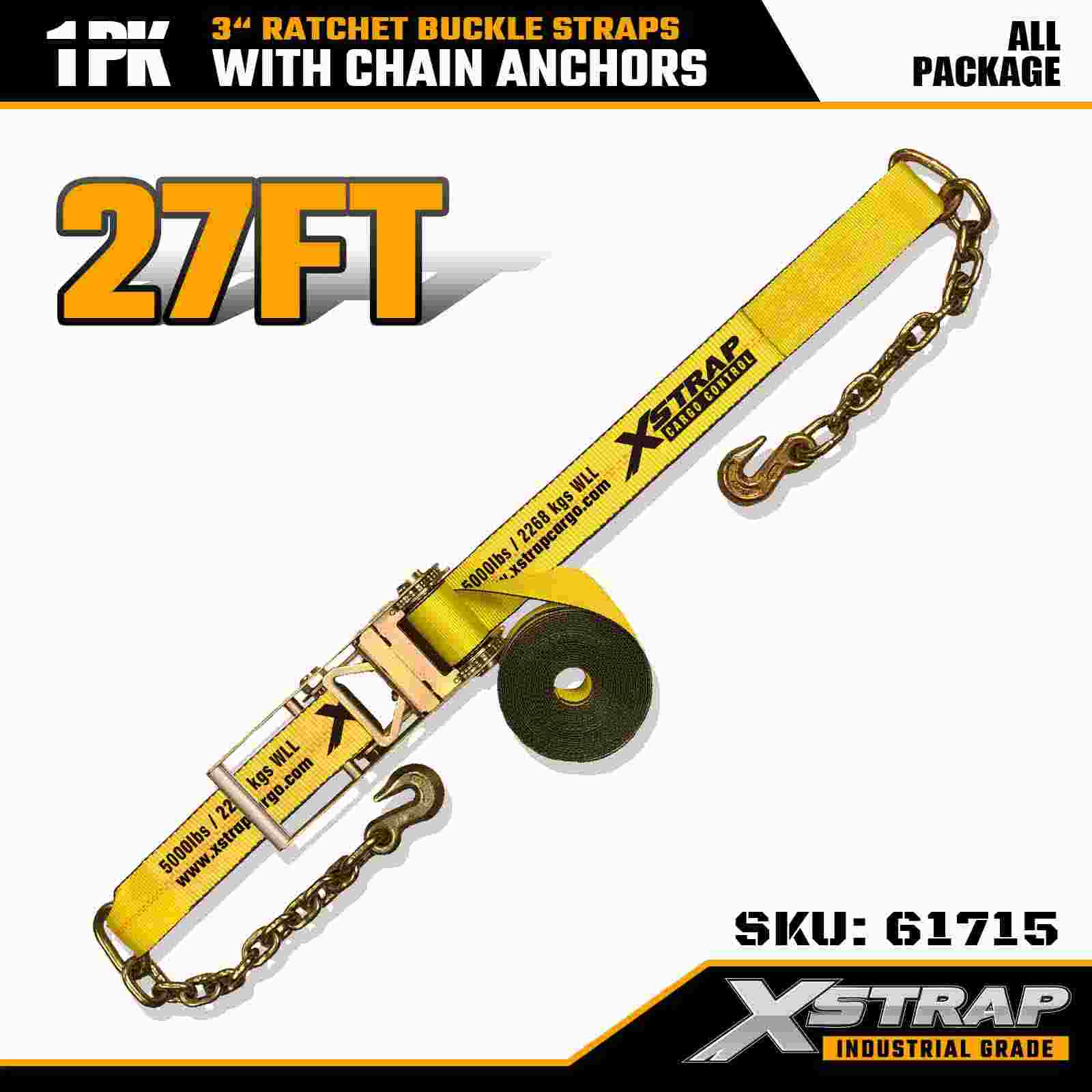 Xstrap 61715 3 × 27 قدم أشرطة بإبزيم بسقاطة (عبوة واحدة) - مرساة سلسلة، سعة تحميل 5000 رطل، قوة كسر 15000 رطل. تم تصميم هذه الأشرطة للتحكم في البضائع الثقيلة، وتجمع بين حزام من الدرجة الصناعية مع أطراف تثبيت السلسلة لتوفير أقصى قدر من الأمان في الشاحنات والمقطورات ونقل البناء.