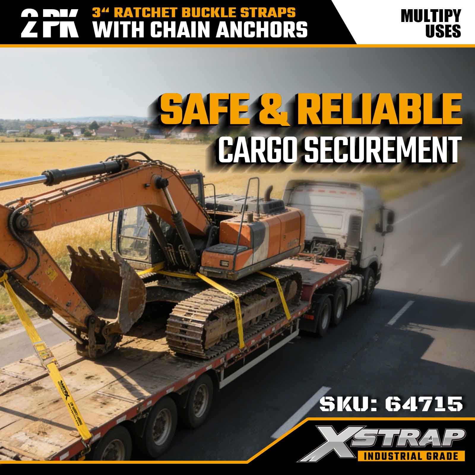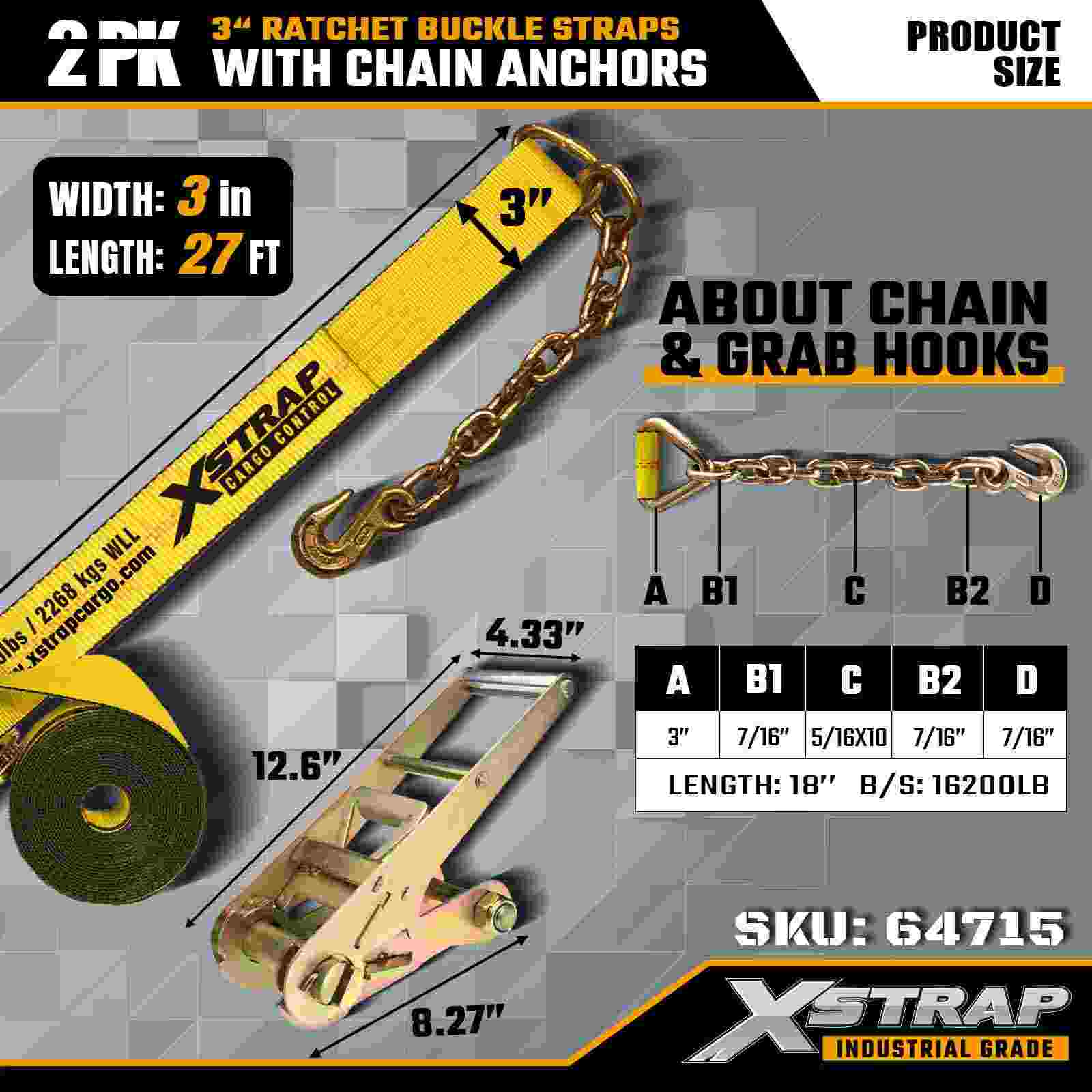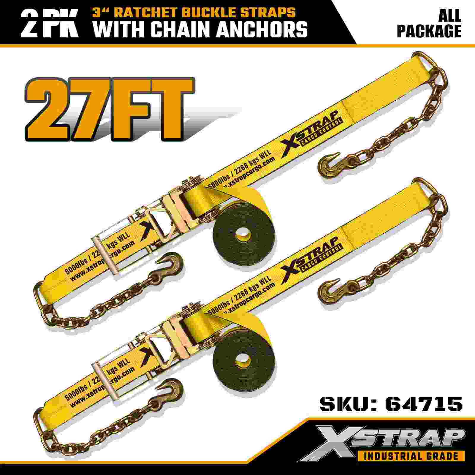 أشرطة Xstrap 64715 مقاس 3 بوصات × 27 قدمًا (عبوة من قطعتين) - مجهزة بمثبتات سلسلة شديدة التحمل، مصممة لبيئات الشحن الصعبة. مع حد حمل عمل يبلغ 5000 رطل وقوة كسر تبلغ 15000 رطل، توفر هذه الأشرطة أداء ربط آمن ومستقر واحترافي للأسطح المسطحة ونقل الآلات والنقل الصناعي.