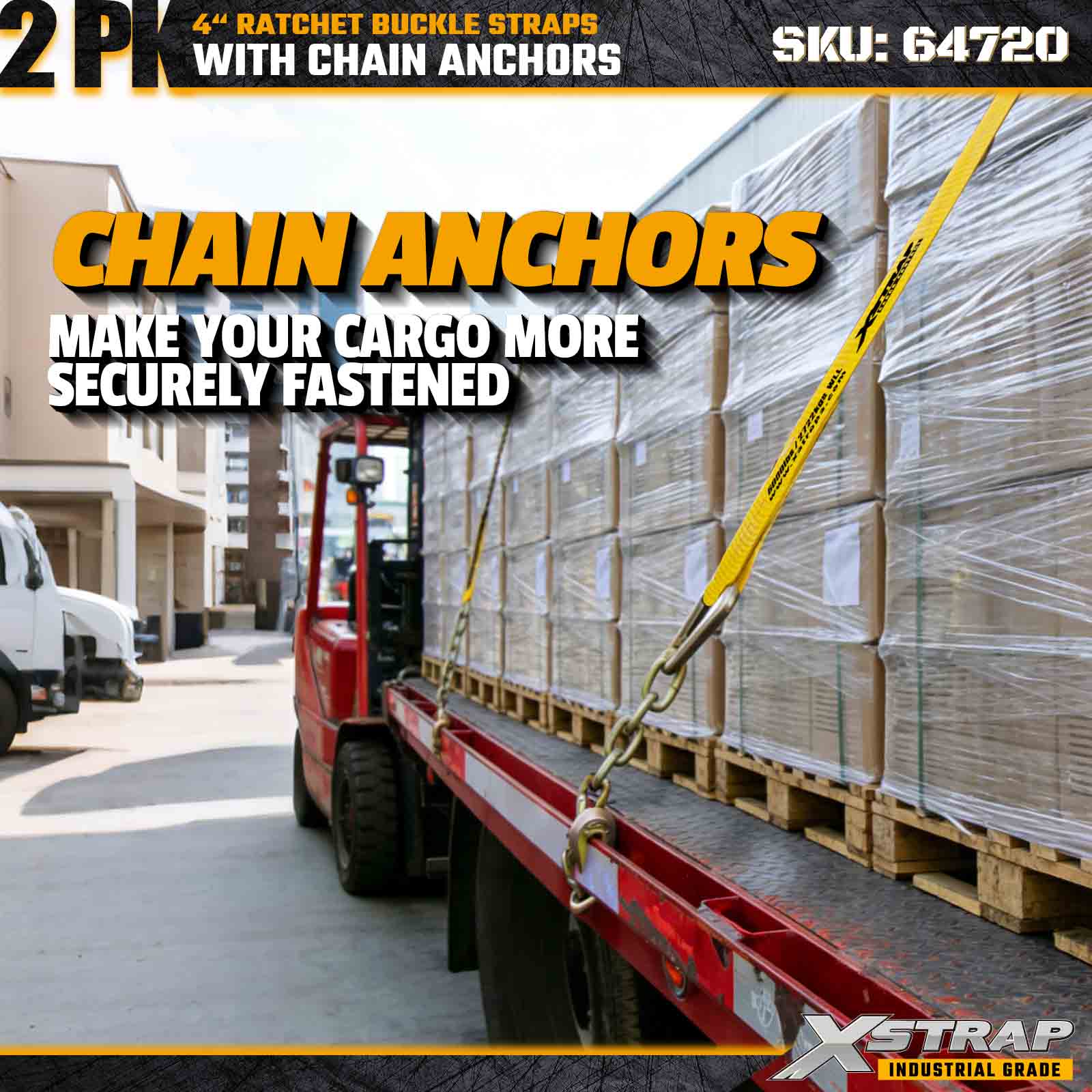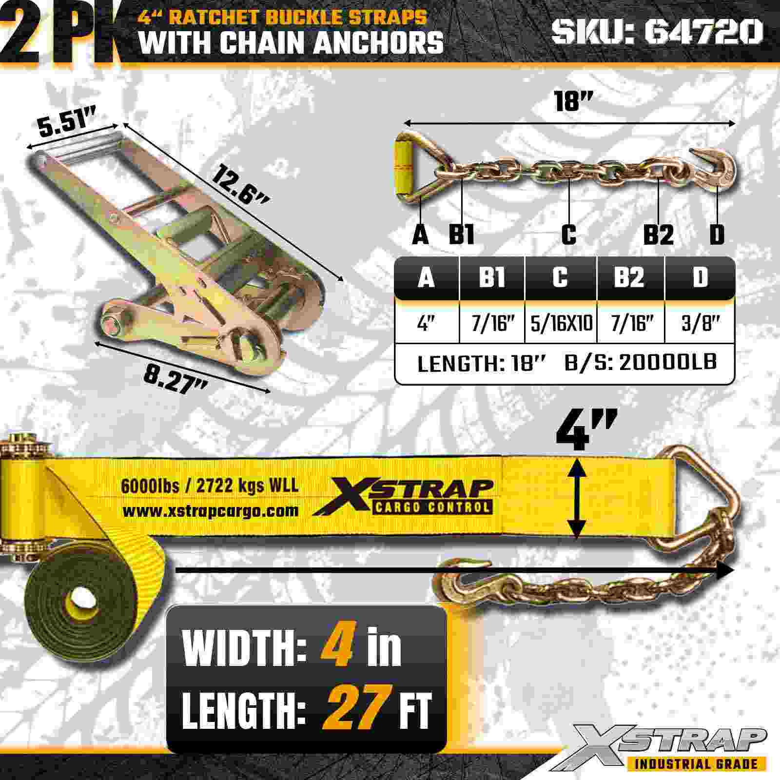 تم تصميم أحزمة Xstrap 64720 مقاس 4 بوصات × 27 قدمًا (عبوة من قطعتين) لتأمين البضائع شديدة التحمل، وتتميز بمثبتات سلسلة متينة وآلية سقاطة معززة. مع حد حمل عمل يصل إلى 6000 رطل وقوة كسر تبلغ 18000 رطل، تعد هذه الأشرطة مثالية للنقل المسطح ونقل الآلات والأحمال الفولاذية وتطبيقات البضائع الصناعية التي تتطلب أقصى قدر من القوة والموثوقية.