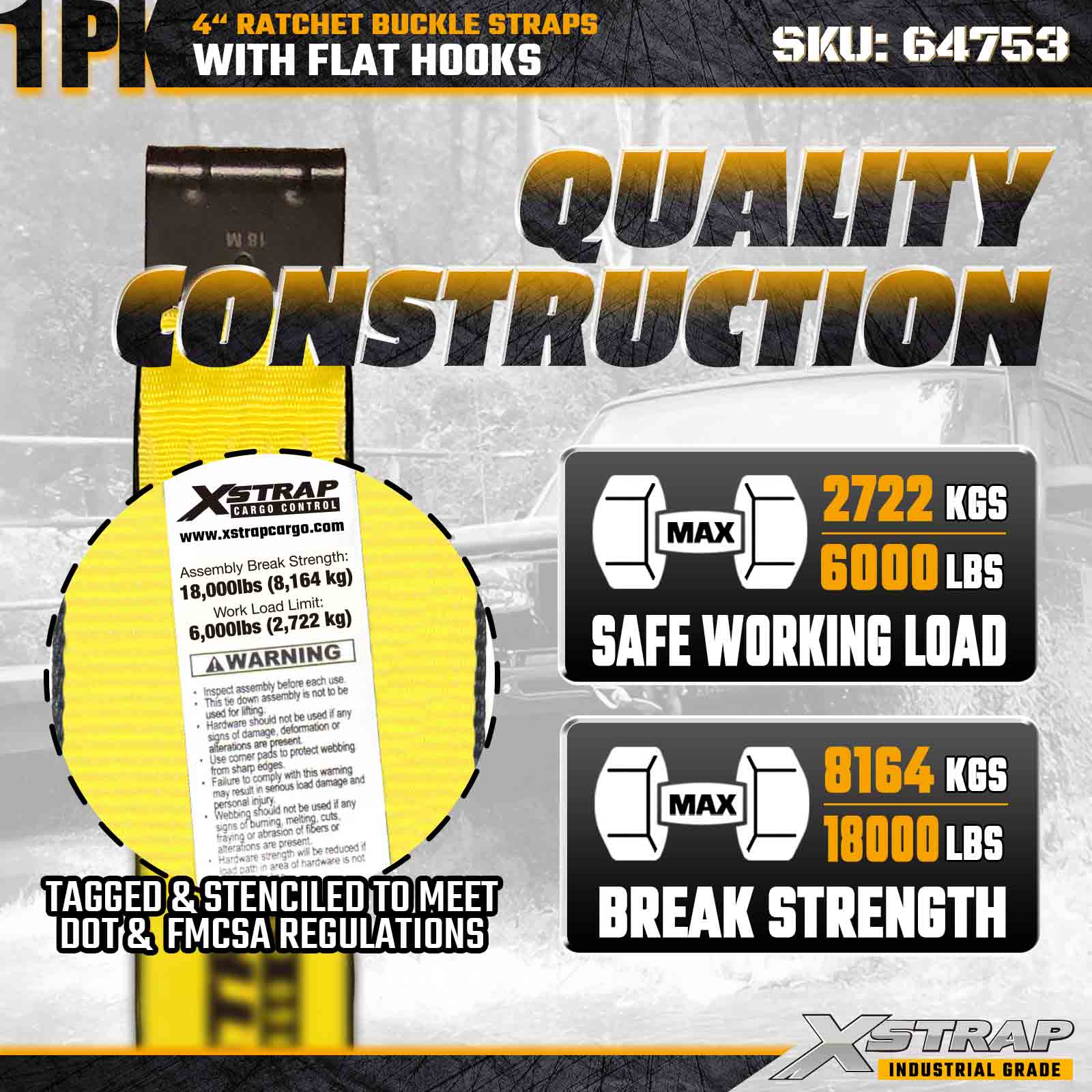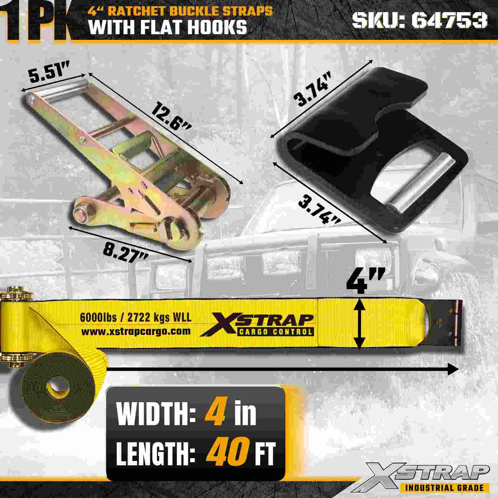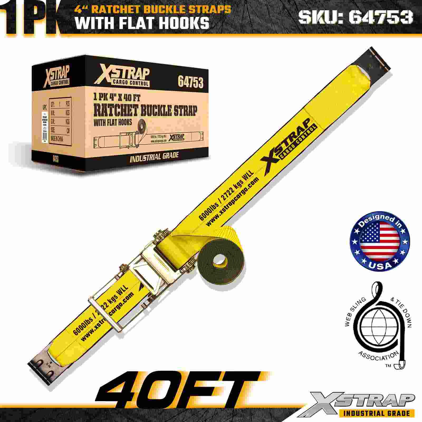 تم تصميم حزام Xstrap 64753 بمشبك تثبيت بسقاطة 4 بوصة × 40 قدم (عبوة واحدة) لتأمين البضائع شديدة التحمل، ويتميز بخطافات مسطحة معززة وآلية سقاطة متينة. مع حد حمل عمل يصل إلى 6000 رطل وقوة كسر تبلغ 18000 رطل، يعد هذا الحزام الطويل للغاية مثاليًا للنقل المسطح والأحمال كبيرة الحجم ونقل الآلات وتطبيقات البضائع الصناعية.