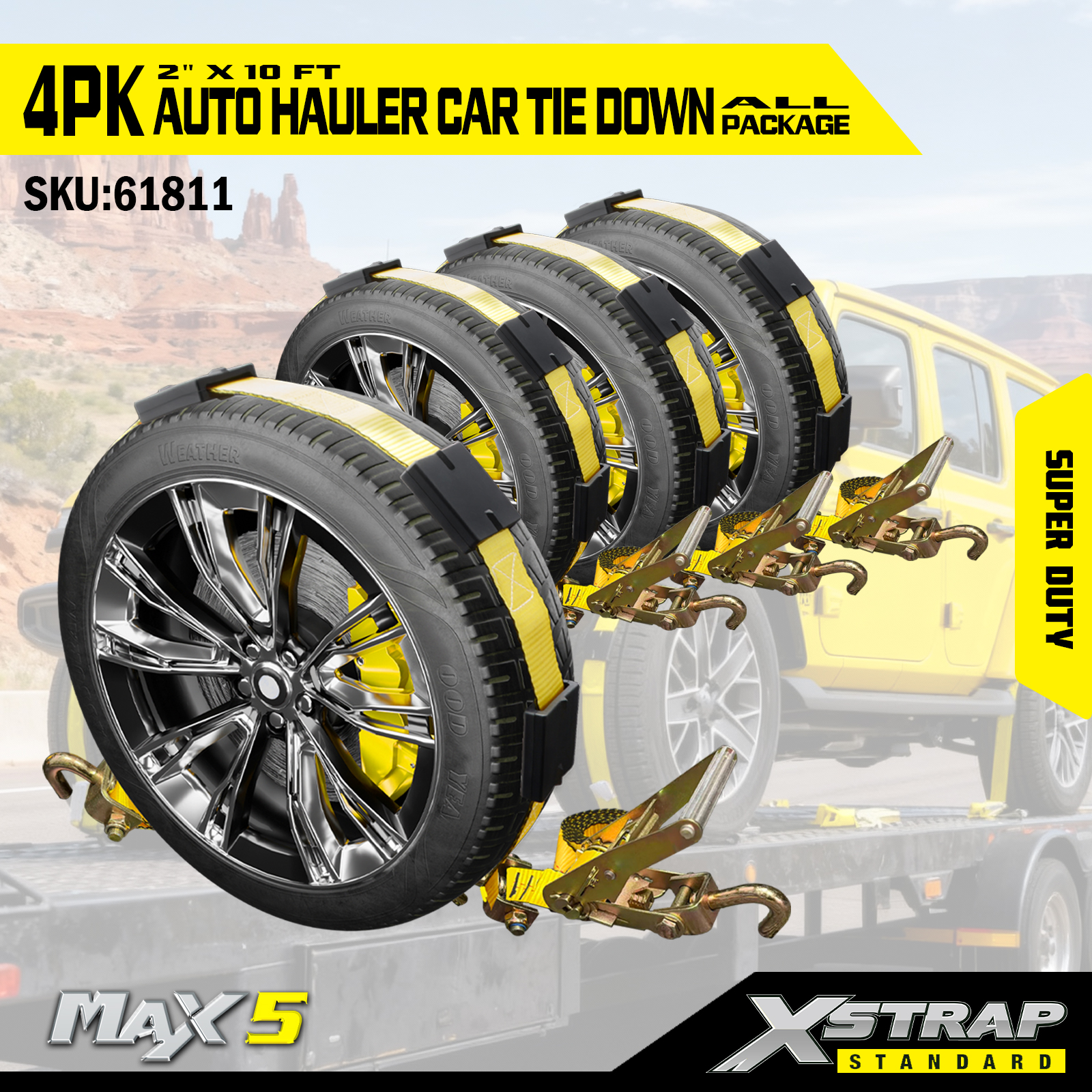 أحزمة Xstrap لشاحنات نقل السيارات شديدة التحمل بقوة 6.600 رطل - أشرطة ربط للإطارات للمقطورات، وربطات عنق على العجلة مع مرابط مطاطية لسيارات الدفع الرباعي والشاحنات وATV وUTV