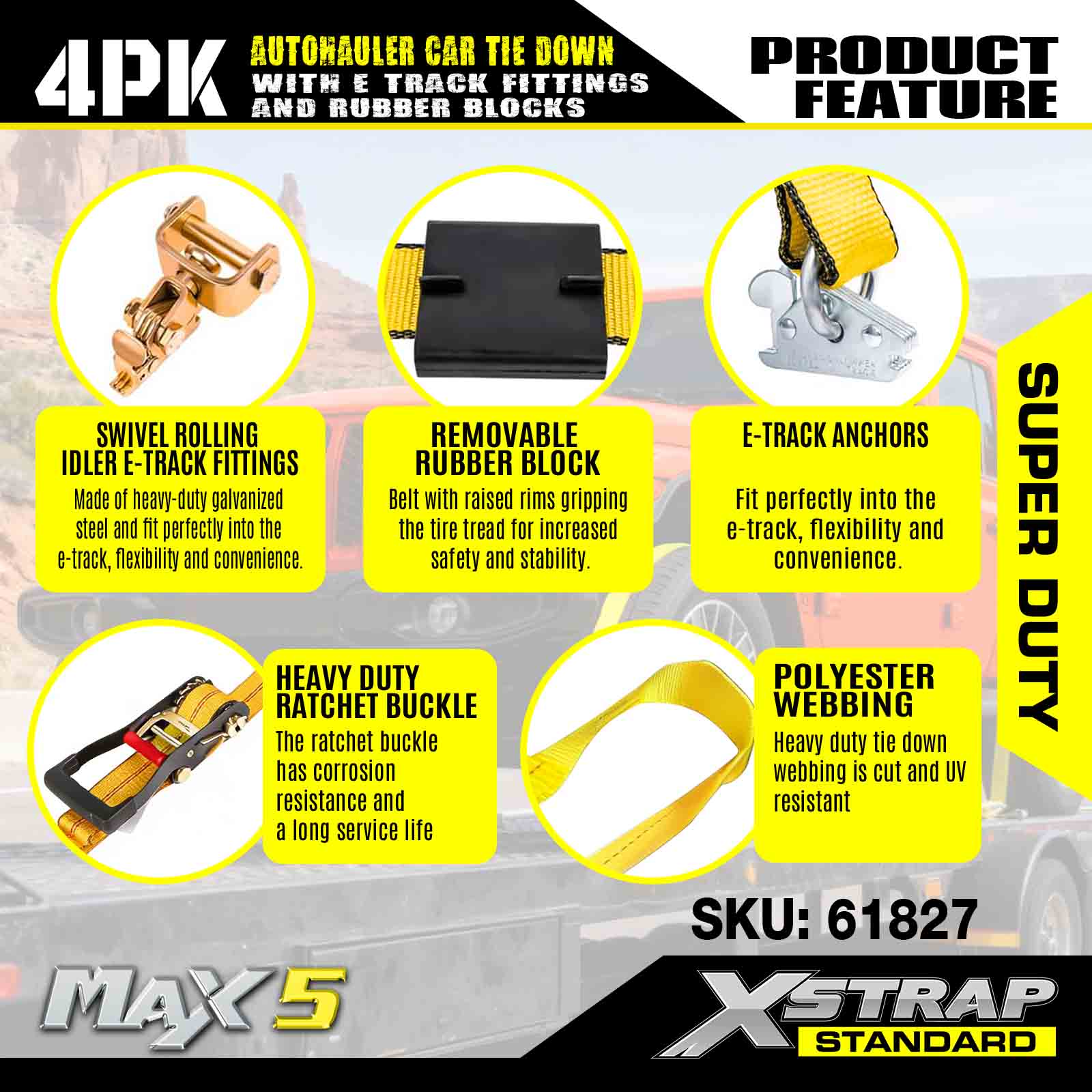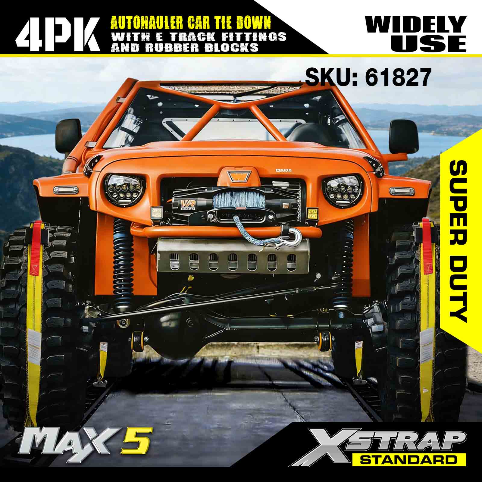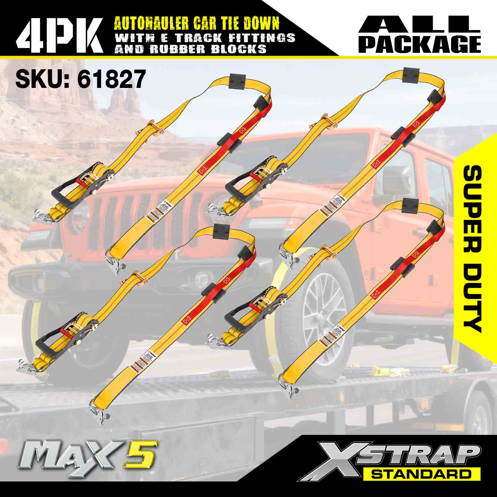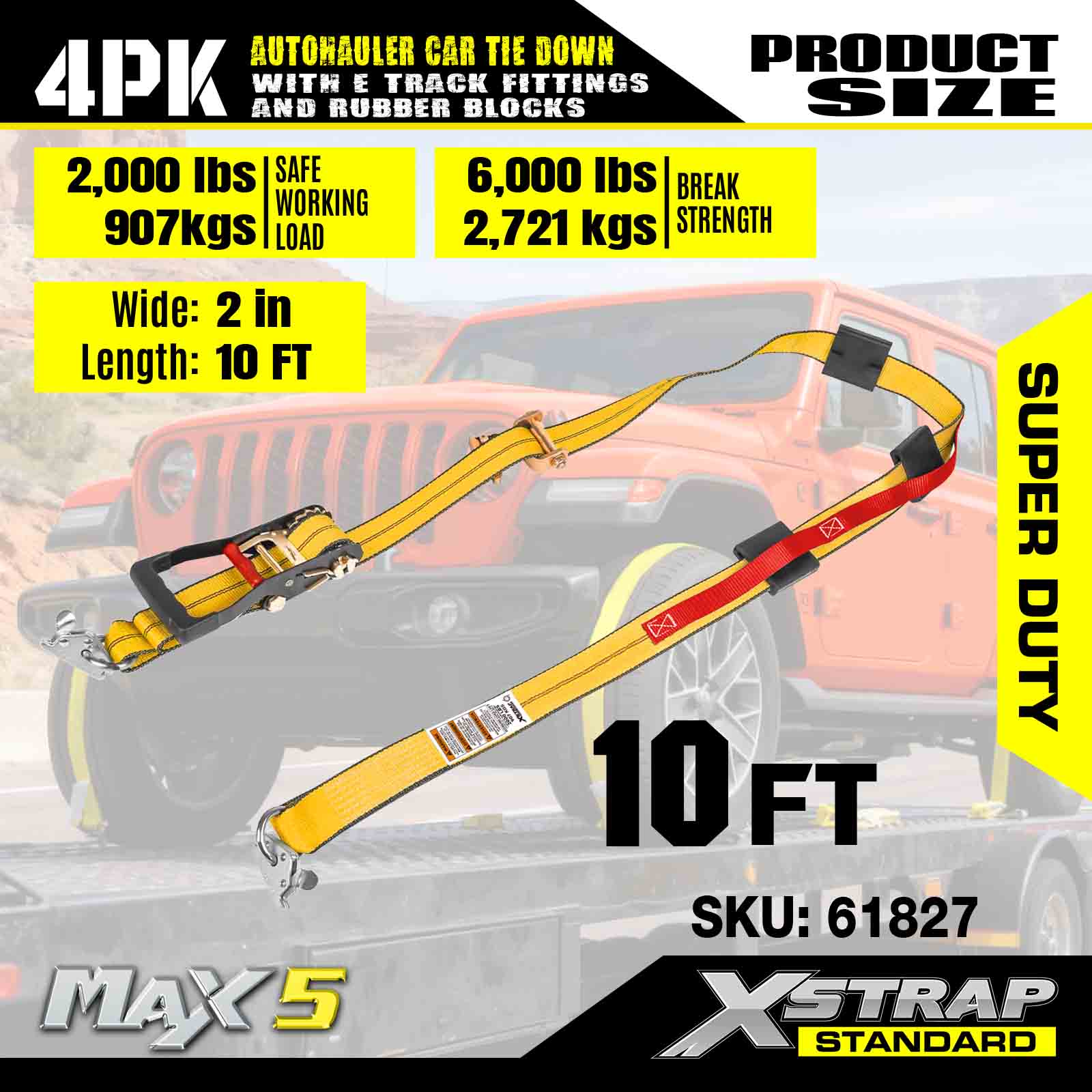 أشرطة إطارات Xstrap E Track للمقطورة شديدة التحمل مقاس 2 بوصة × 10 بوصات حزام نقل تلقائي - 6000 رطل قوة كسر مضمونة - (4) طقم ربط ممتاز للمركبة مع كتل مطاطية لربط العجلات للشاحنة، UTV