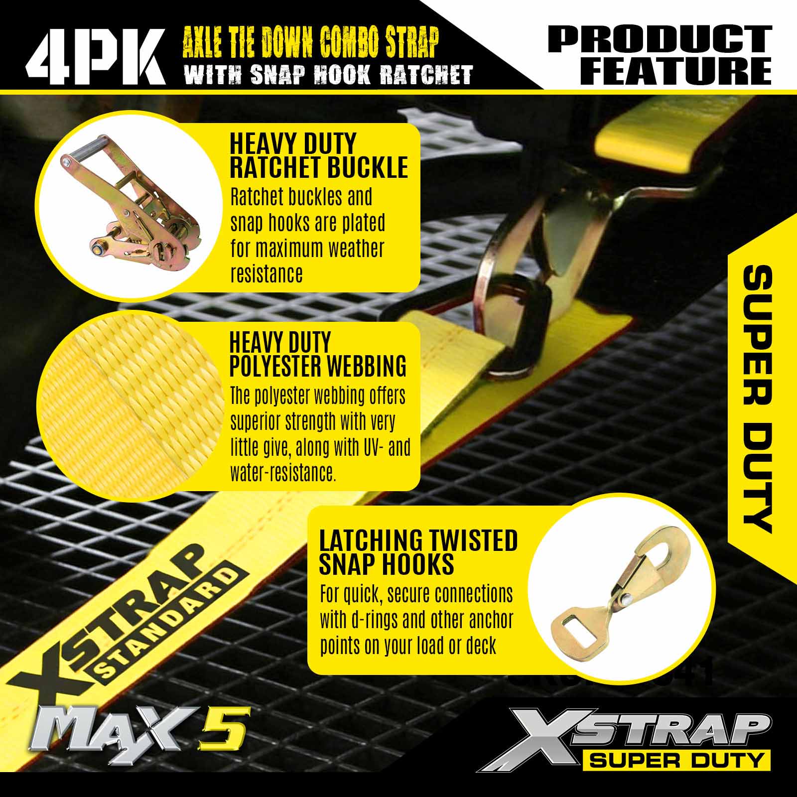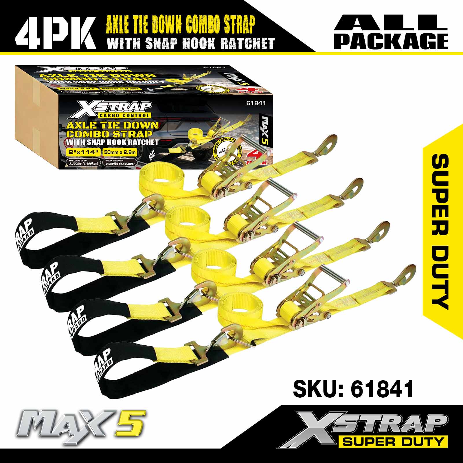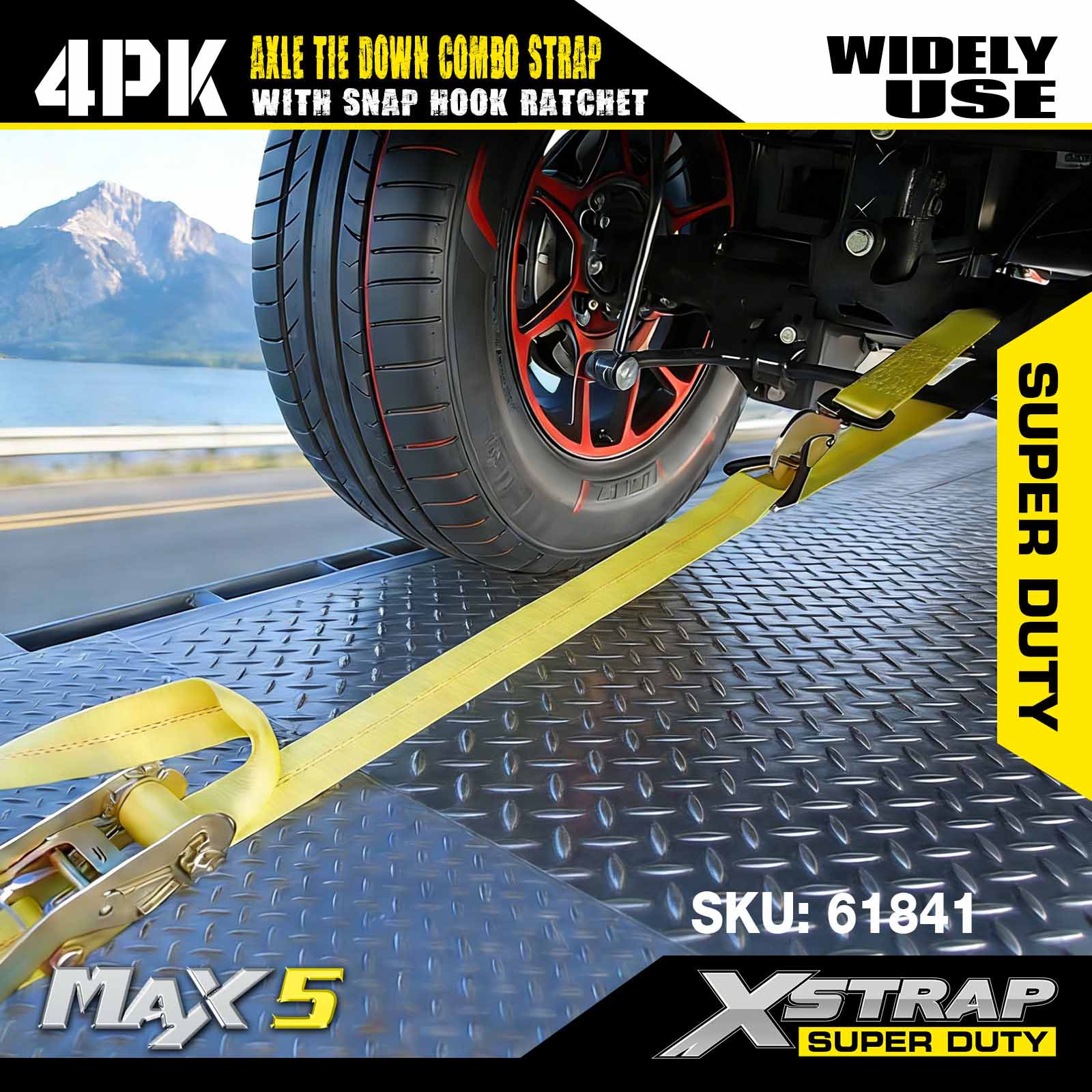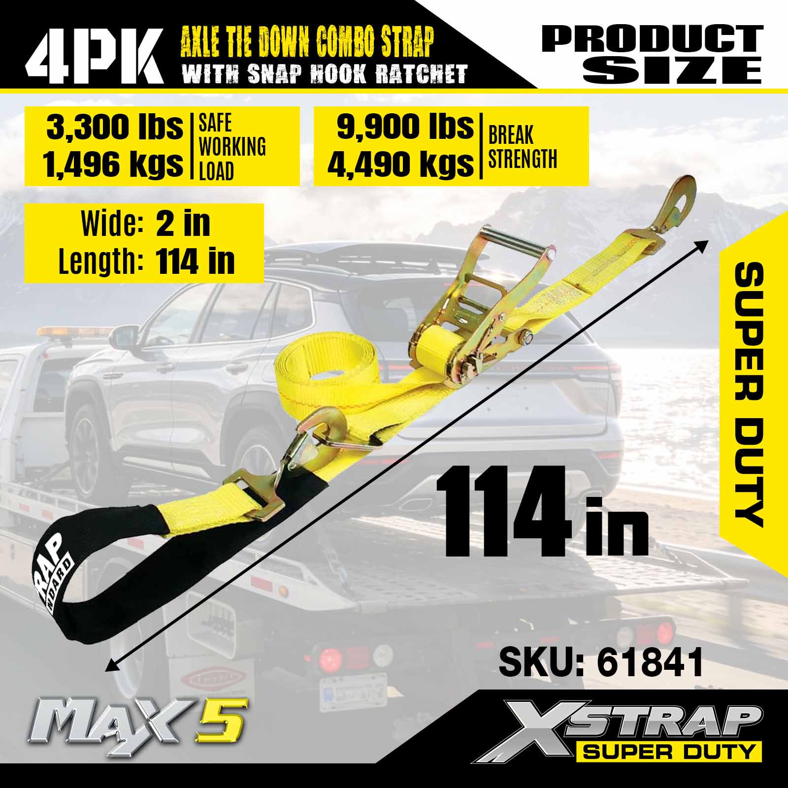 - 4 عبوات من أحزمة المحور مقاس 114 بوصة: يتم استخدام ربط تلقائي متعدد الاستخدامات للمرور عبر حواف السيارة المنقولة، كما يمكن تثبيتها على أي جزء صلب من العجلة أو المحور أو الإطار.