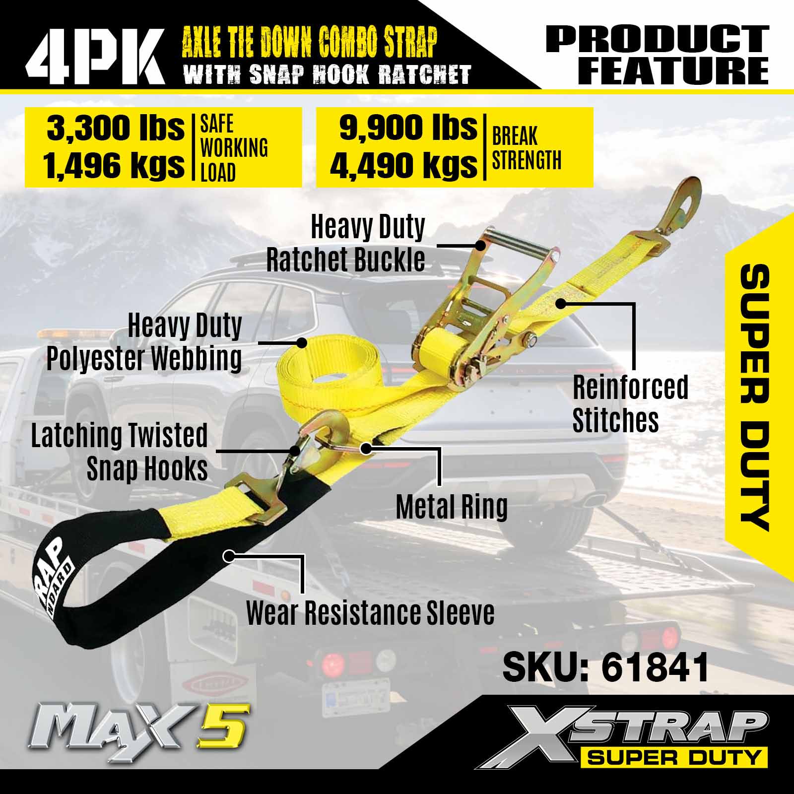 - ربطات عنق سهلة وآمنة للمركبة: تتميز أحزمة العجلات بتغطية واسعة بمقدار 2 بوصة لتقليل الاحتكاك ومصنوعة من مادة البوليستر الصناعية المطلية بالأشعة فوق البنفسجية ومقاومة التآكل لتحقيق أقصى قوة سحب.. تم اختبارها في المعمل مع حمل عمل آمن يبلغ 3300 رطل وقوة كسر تبلغ 10000 رطل.