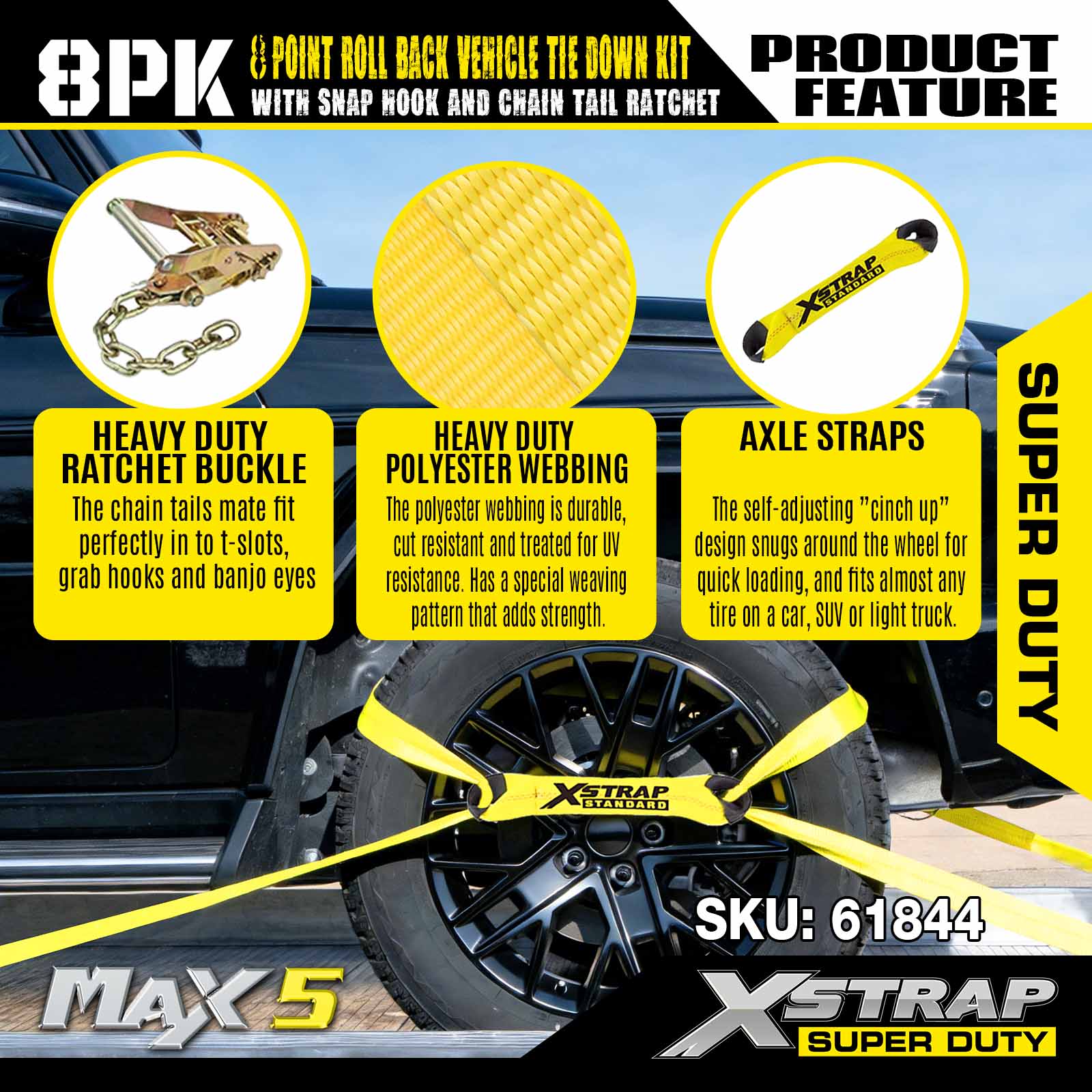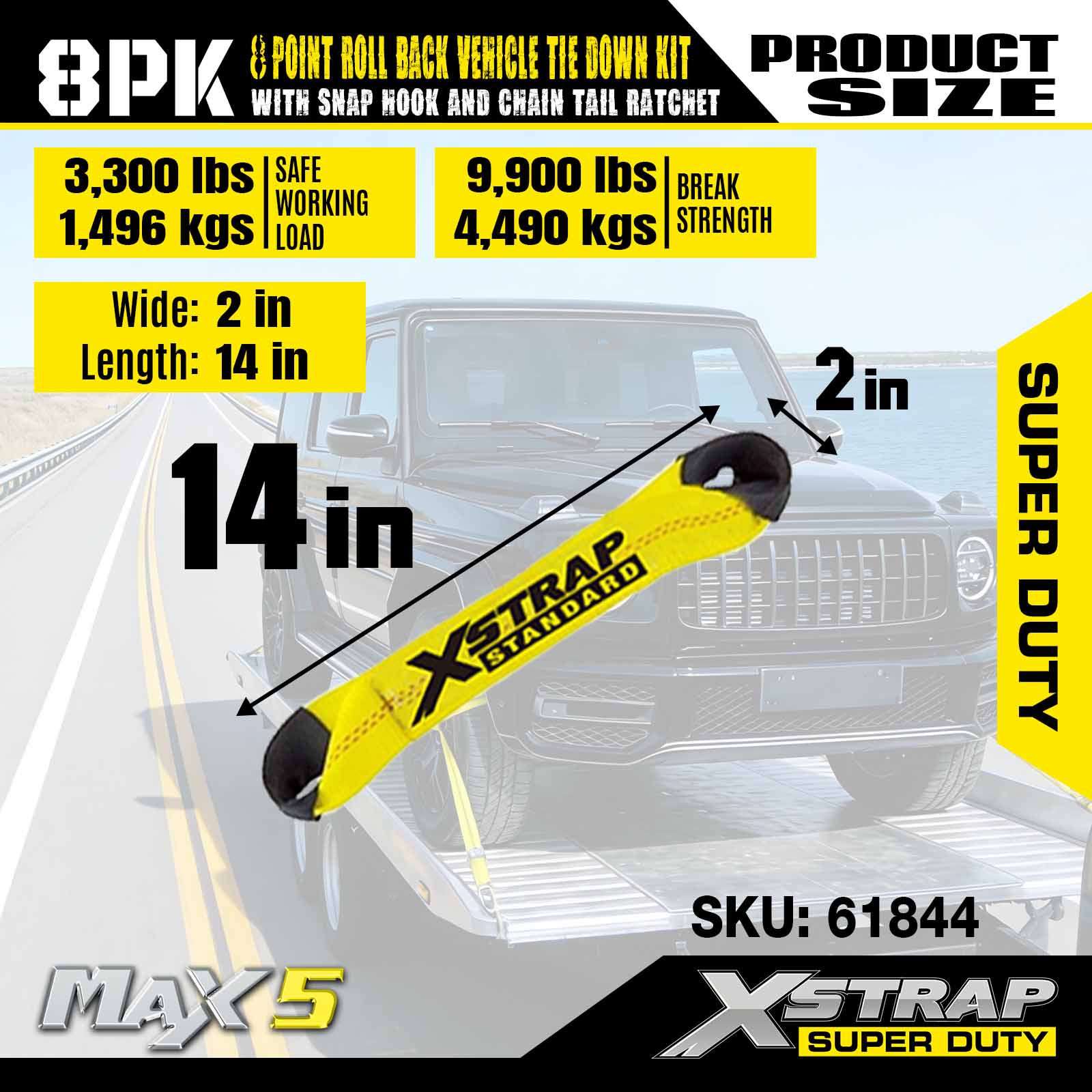 مجموعة أدوات ربط السيارة للخلف ذات 8 نقاط من Xstrap مع خطافات كبس وسقاطة ذيل سلسلة على كلا الطرفين - مجموعة من 4 - أصفر كلاسيكي