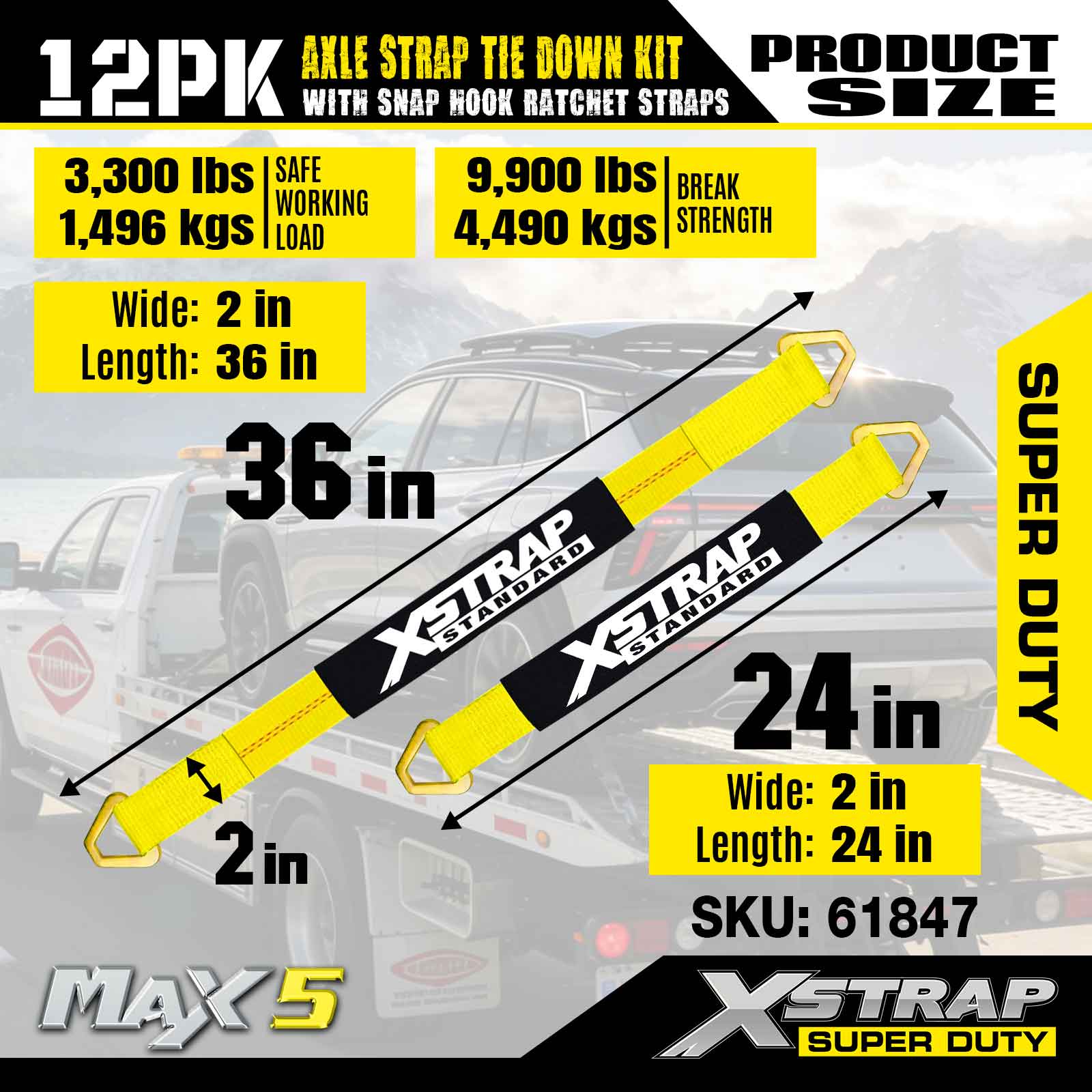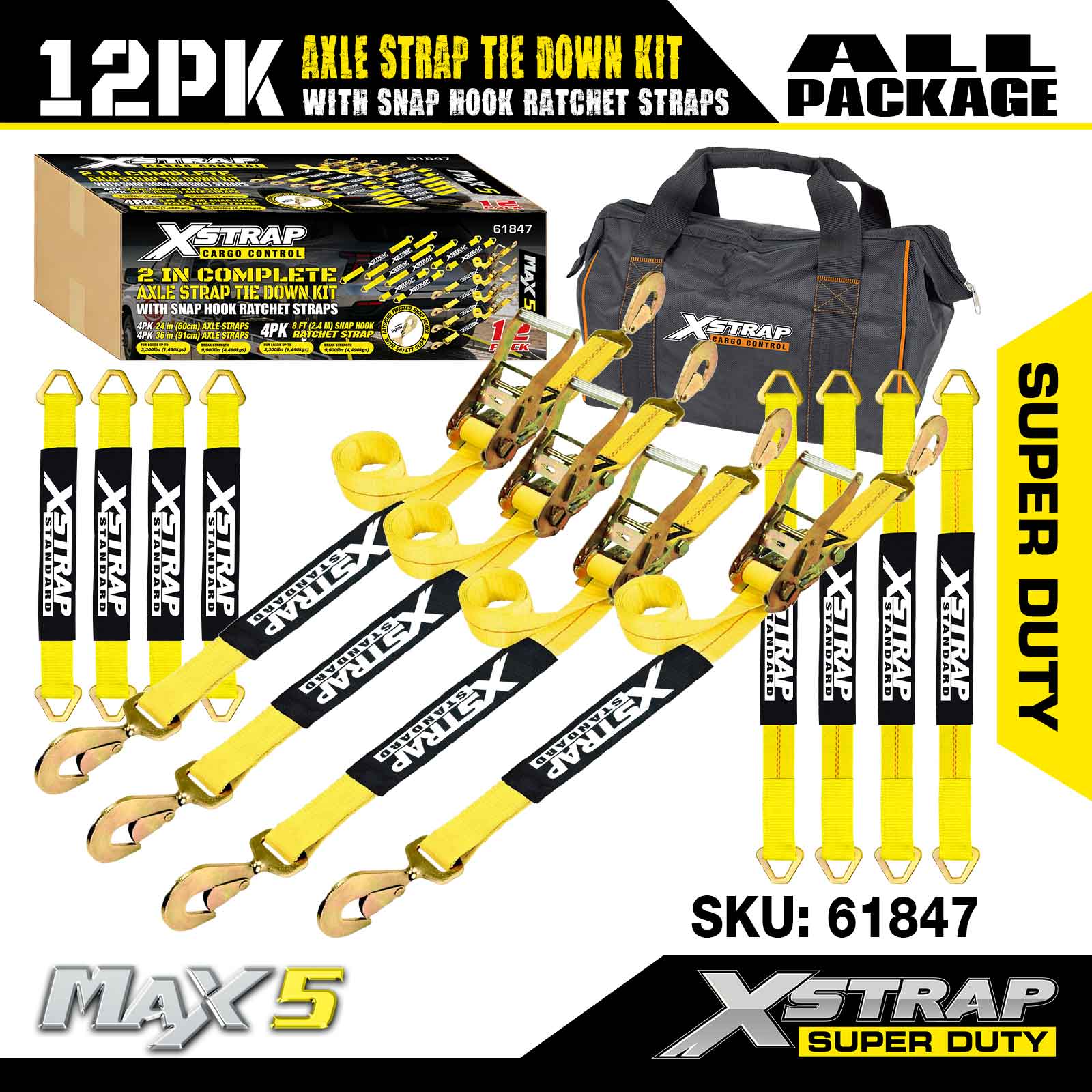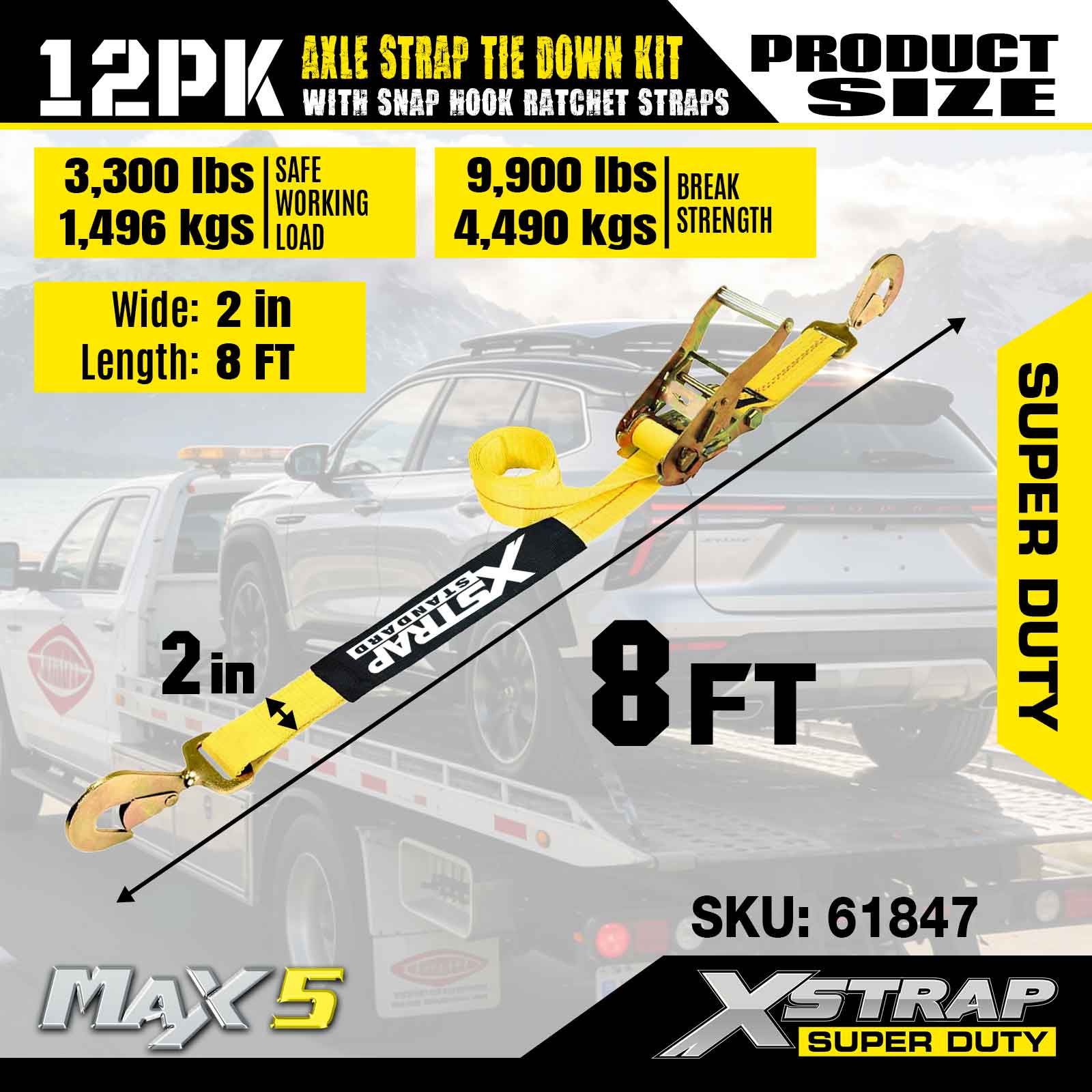 مجموعة ربط حزام المحور Xstrap 12PK (مع أشرطة سقاطة بخطاف سريع) - فائقة التحمل. لديها حمل عمل آمن يبلغ 3,300 رطل (1,496 كجم) وقوة كسر تبلغ 10,000 رطل (4,490 كجم).