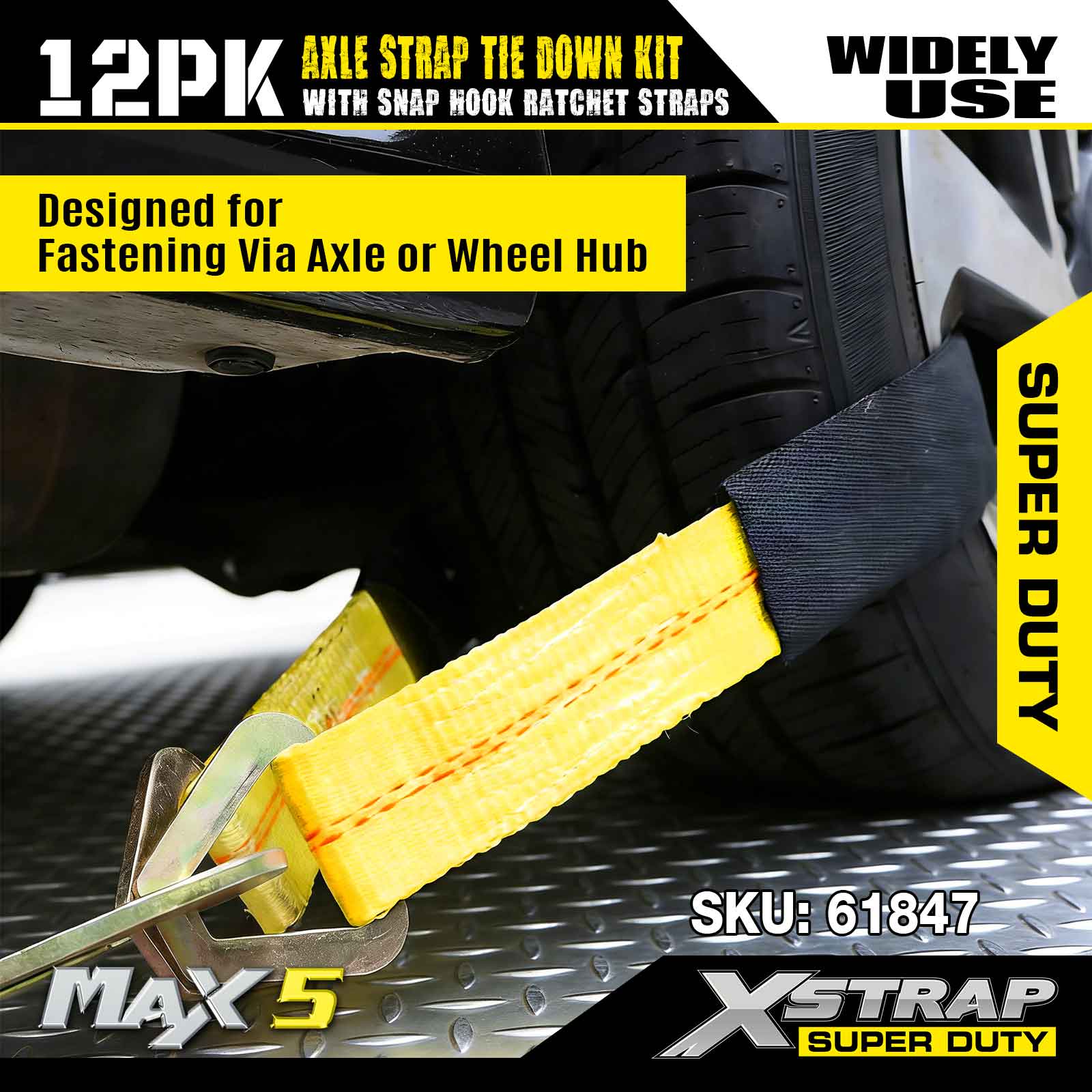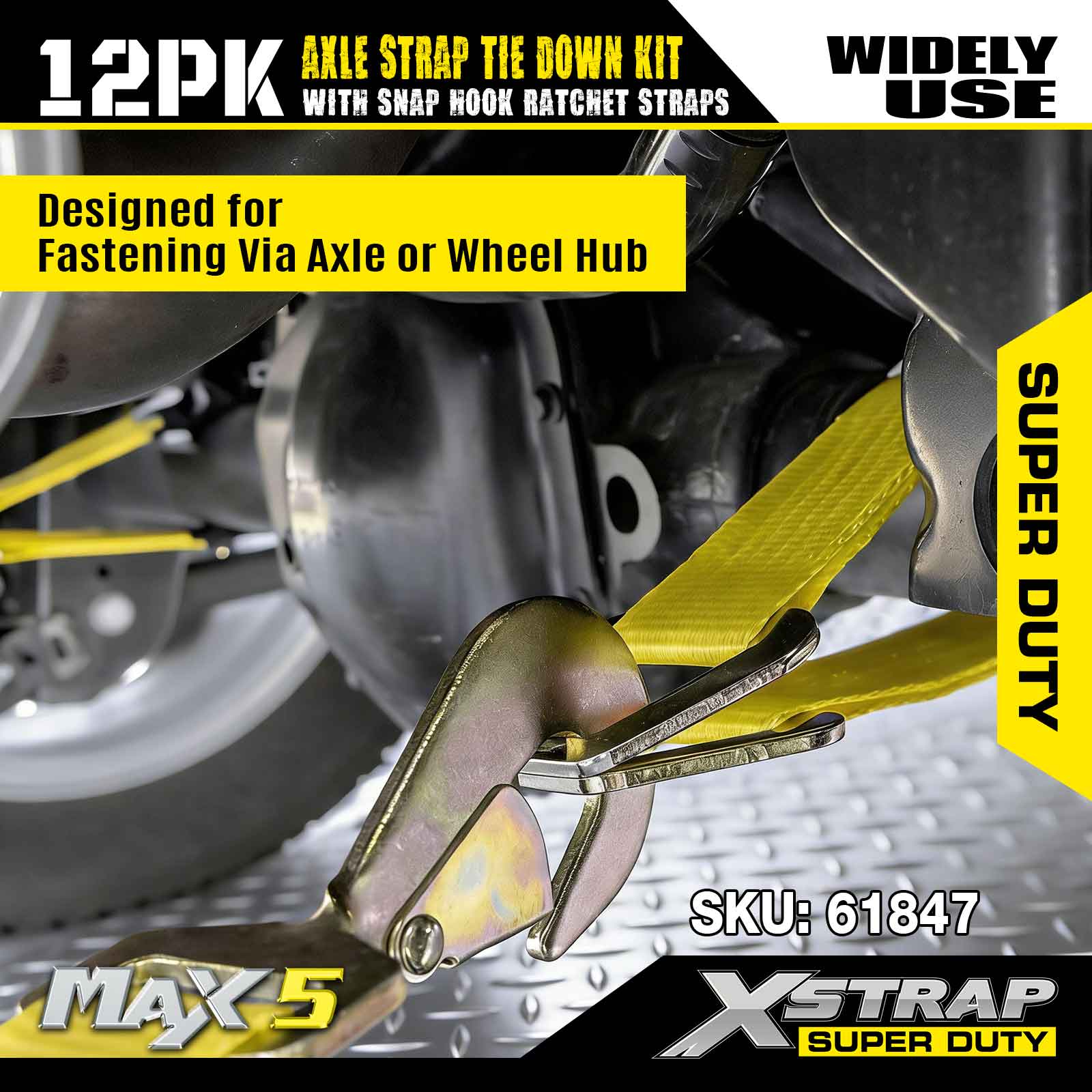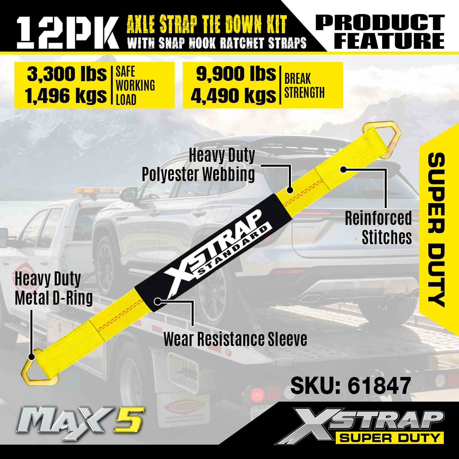 مجموعة ربط حزام المحور Xstrap 12PK (مع أشرطة سقاطة بخطاف سريع) - فائقة التحمل. لديها حمل عمل آمن يبلغ 3,300 رطل (1,496 كجم) وقوة كسر تبلغ 10,000 رطل (4,490 كجم).
