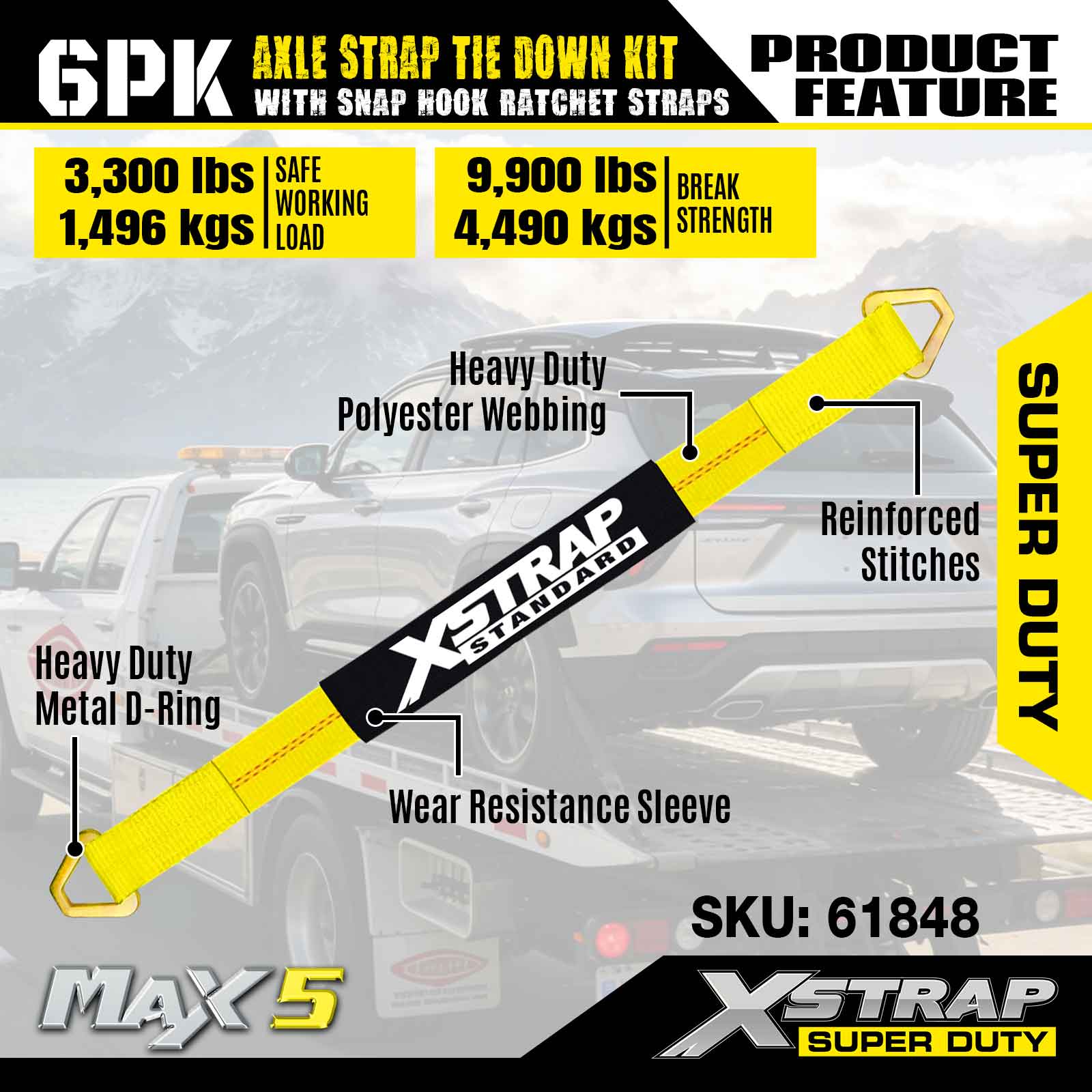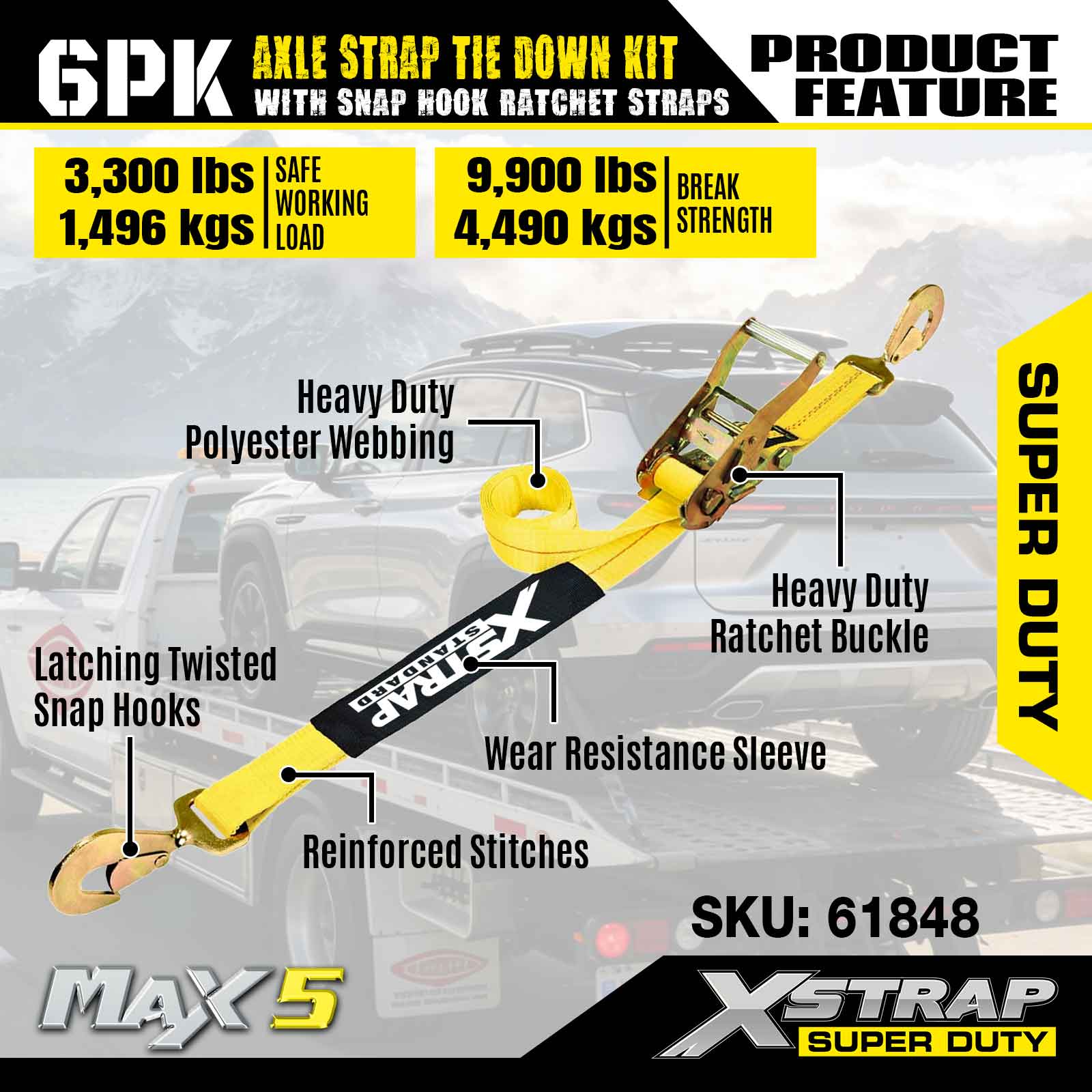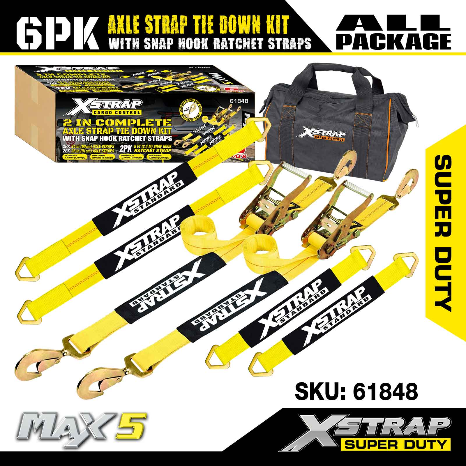 طقم ربط حزام المحور 6PK من Xstrap (مع أشرطة ربط بسقاطة) - فائق التحمل. لديها حمل عمل آمن يبلغ 3,300 رطل (1,496 كجم) وقوة كسر تبلغ 9,900 رطل (4,490 كجم).