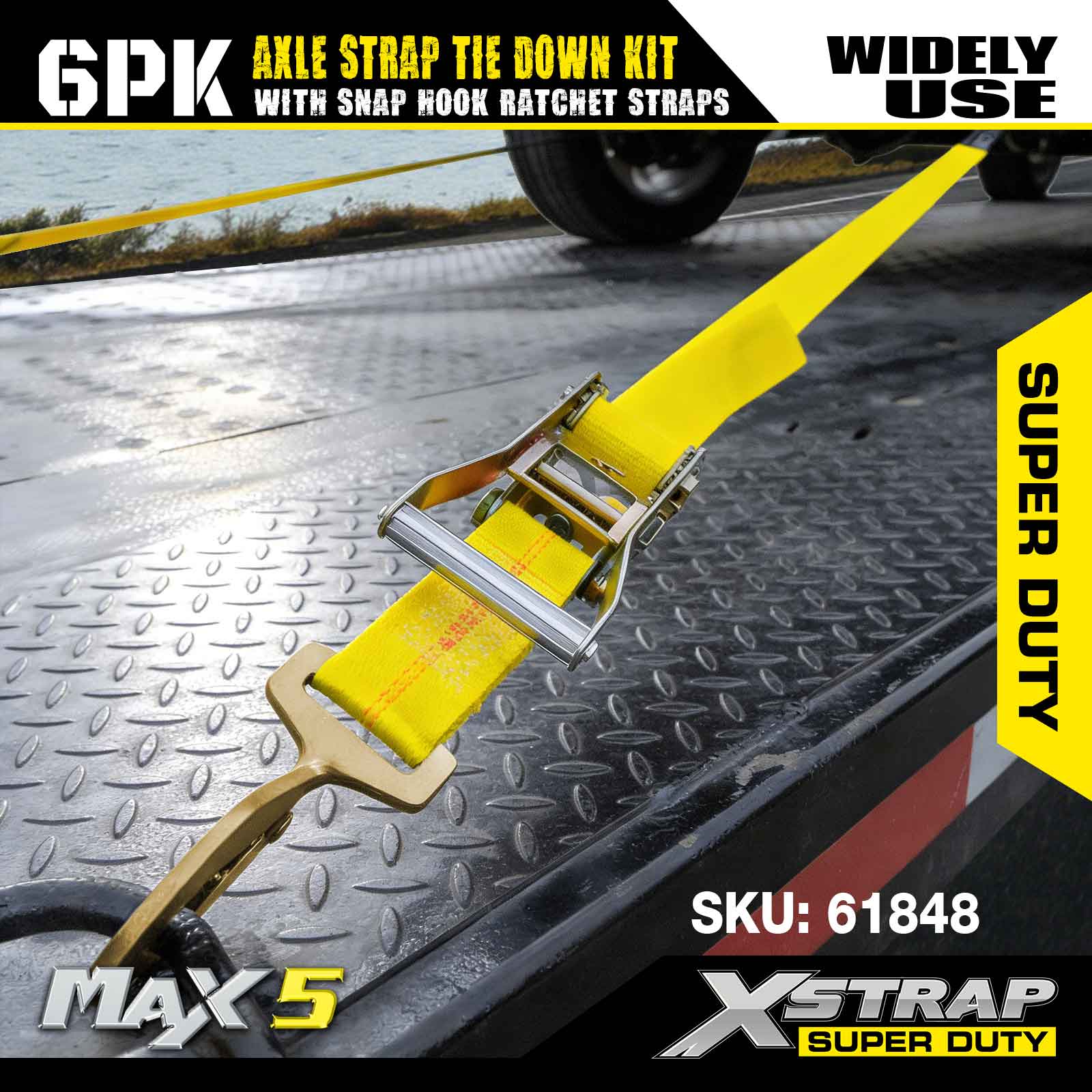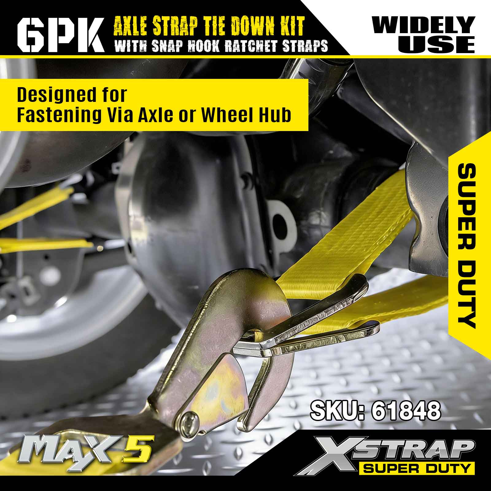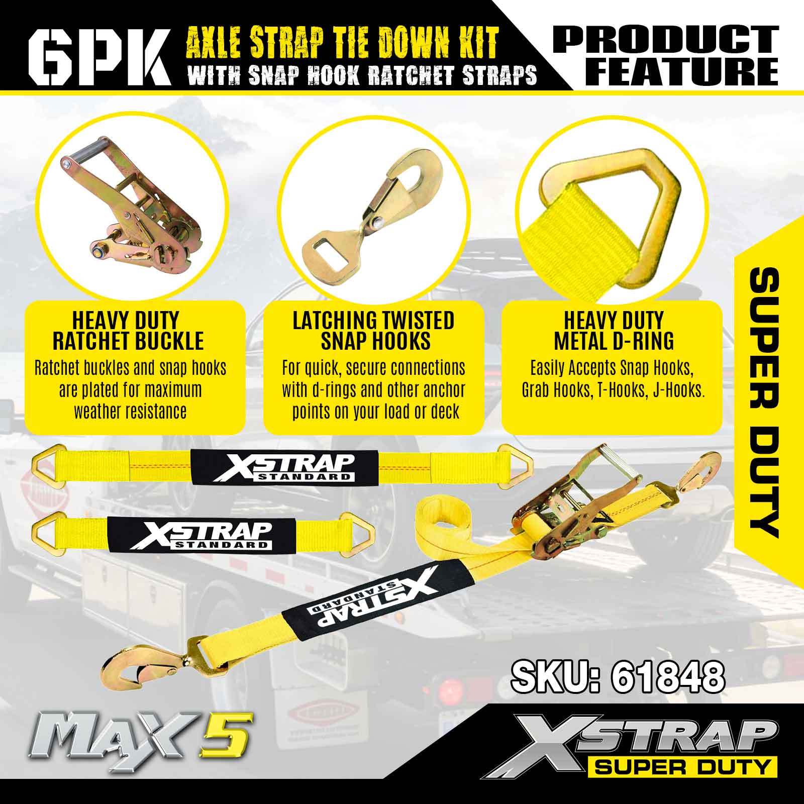 طقم ربط حزام المحور 6PK من Xstrap (مع أشرطة ربط بسقاطة) - فائق التحمل. لديها حمل عمل آمن يبلغ 3,300 رطل (1,496 كجم) وقوة كسر تبلغ 9,900 رطل (4,490 كجم).