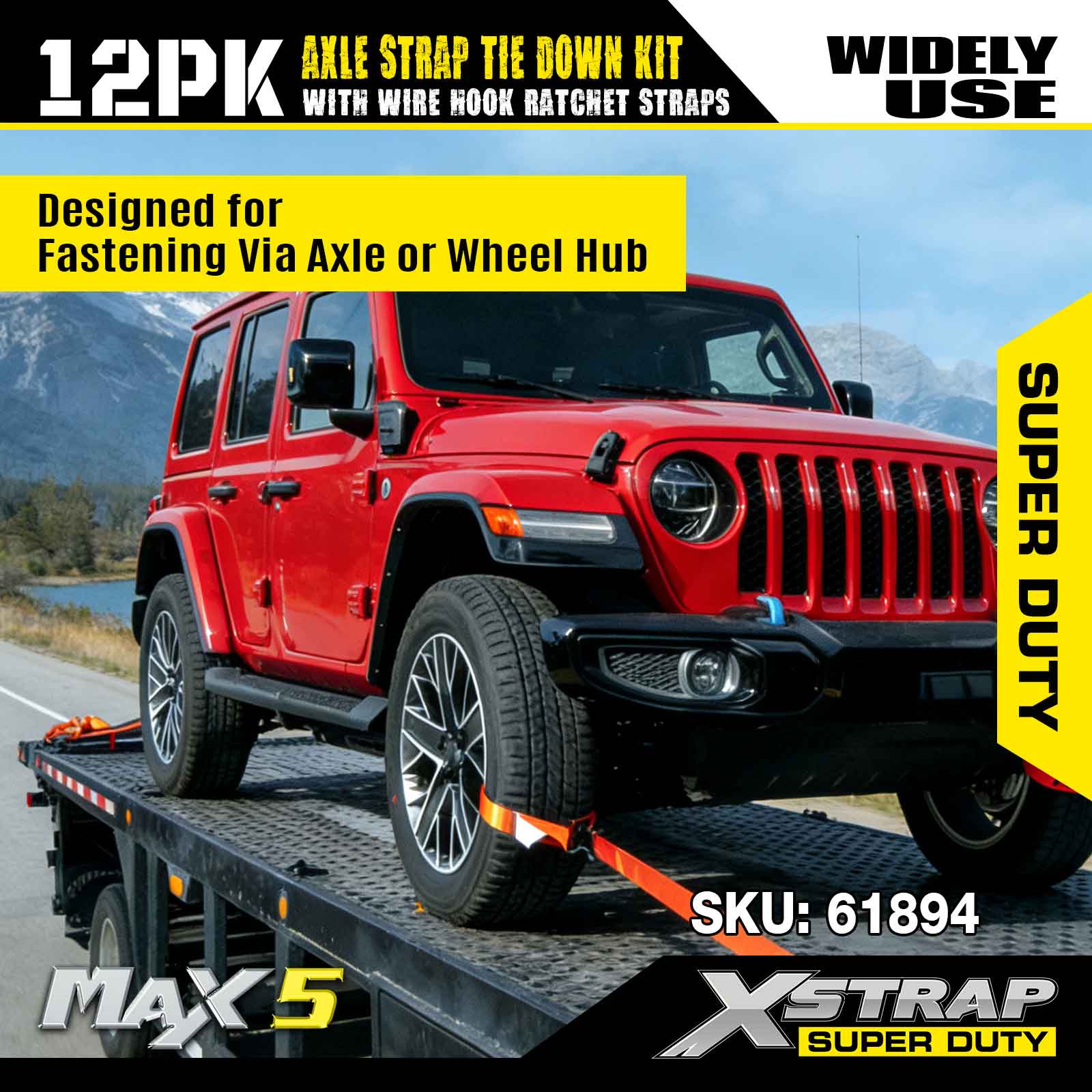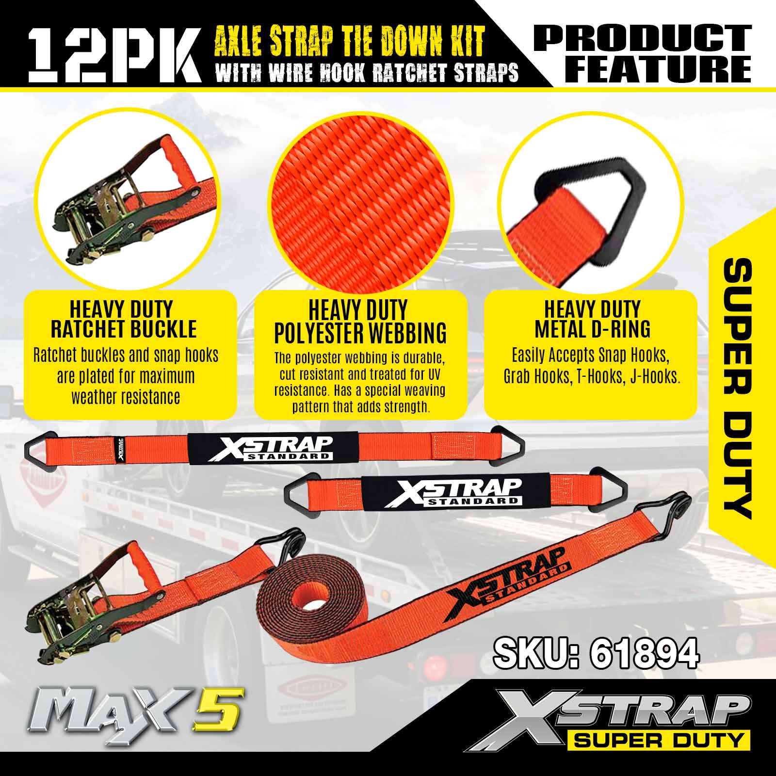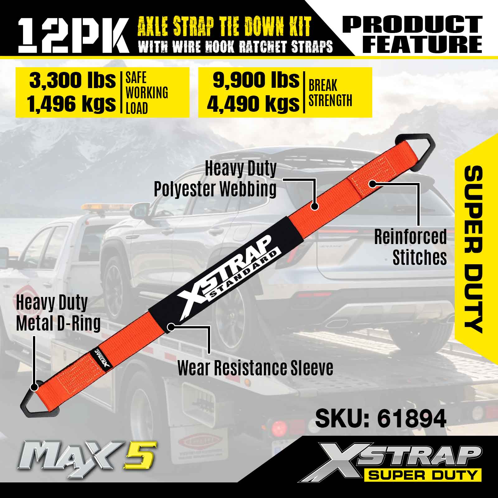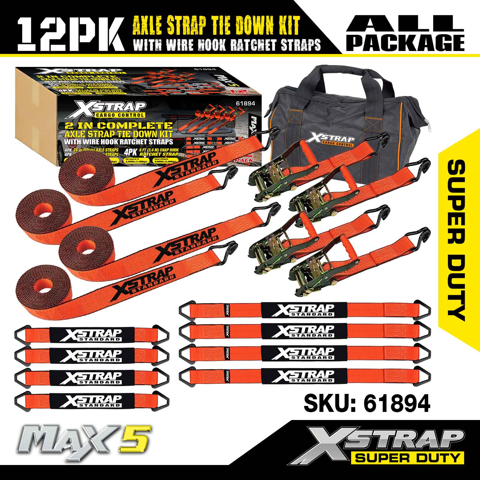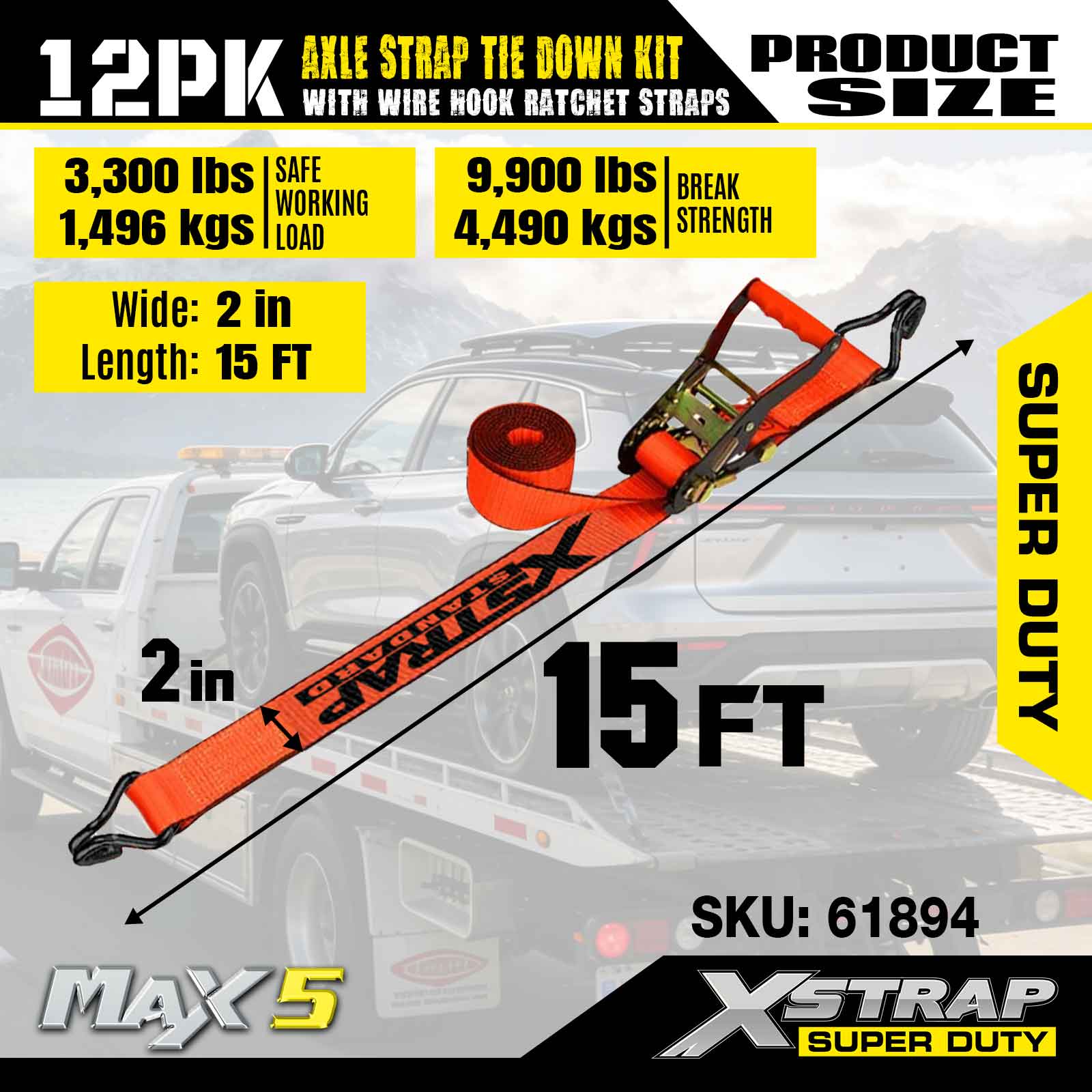 مجموعة ربط حزام المحور 12PK من Xstrap (مع أشرطة سقاطة سلكية) - فائقة التحمل. لديها حمل عمل آمن يبلغ 3,300 رطل (1,496 كجم) وقوة كسر تبلغ 9,900 رطل (4,490 كجم).