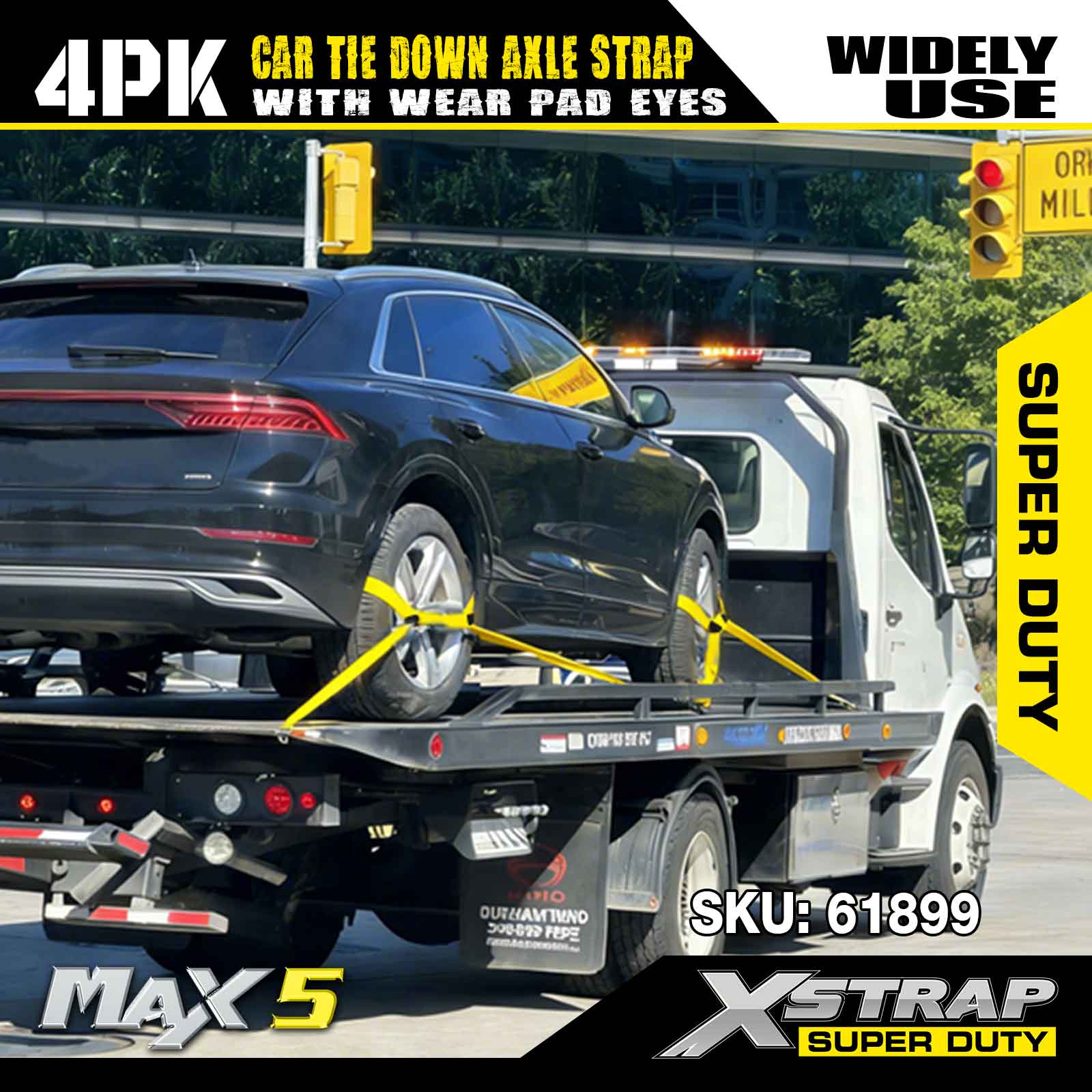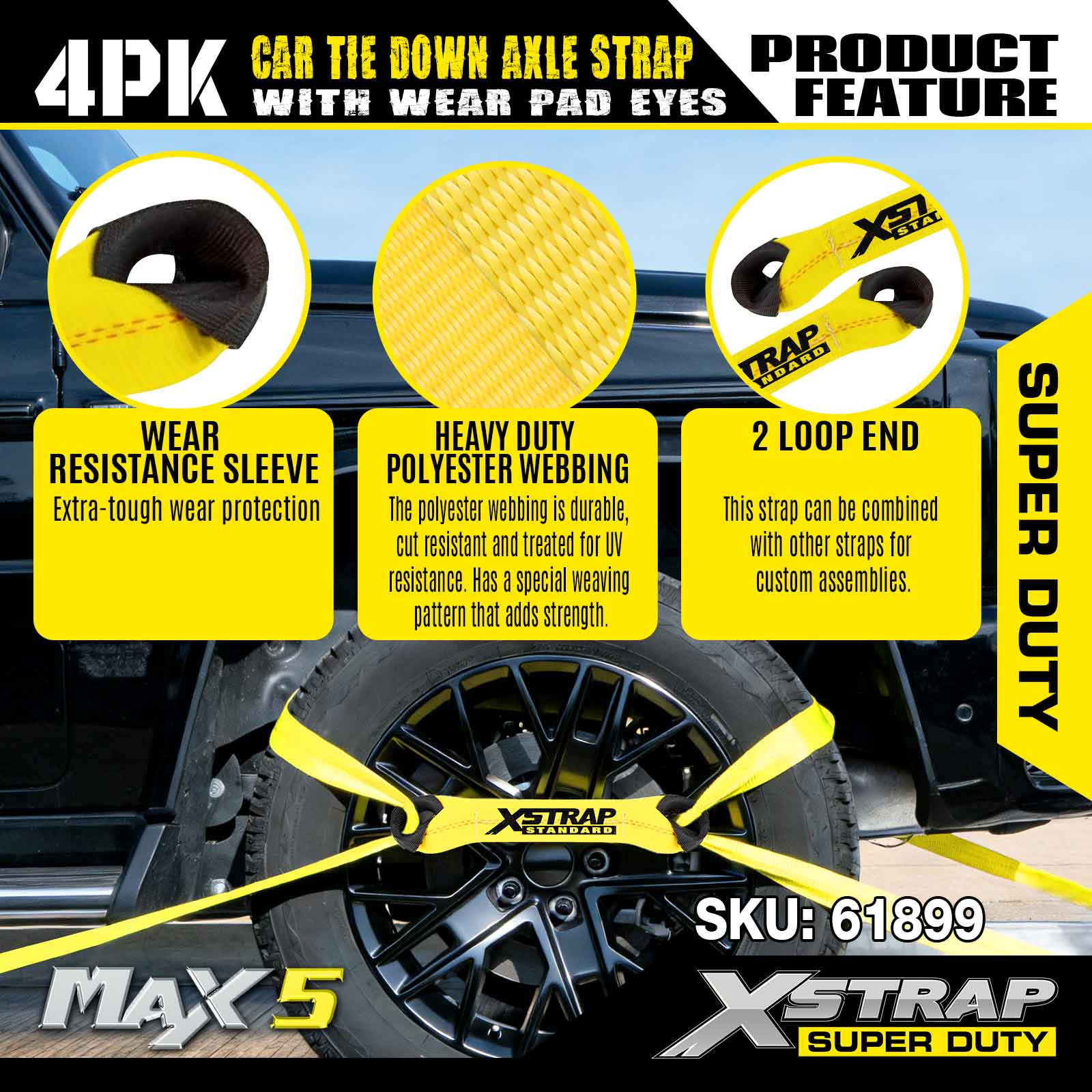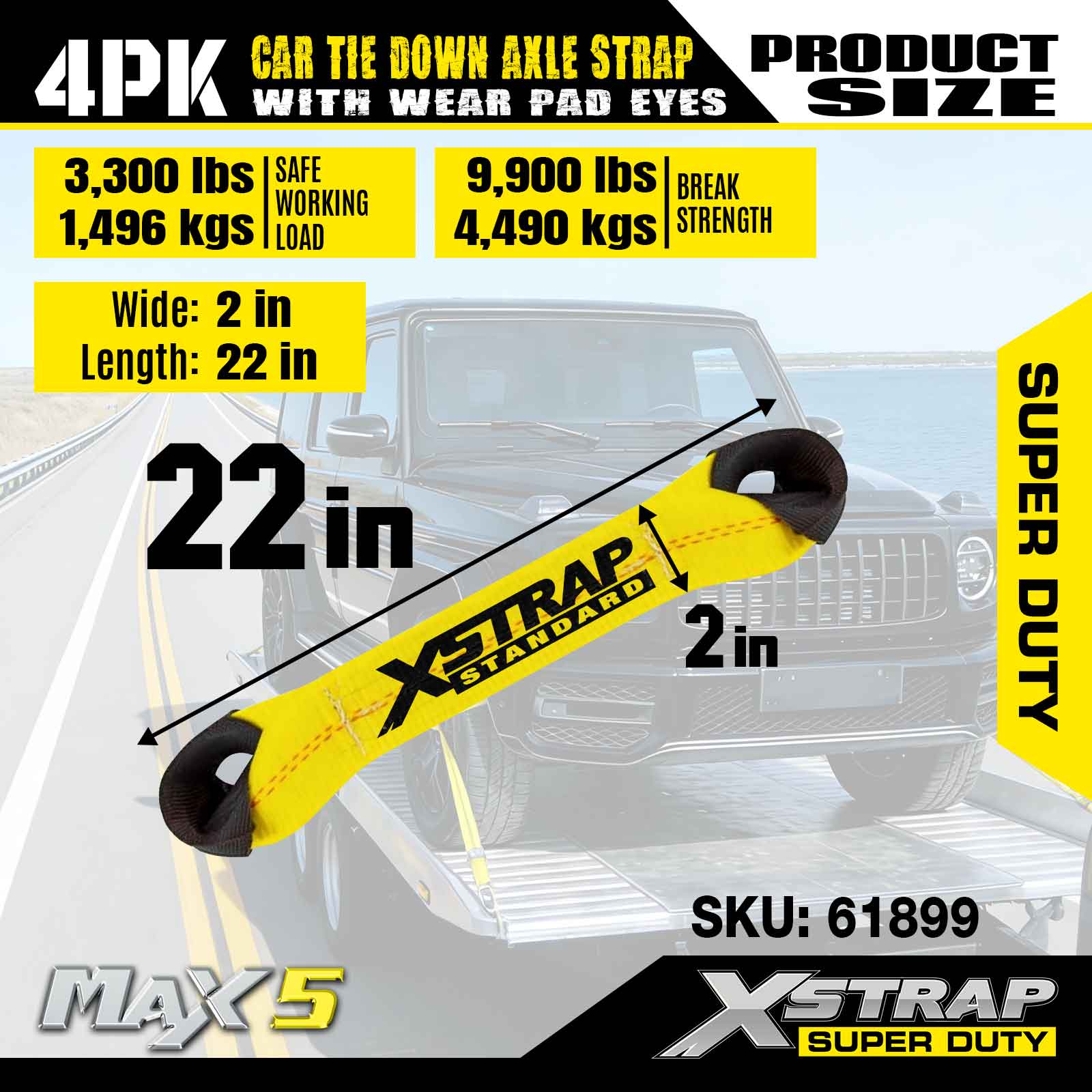 حزام محور السيارة Xstrap 4PK (مع عيون وسادة الارتداء) - فائق التحمل. لديها حمل عمل آمن يبلغ 3,300 رطل (1,496 كجم) وقوة كسر تبلغ 9,900 رطل (4,490 كجم).