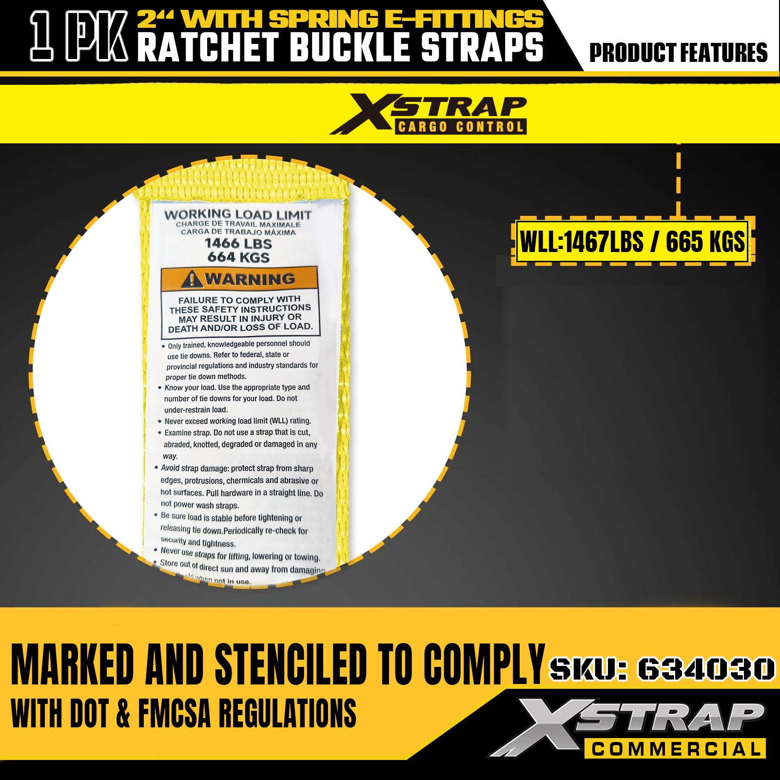 - علامات أمان واضحة: يتم تمييز كل حزام بوضوح بحمل العمل الآمن (SWL) الذي يبلغ 1467 رطلاً وقوة الكسر القصوى البالغة 4401 رطلاً، مما يوفر معلومات السلامة الأساسية لضمان الاستخدام السليم والآمن في سيناريوهات التحكم في البضائع والحركة والنقل.