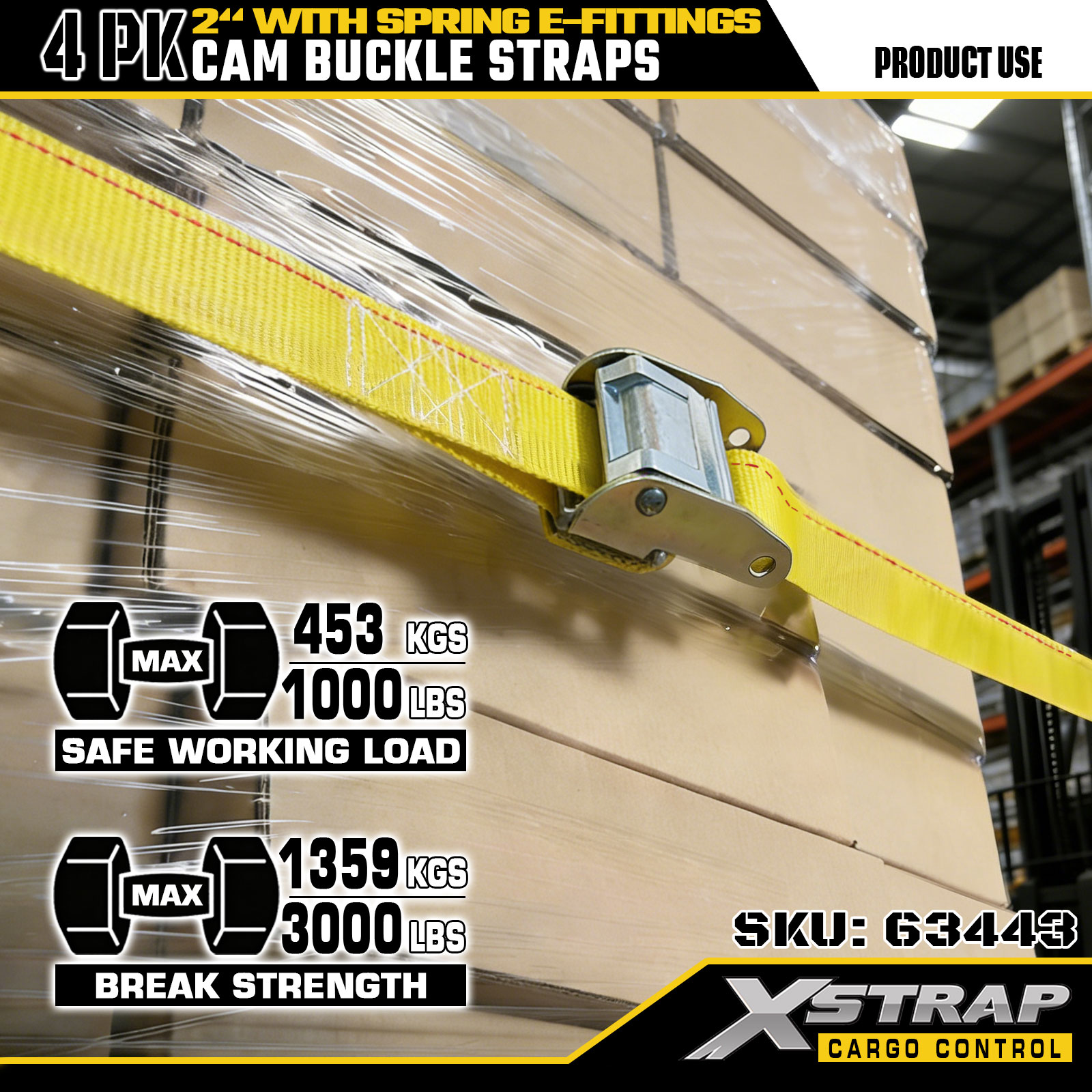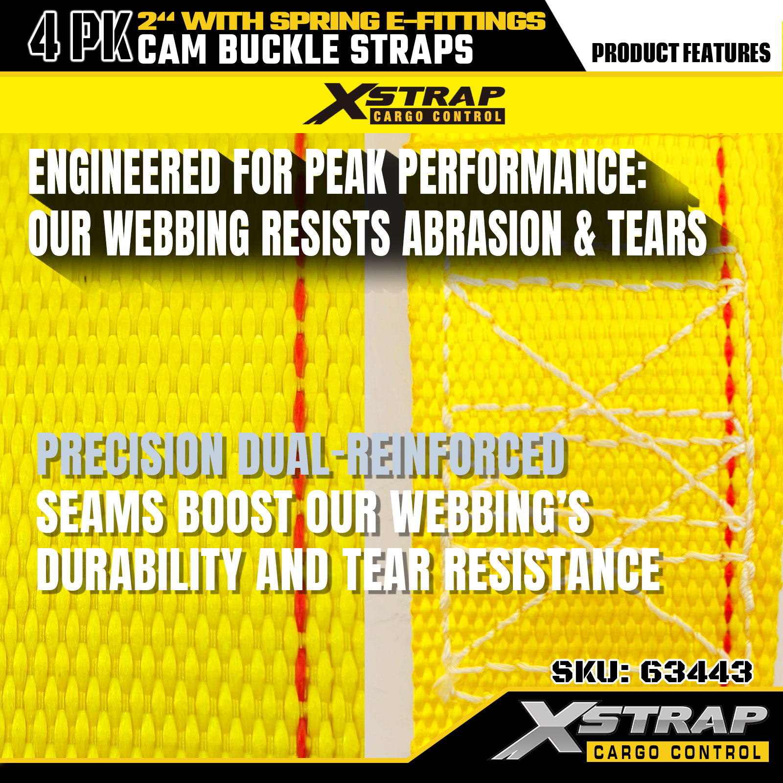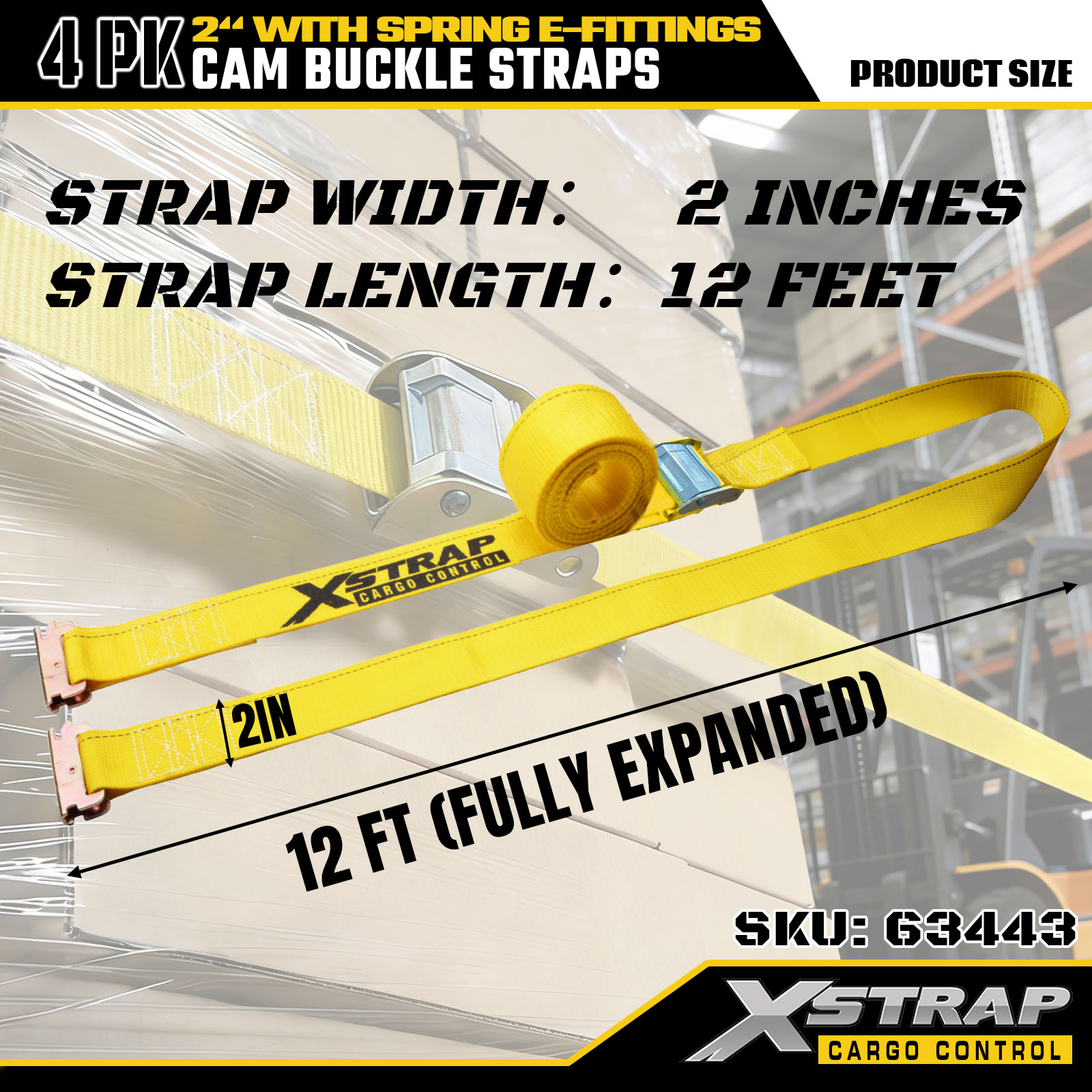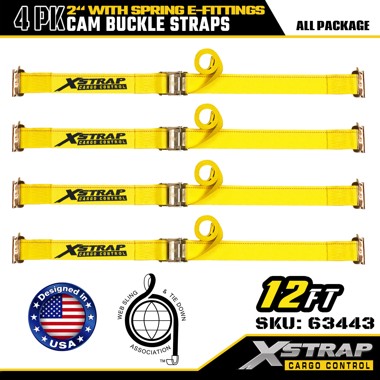 Xstrap 63443 4 حزم 2 × 12 بوصة أشرطة مشبك كام صفراء مع تركيبات زنبركية، 1000 رطل SWL و453 رطل قوة كسر للتعامل مع البضائع ونقلها وعبورها
