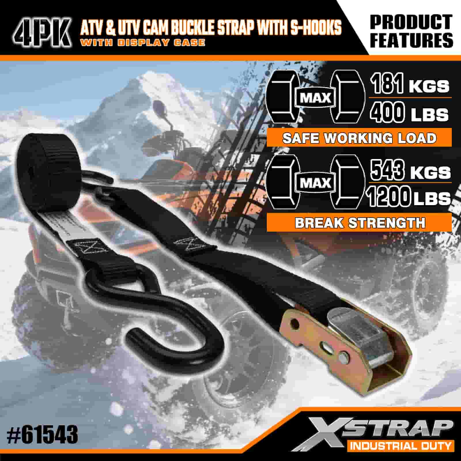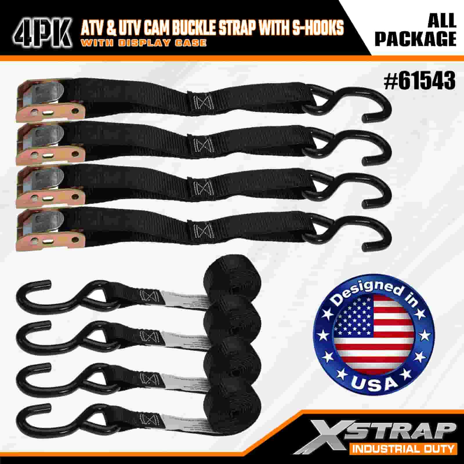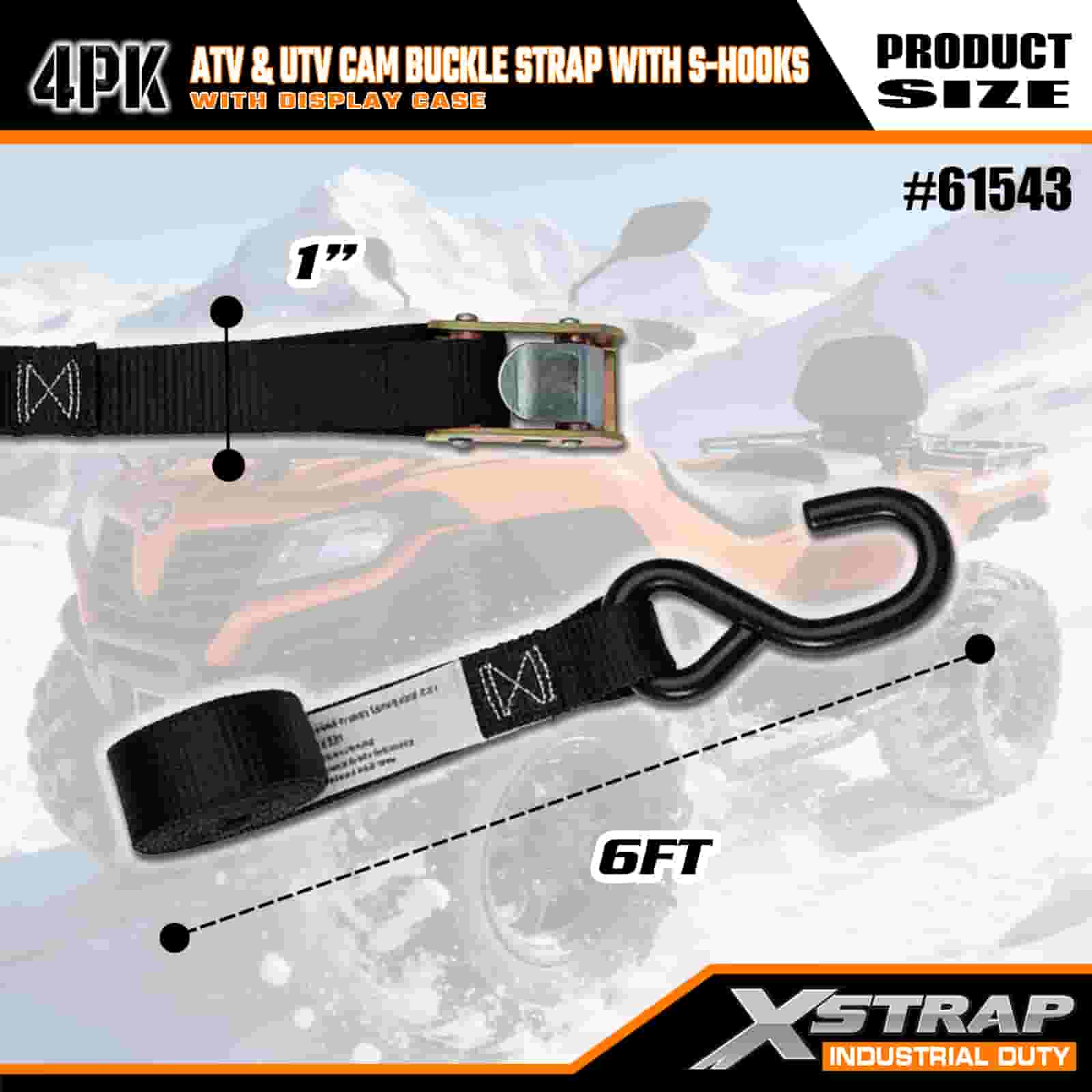 حزام مشبك Xstrap 4PK ATV وAUV مع خطافات S، حزام ربط سفلي من البوليستر مقاس 1 × 6 بوصات، حزام إبزيم بسقاطة، أشرطة تثبيت لربط البضائع بسعة 400 رطل مع خطاف على شكل S للمحترفين الجديين لتأمين مقطورة البضائع، ومقطورة السرير المسطحة، وقارب التزلج، والسيارة الصغيرة.