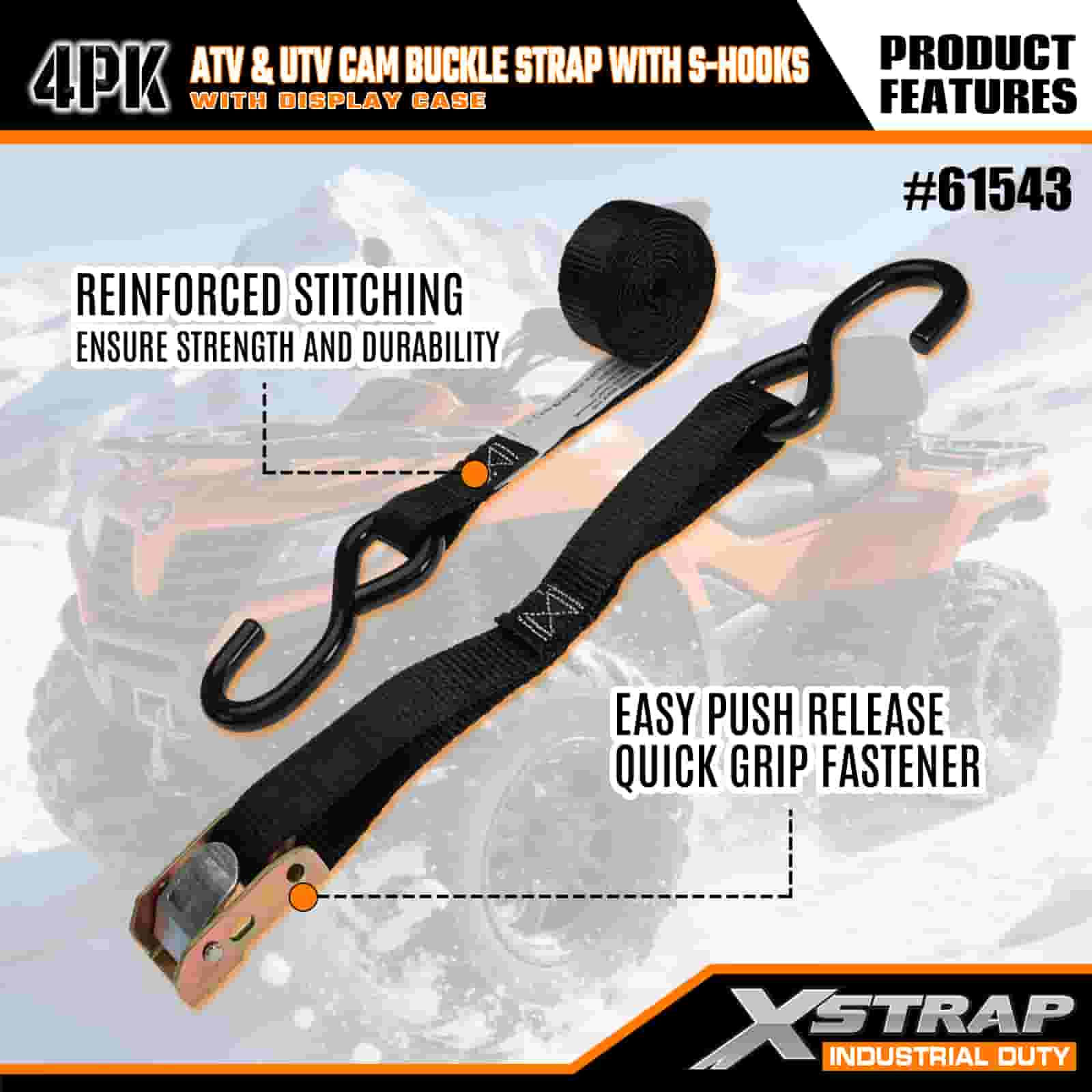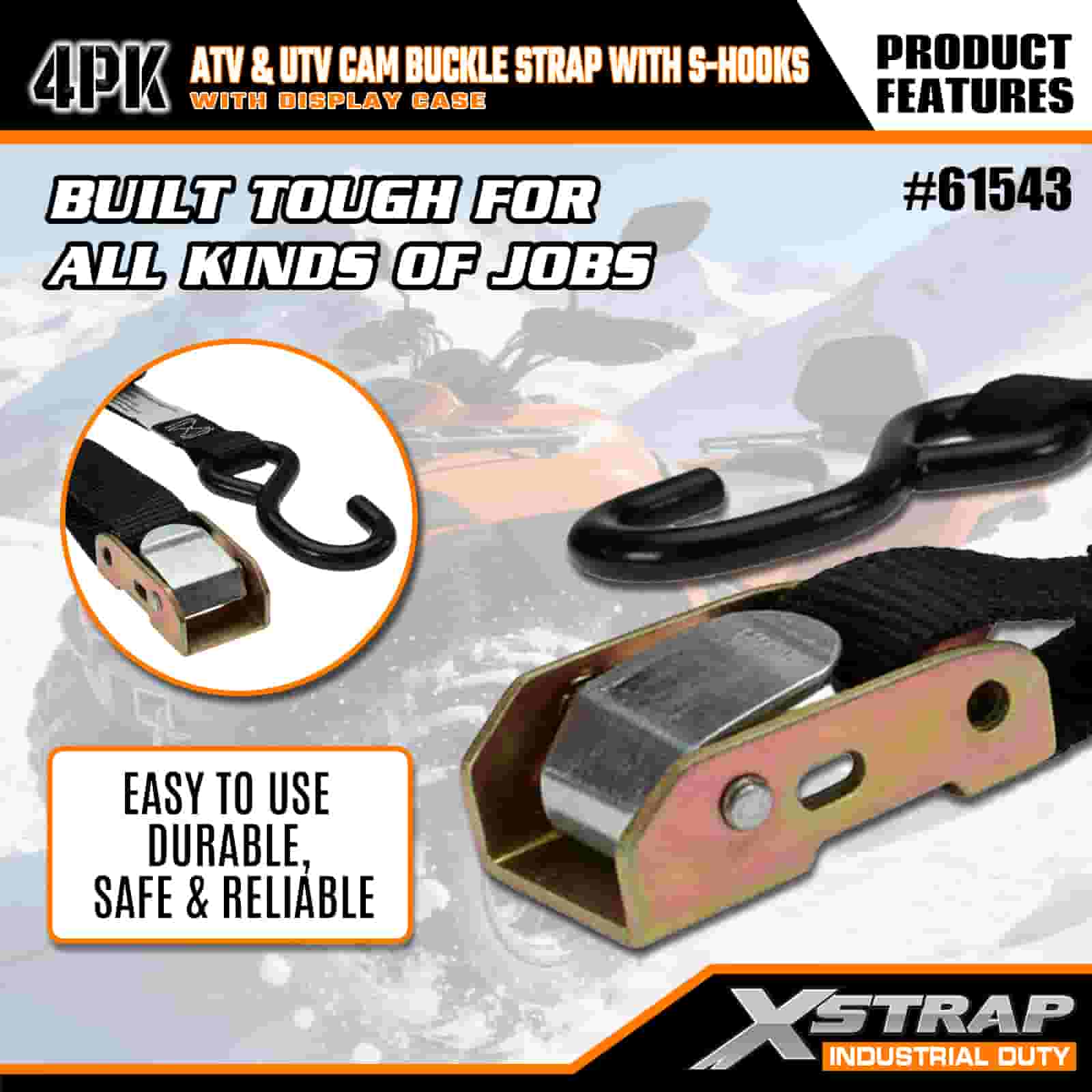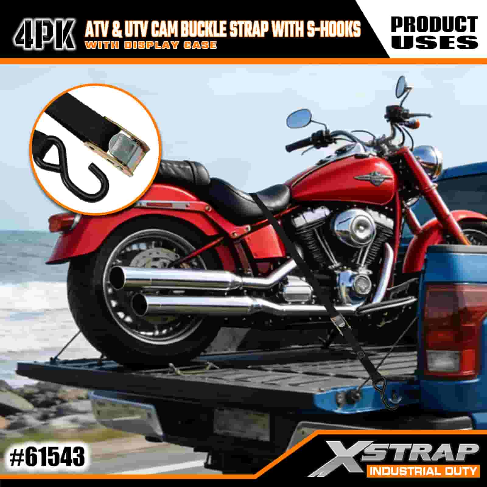 حزام مشبك Xstrap 4PK ATV وAUV مع خطافات S، حزام ربط سفلي من البوليستر مقاس 1 × 6 بوصات، حزام إبزيم بسقاطة، أشرطة تثبيت لربط البضائع بسعة 400 رطل مع خطاف على شكل S للمحترفين الجديين لتأمين مقطورة البضائع، ومقطورة السرير المسطحة، وقارب التزلج، والسيارة الصغيرة.