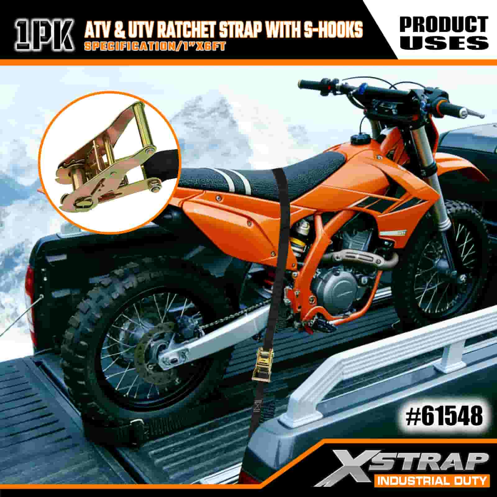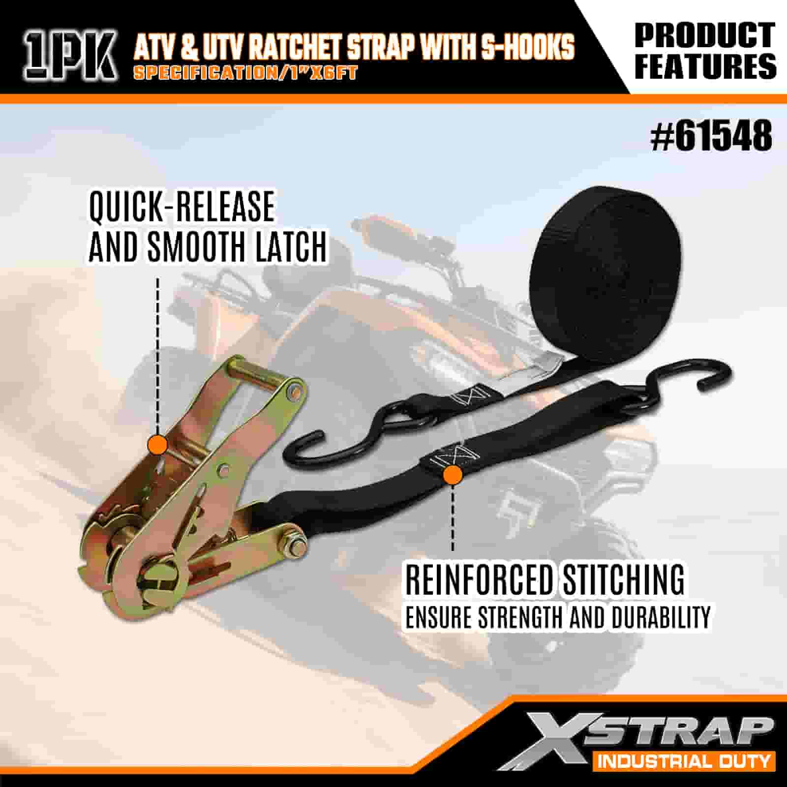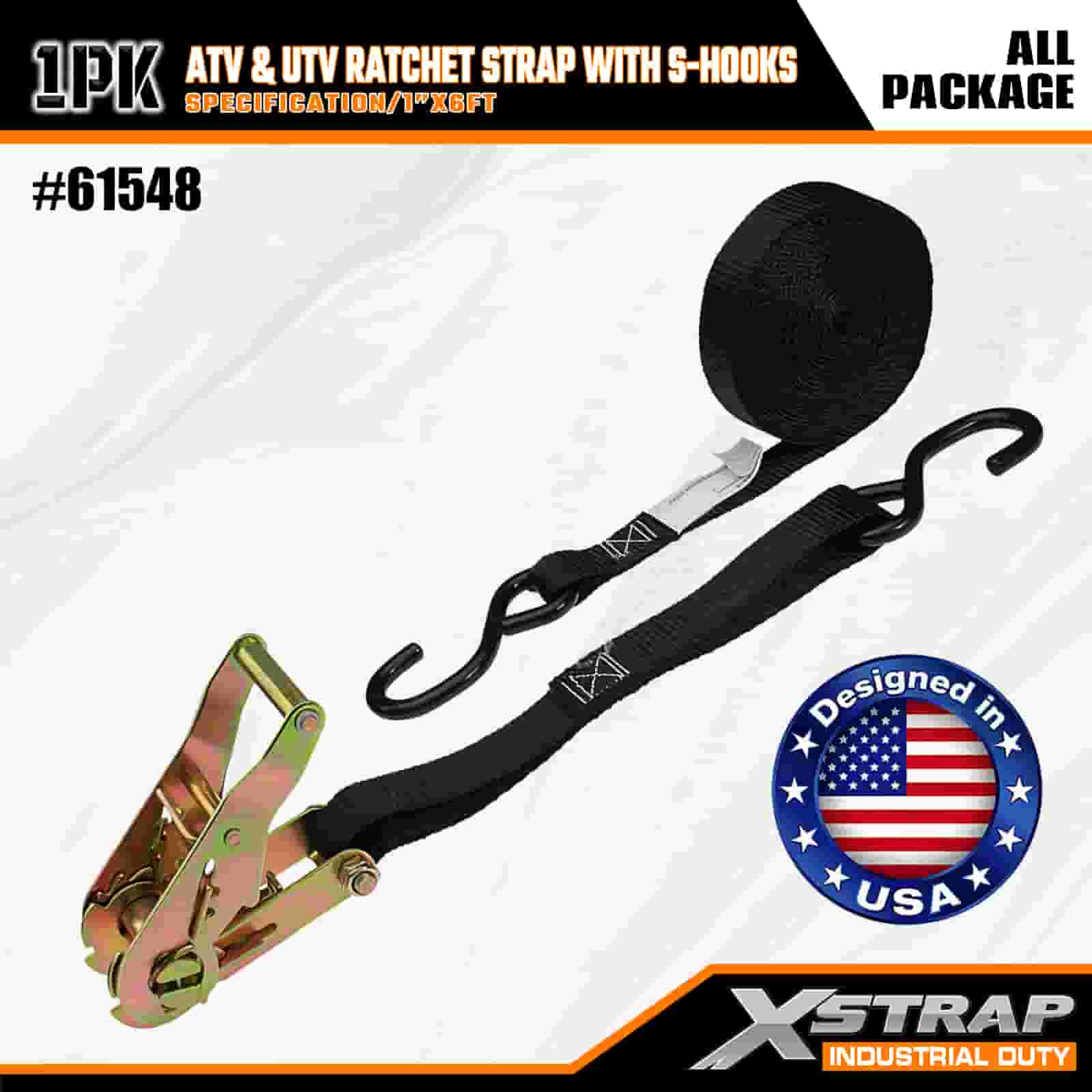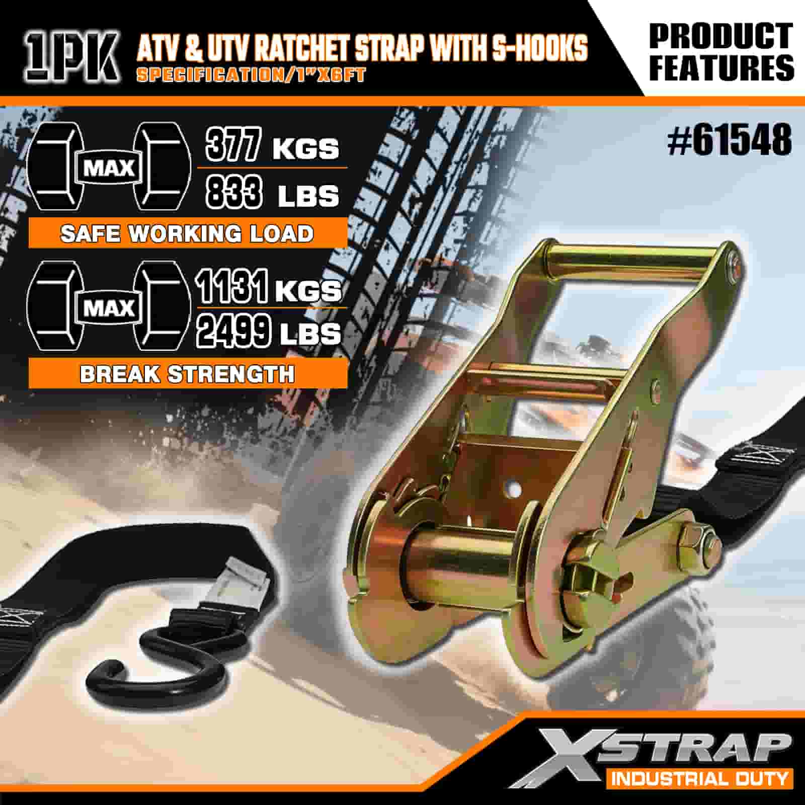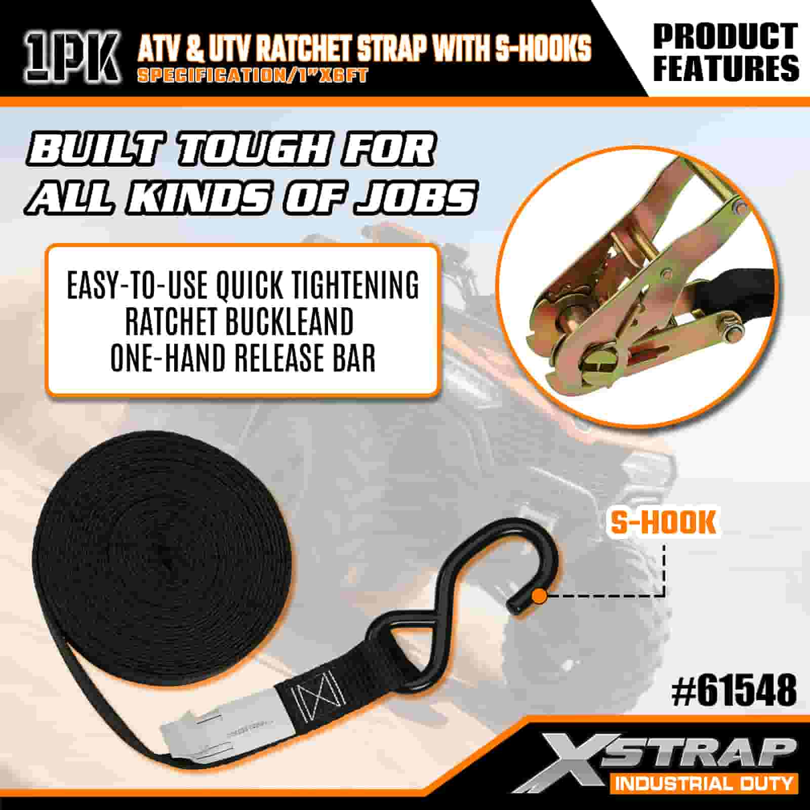حزام سقاطة Xstrap ATV وAUV مع خطافات على شكل S، وحزام سقاطة من البوليستر مقاس 1 × 6 بوصات، وأشرطة تثبيت لربط البضائع بسعة 833 رطلًا مع خطافات على شكل S للمقطورة، وقارب تزلج بمقطورة مسطحة، وسيارة صغيرة، ومعدات ثقيلة.