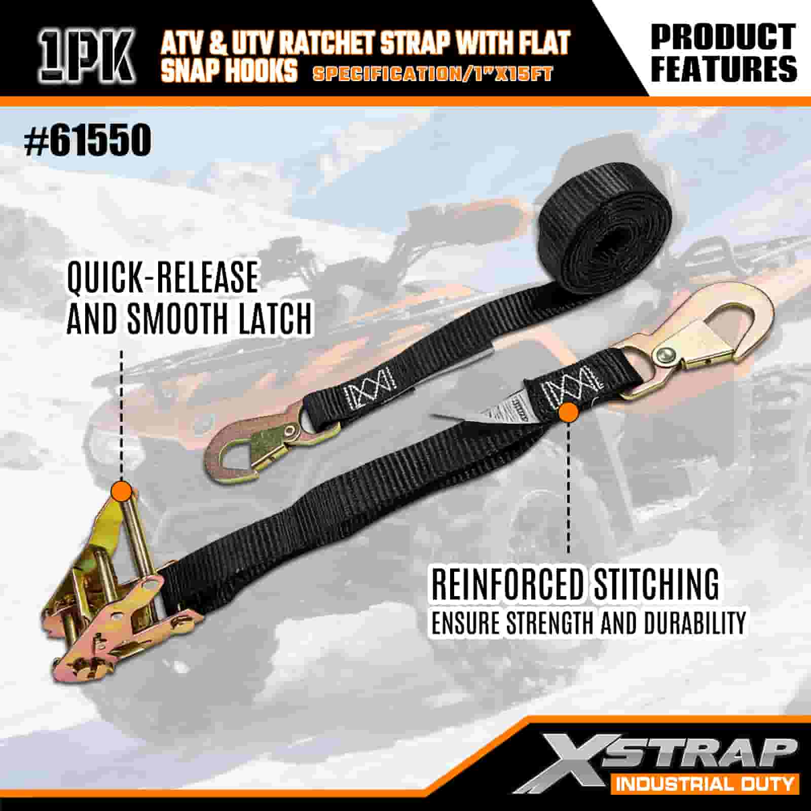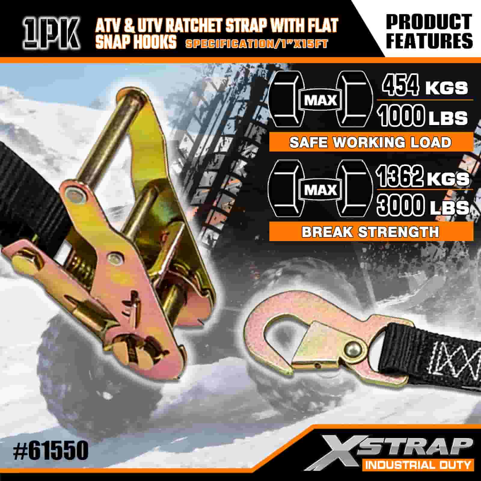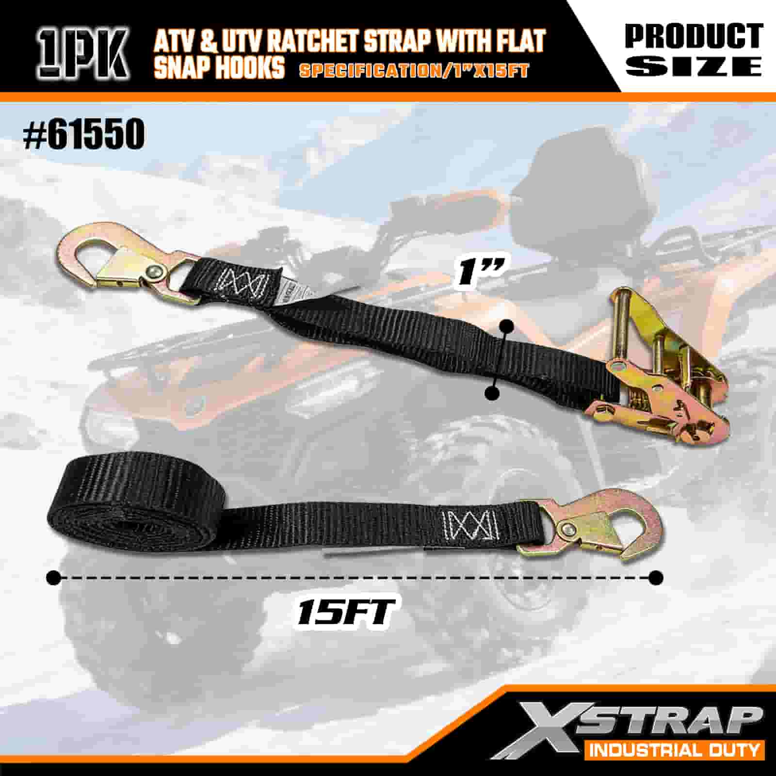 حزام سقاطة Xstrap ATV وAUV مع خطافات مسطحة، وحزام سقاطة من البوليستر مقاس 1 × 15 بوصة، وأشرطة تثبيت البضائع بسعة 1000 رطل مع مشبك مسطح للمقطورة، وقارب تزلج بمقطورة مسطحة، وسيارة صغيرة، ومعدات ثقيلة.