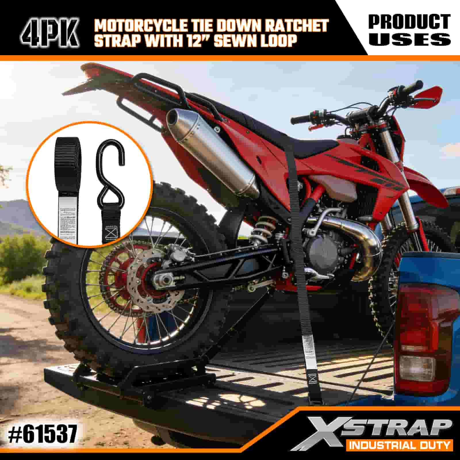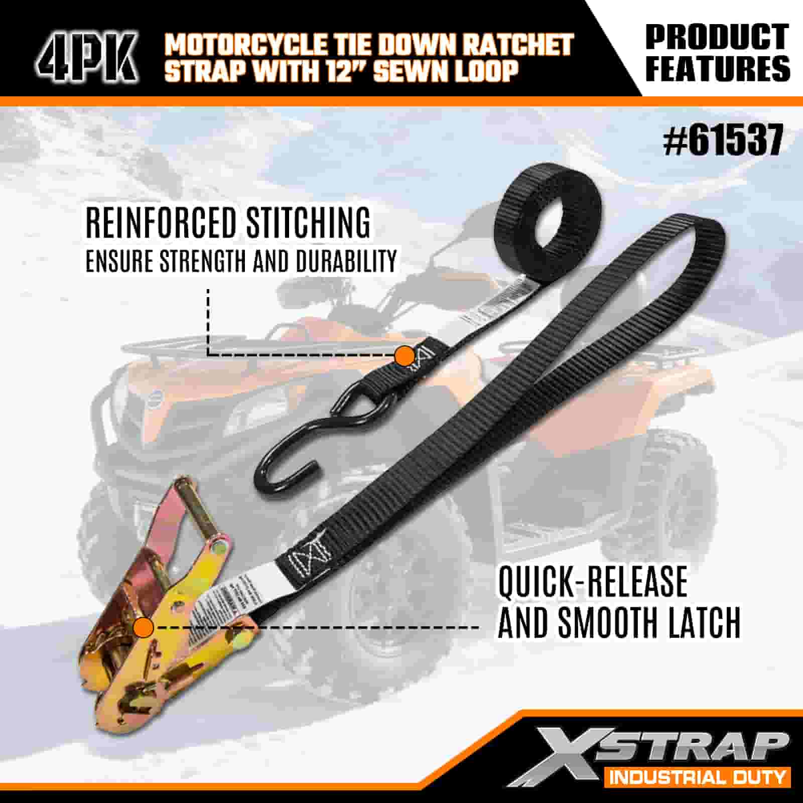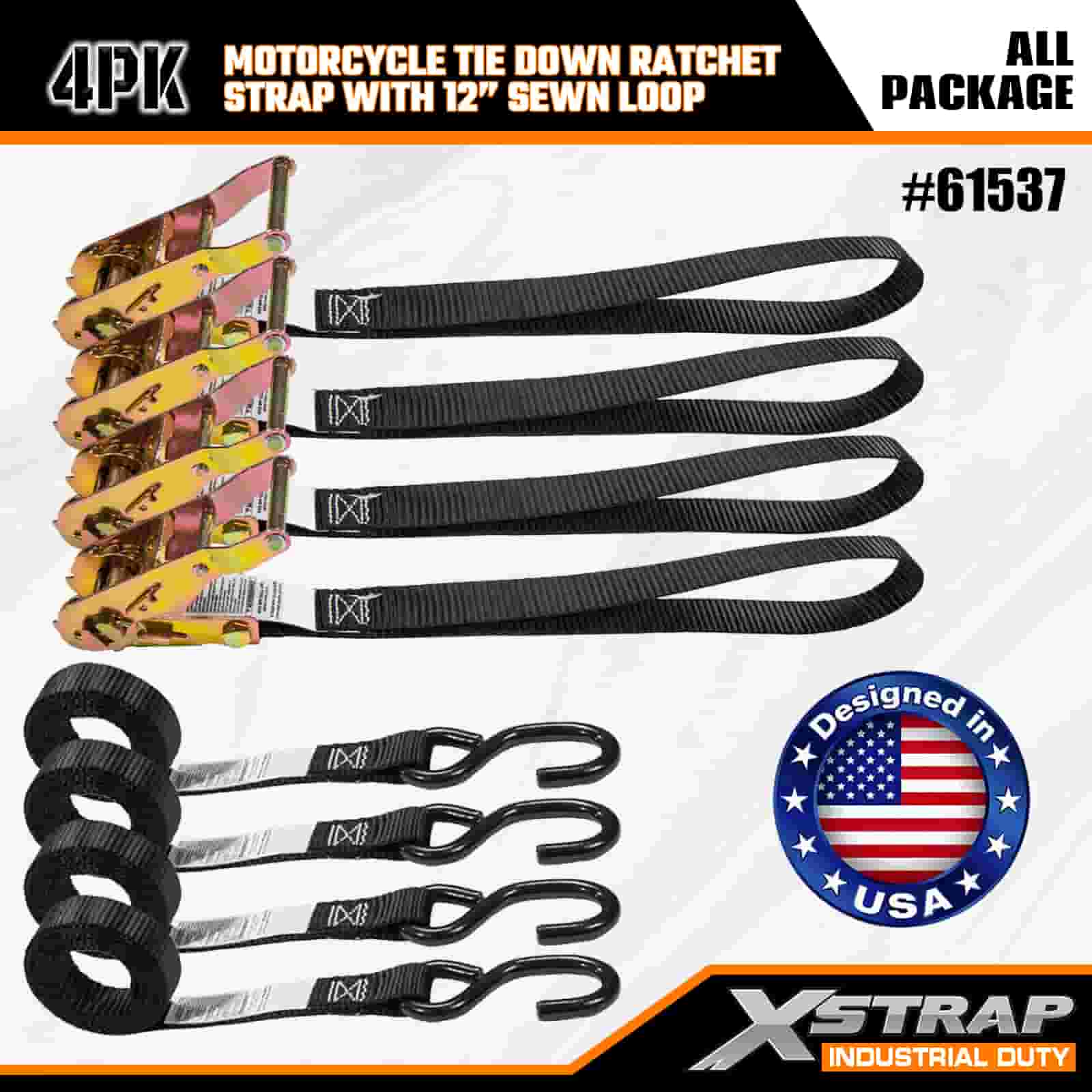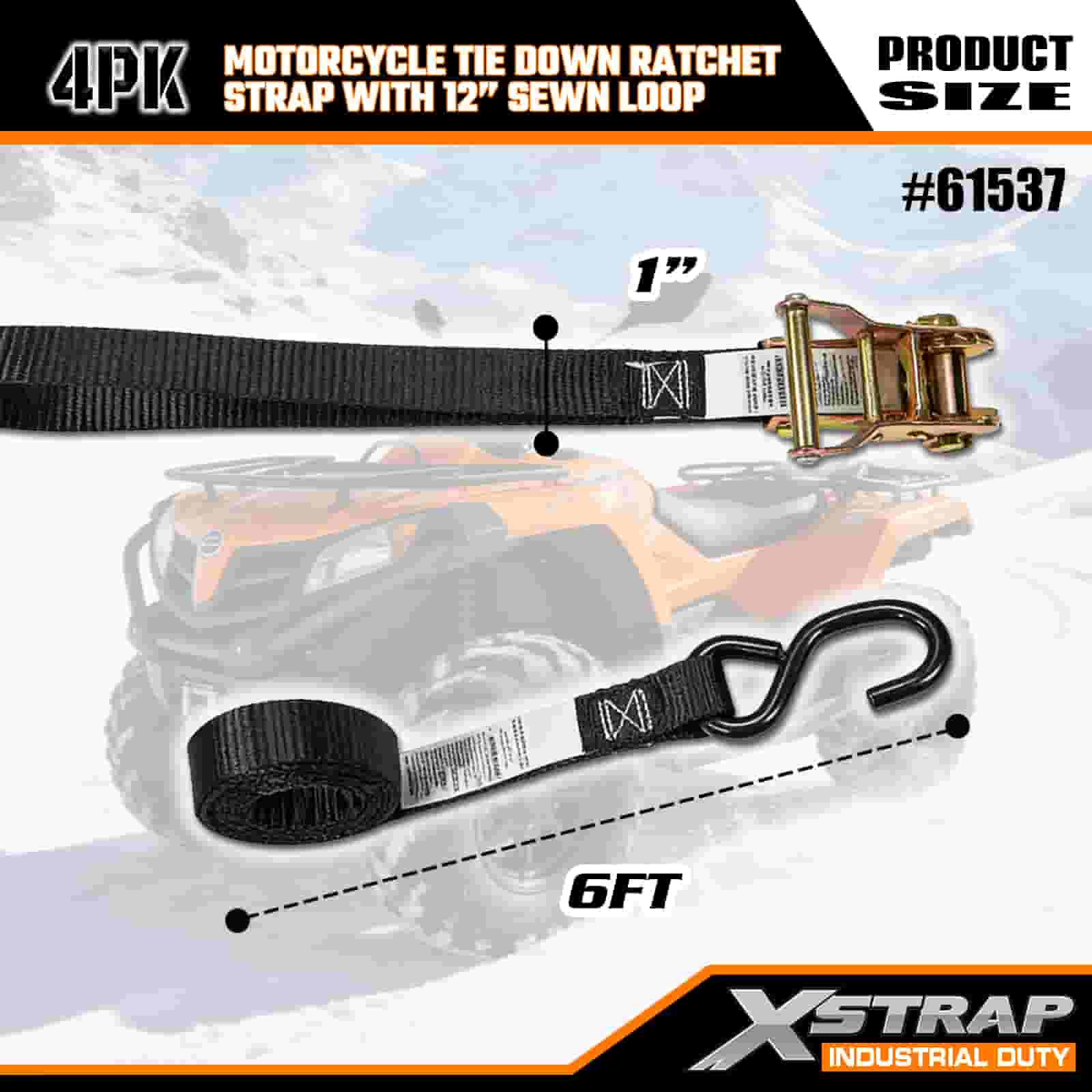 - 4 عبوات بطول 6 أقدام لربط الدراجات النارية: تُباع كمجموعة مكونة من 4 أحزمة (عرض 1 بوصة × طول 6 أقدام)، مثالية لتأمين الدراجات النارية ومركبات ATV والعتاد الصغير في أسِرَّة الشاحنات أو أثناء النقل.