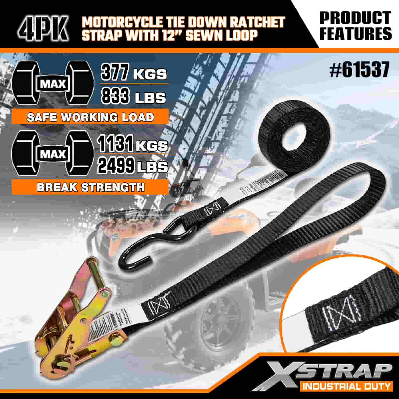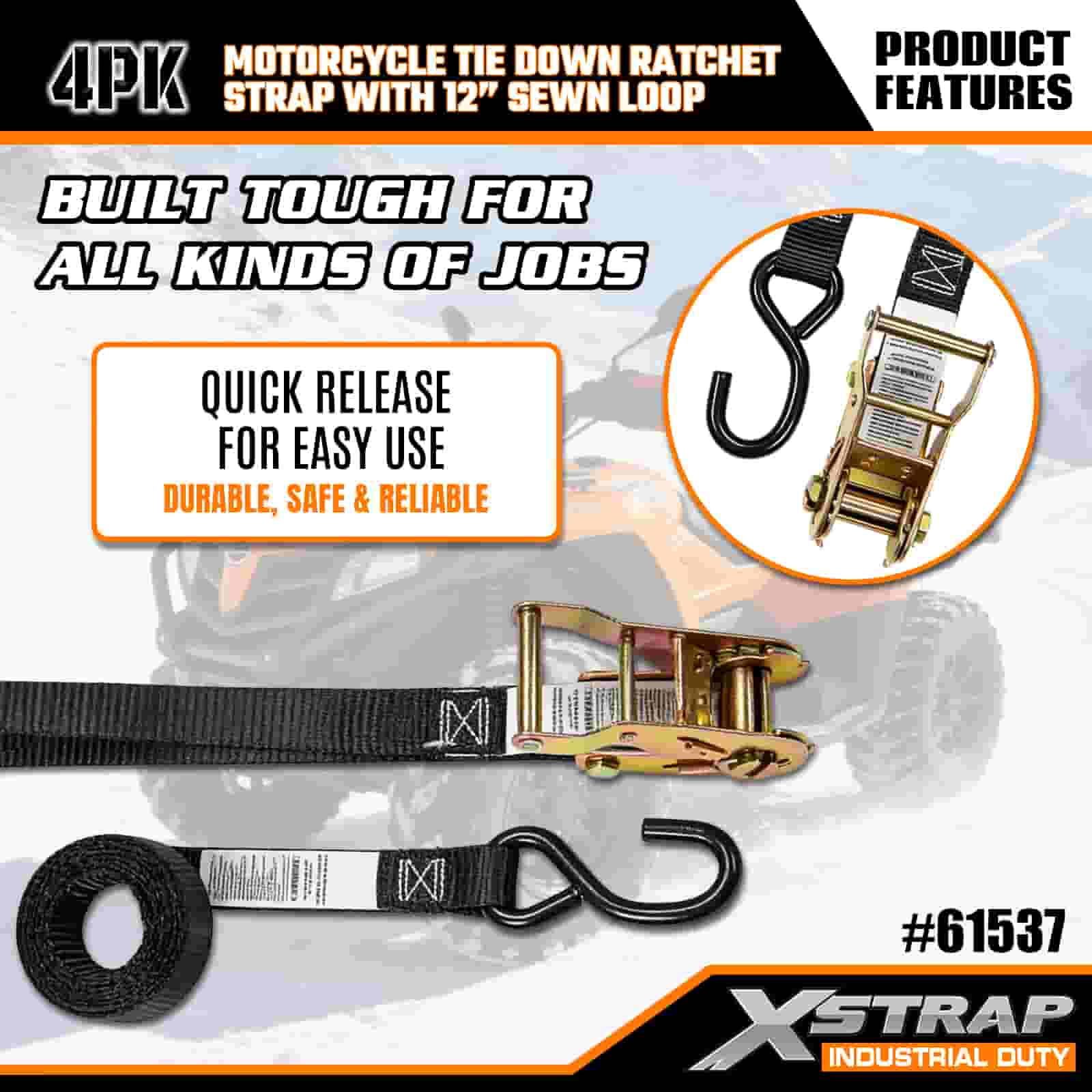 حزام سقاطة للدراجة النارية من Xstrap مكون من 4 قطع مع حلقة مخيطة مقاس 12 بوصة، وحزام سقاطة للسحب من البوليستر مقاس 1 بوصة × 6 بوصات، وأشرطة تثبيت لربط البضائع بسعة 833 رطلًا مع خطاف على شكل S للمحترفين الجديين لتأمين مقطورة البضائع، ومقطورة السرير المسطحة، وقارب التزلج، والسيارة الصغيرة.