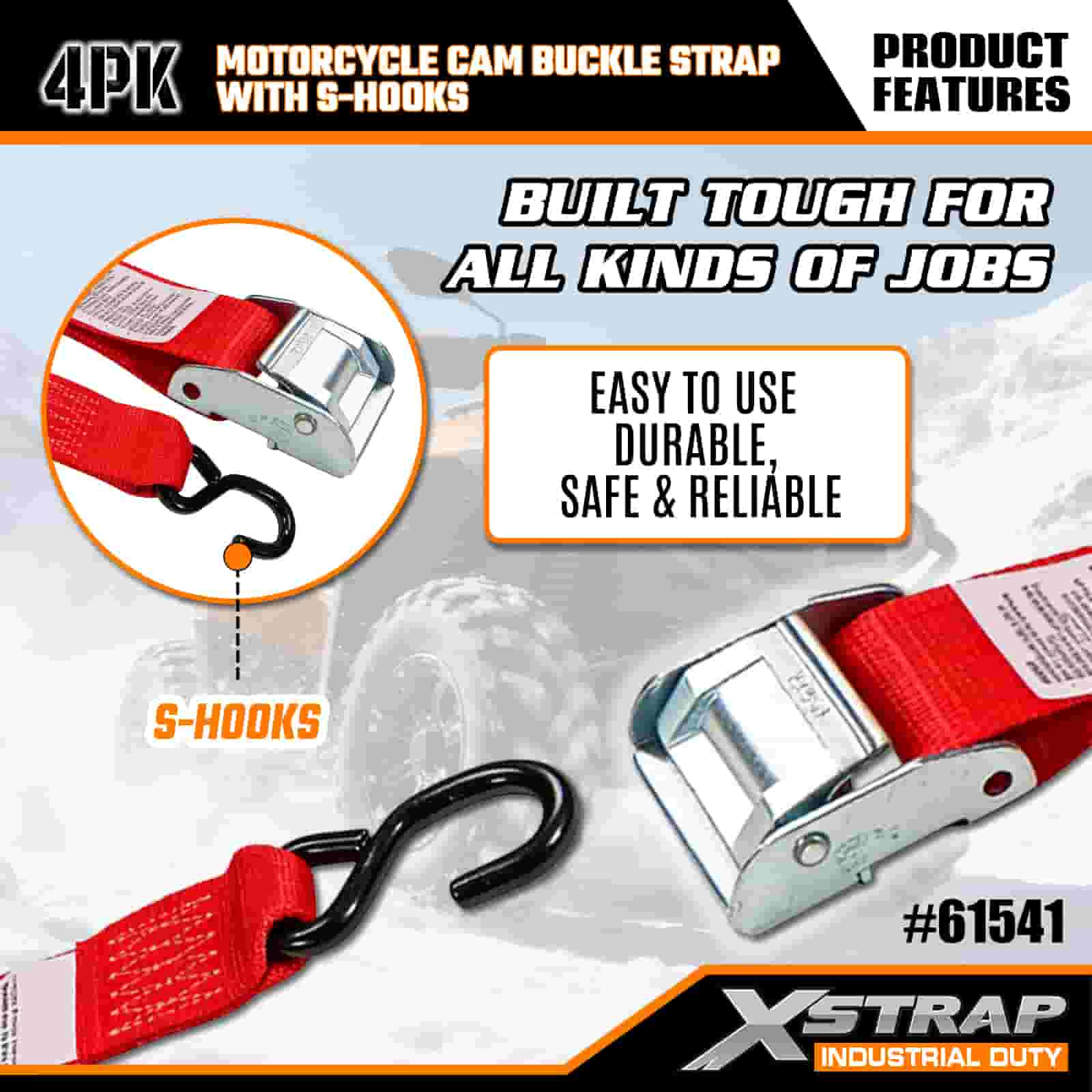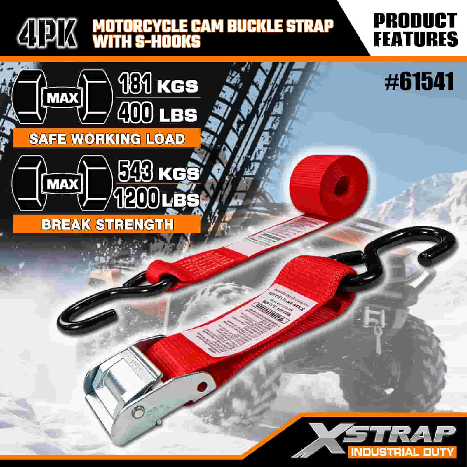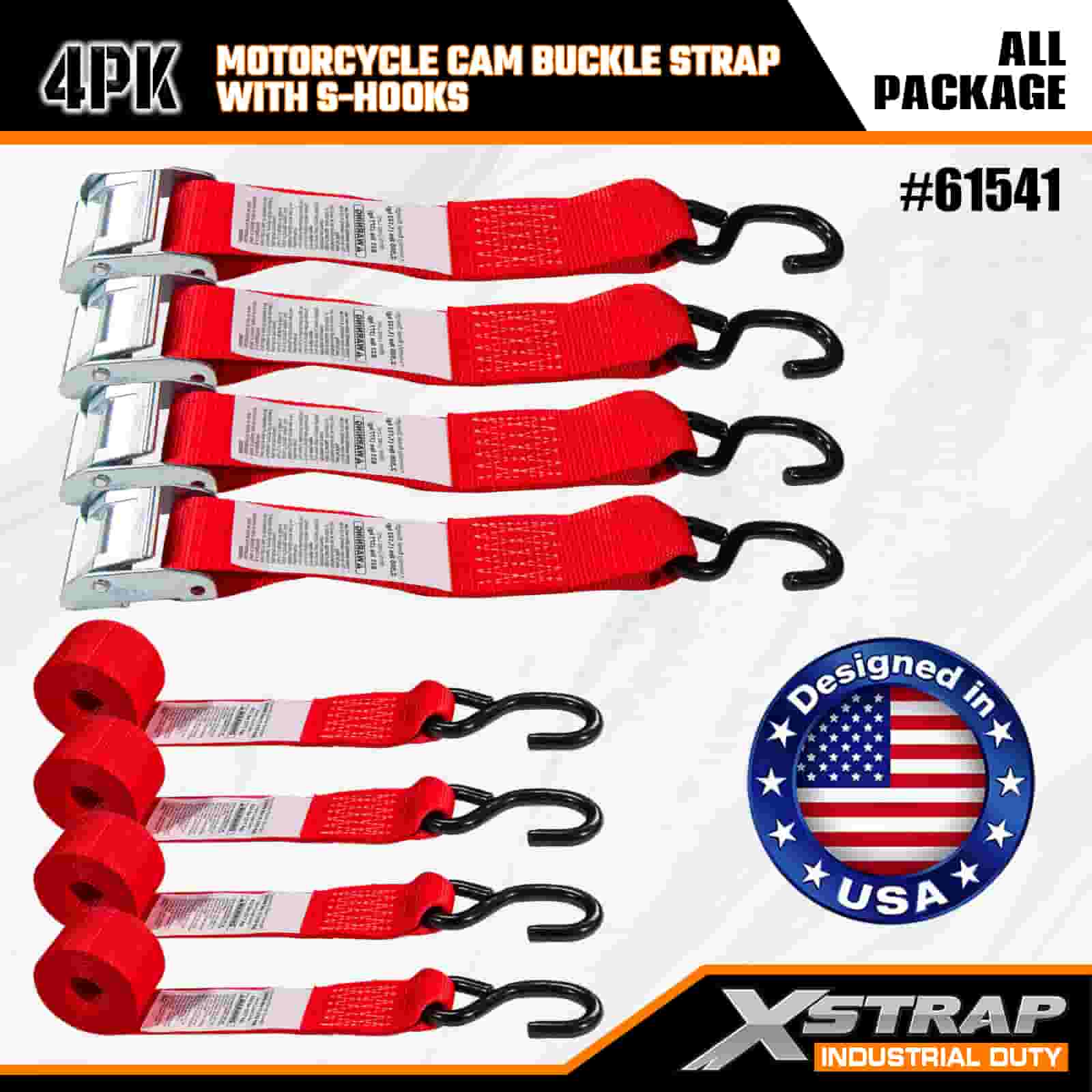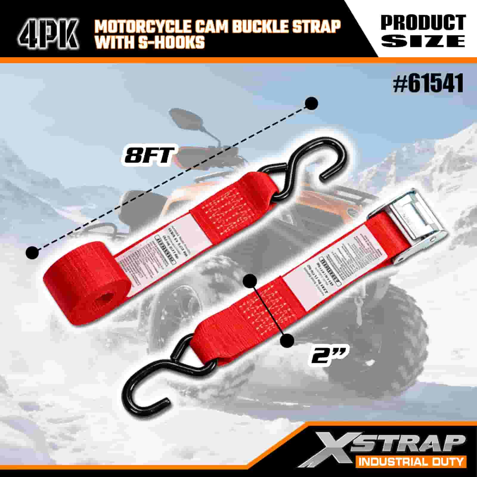 Xstrap 4PK حزام مشبك كام للدراجة النارية مع خطاف على شكل S، حزام ربط من البوليستر مقاس 2 × 8 بوصات، حزام بإبزيم بسقاطة، أشرطة تثبيت لربط البضائع بسعة 400 رطل مع خطاف على شكل S للمحترفين الجديين لتأمين مقطورة البضائع، ومقطورة السرير المسطحة، وقارب التزلج، والسيارة الصغيرة.