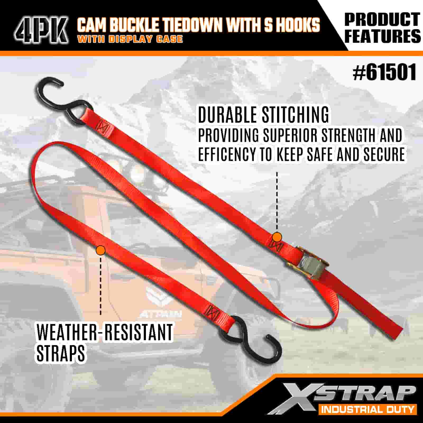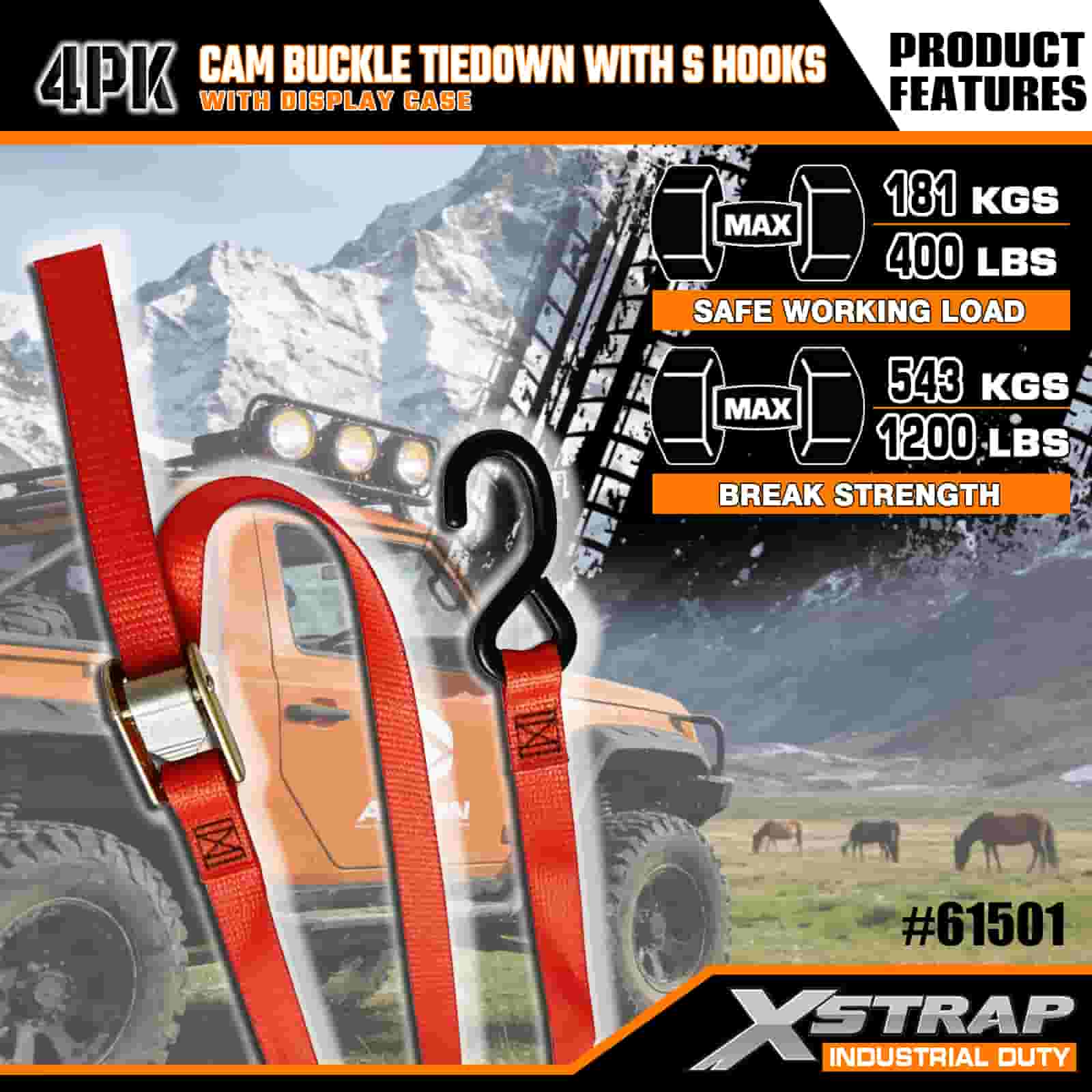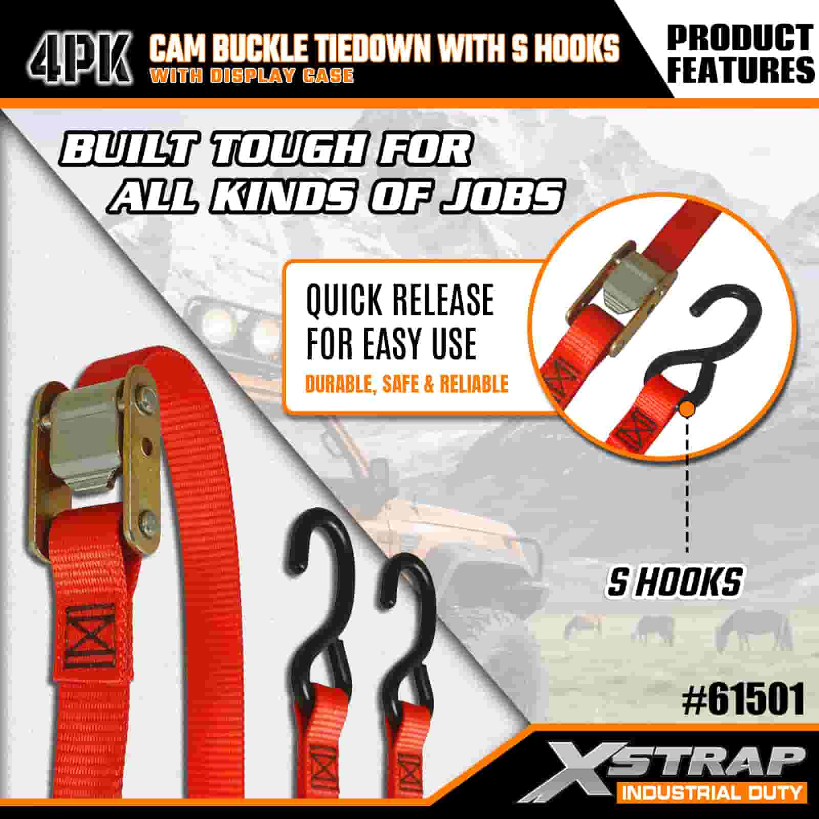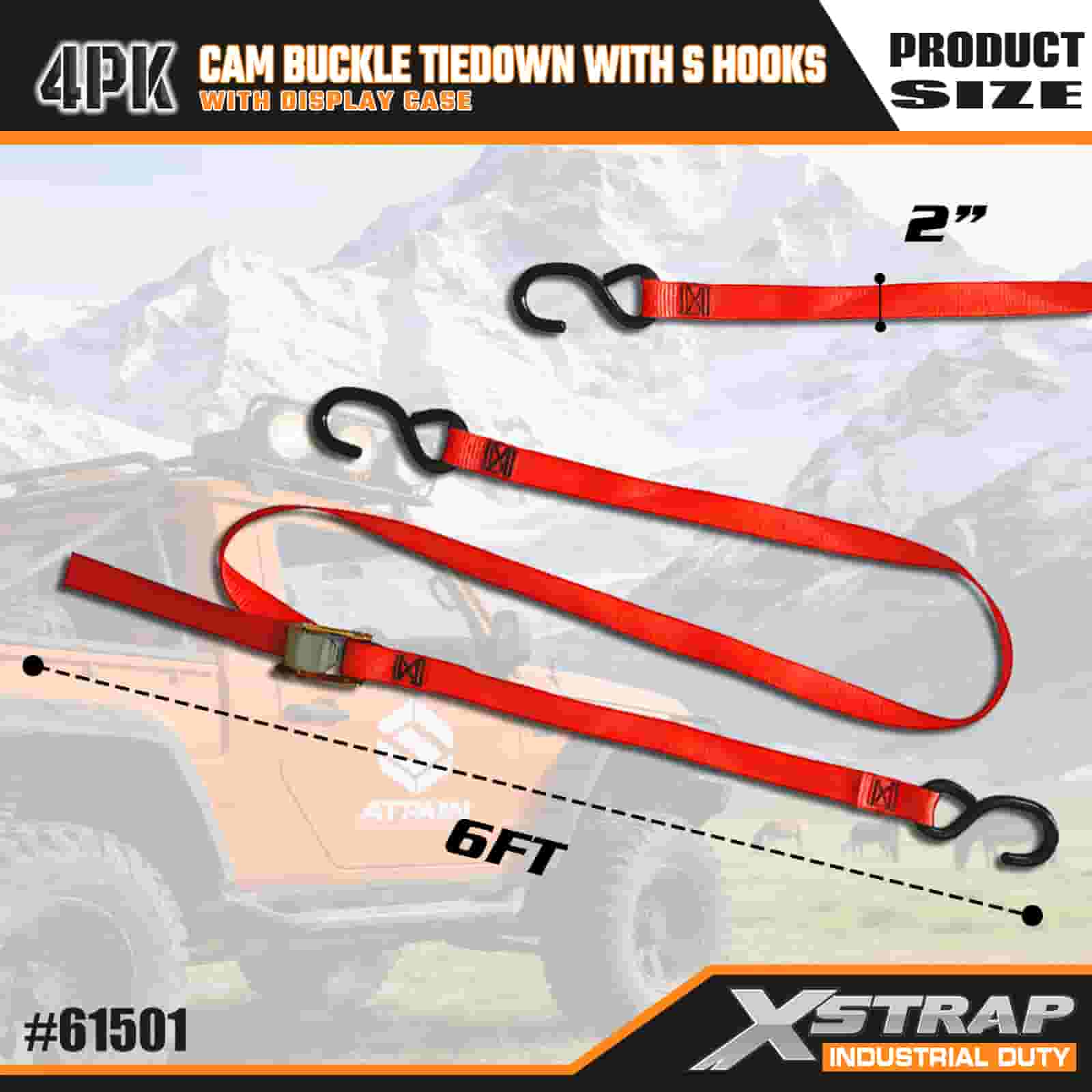 Xstrap 4 قطع من مشبك تثبيت الكاميرا مع خطافات S، وحزام ربط من البوليستر مقاس 2 × 6 بوصات مع مشبك كام، وأشرطة تثبيت لربط البضائع بسعة 400 رطل مع خطافات على شكل S للمحترفين الجديين لتأمين مقطورة البضائع، ومقطورة سرير مسطحة، وقارب تزلج، وسيارة صغيرة.