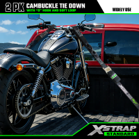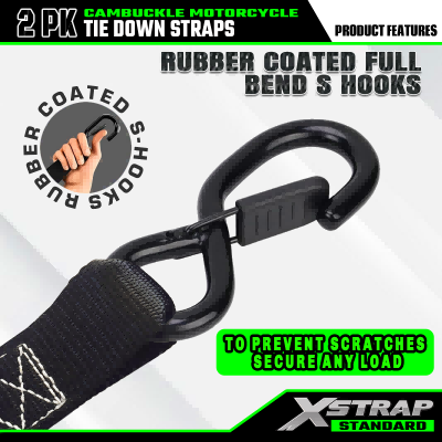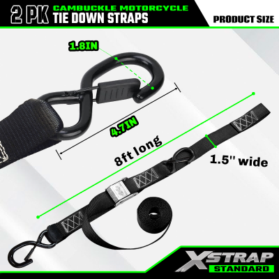 هذه أحزمة بإبزيم كام مكونة من قطعتين من Xstrap مع خطافات أمان. يبلغ حمل العمل الآمن 733 رطلاً، وقوة الكسر 2200 رطل. تُستخدم عادةً لتأمين الدراجات النارية وقوارب الكاياك وما إلى ذلك.