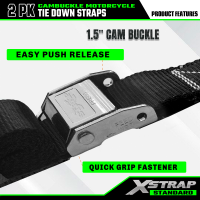 - تصميم قياسي عالي التحمل: تم تصميم أحزمة ربط الدراجات النارية Xstrap من نسيج عالي القوة ولها قوة كسر تصل إلى 2200 رطل، مما يجعلها الخيار الأفضل لتأمين الدراجات النارية وATVs وUTVs والدراجات الترابية. عند استخدام أحزمة إبزيم الكاميرا الخاصة بنا لرحلة سريعة، تضمن أحزمة ربط Xstrap متانة وأمان لا مثيل لهما.