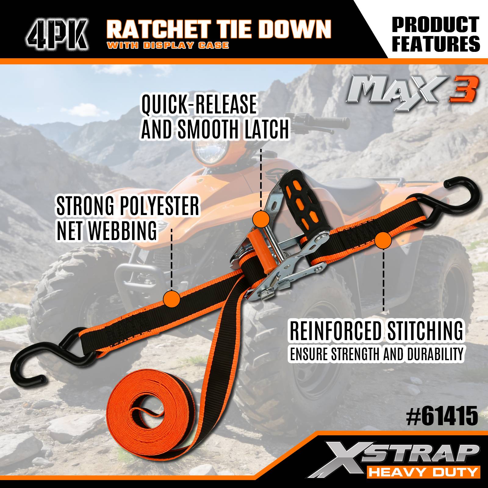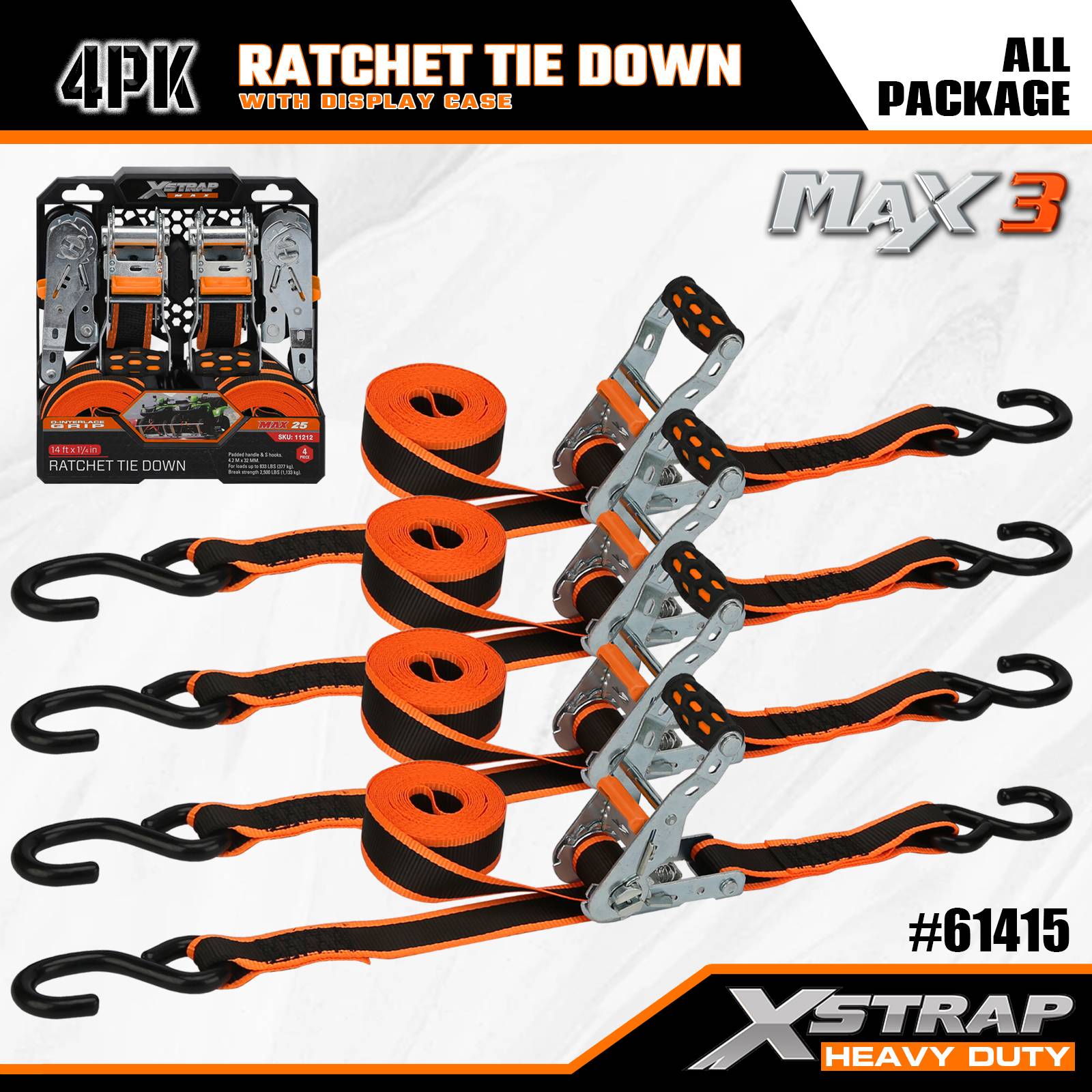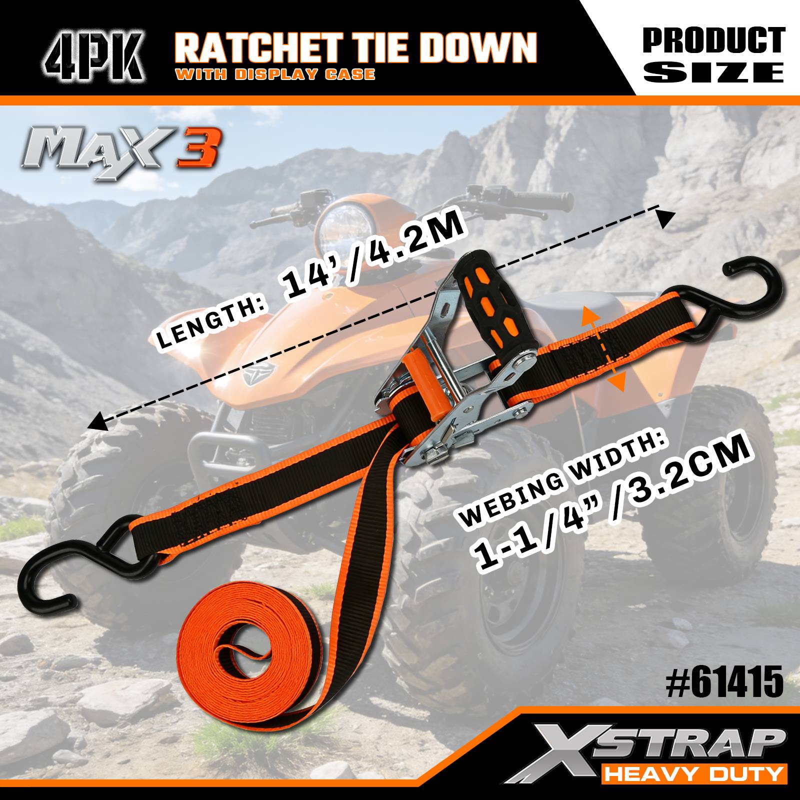 Xstrap 4 قطع من ربطات السقاطة، 1-1/4 بوصة × 14 بوصة من البوليستر، حزام سحب للأسفل، أشرطة تثبيت لربط البضائع بسعة 1000 رطل مع خطافات على شكل S للشاحنة، وسيارات الدفع الرباعي، والدراجات النارية ذات الرفوف العلوية للسيارة.