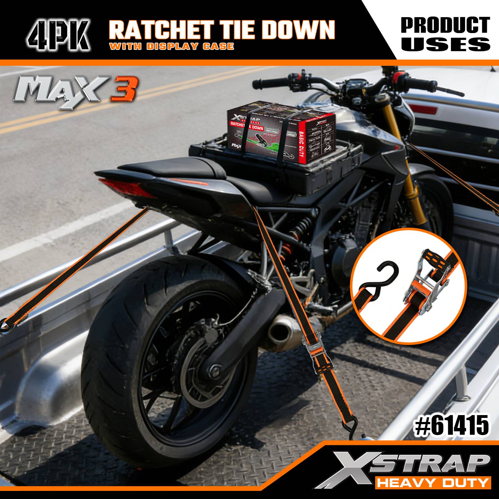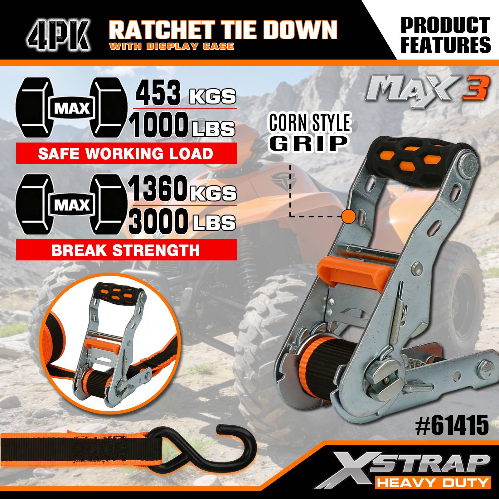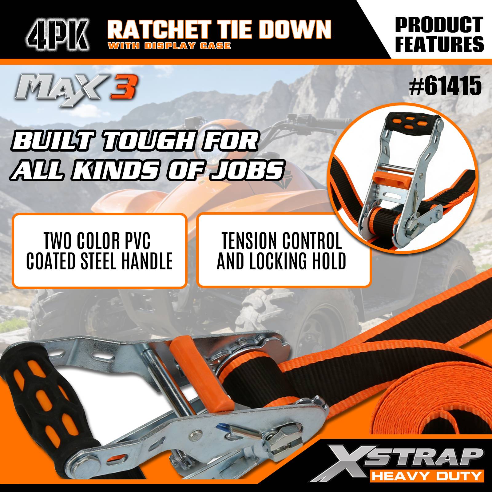Xstrap 4 قطع من ربطات السقاطة، 1-1/4 بوصة × 14 بوصة من البوليستر، حزام سحب للأسفل، أشرطة تثبيت لربط البضائع بسعة 1000 رطل مع خطافات على شكل S للشاحنة، وسيارات الدفع الرباعي، والدراجات النارية ذات الرفوف العلوية للسيارة.