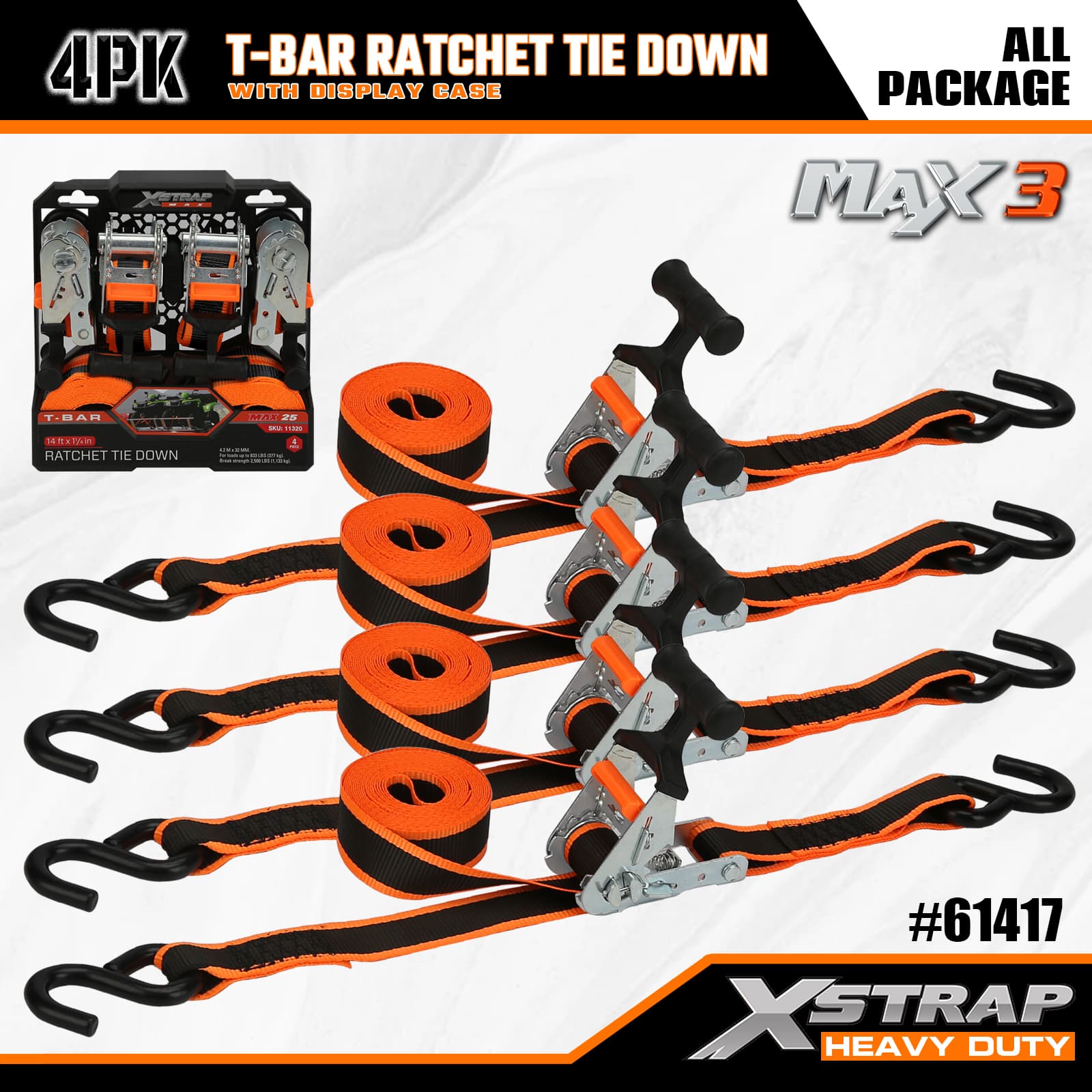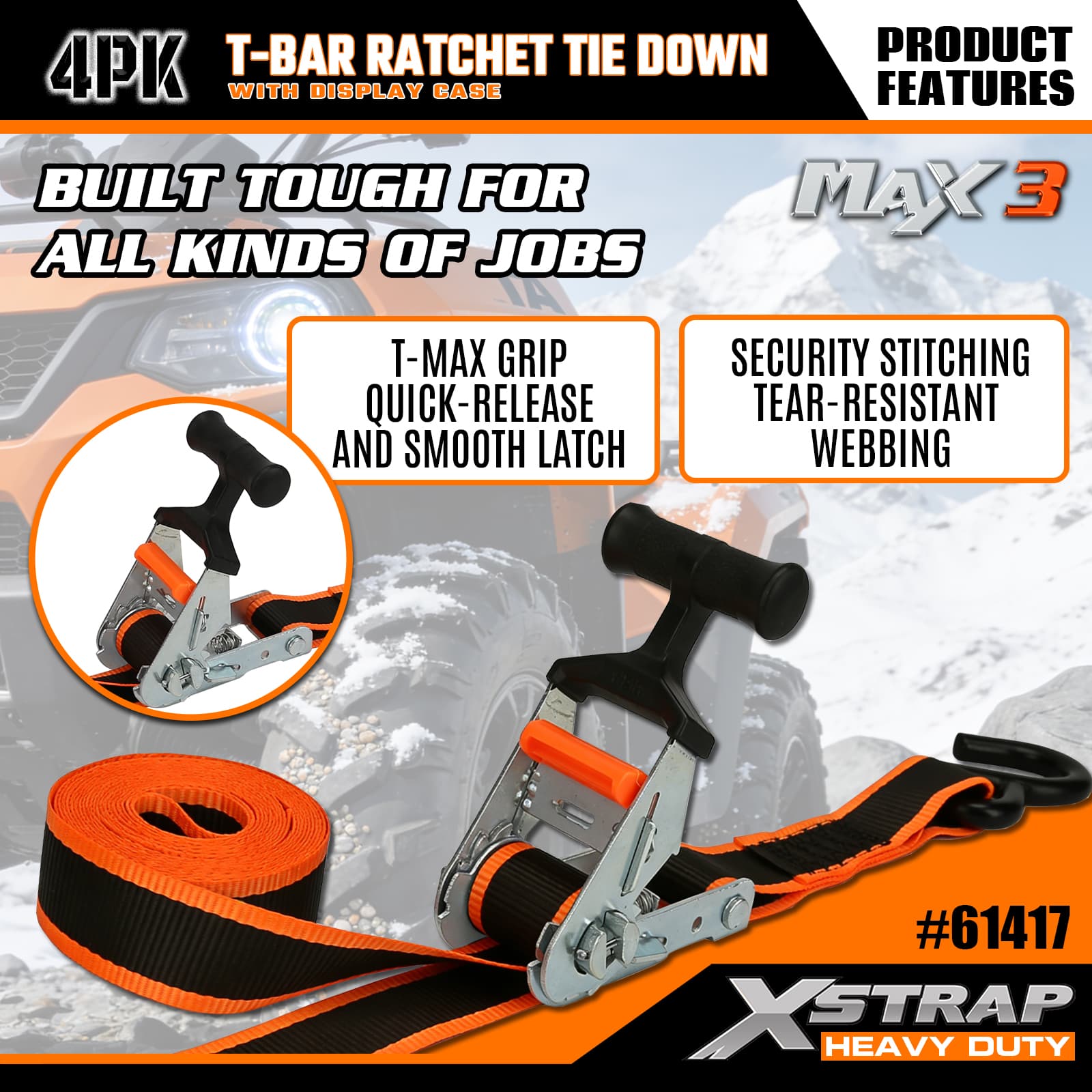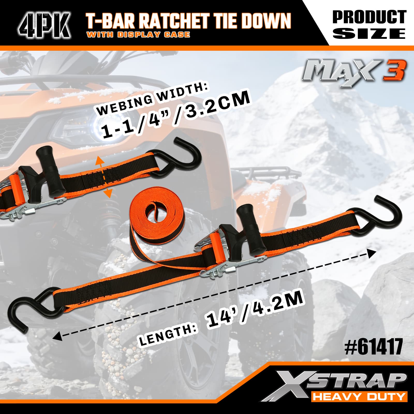 Xstrap 4 عبوات من سقاطة T-Max Grip لأسفل، 1-1/4 بوصة × 14 بوصة من البوليستر، حزام سقاطة للسحب، أشرطة تثبيت لربط البضائع بسعة 1000 رطل مع خطافات على شكل S لشاحنة الالتقاط، وسيارات الدفع الرباعي، والدراجات النارية ذات الرفوف العلوية للسيارة، وقارب صيد خفيف، وجت سكي، وعربة الثلج، وجرار العشب.