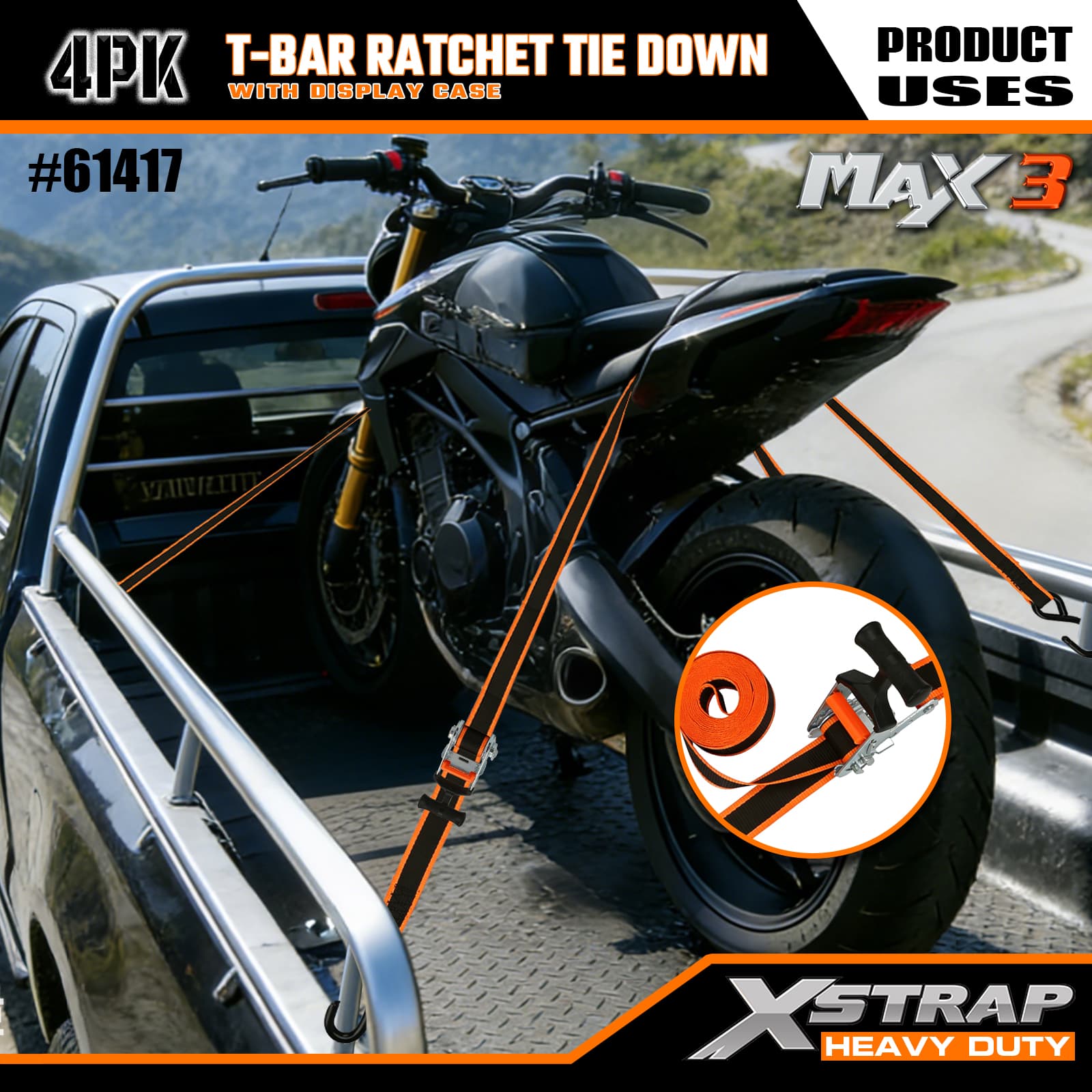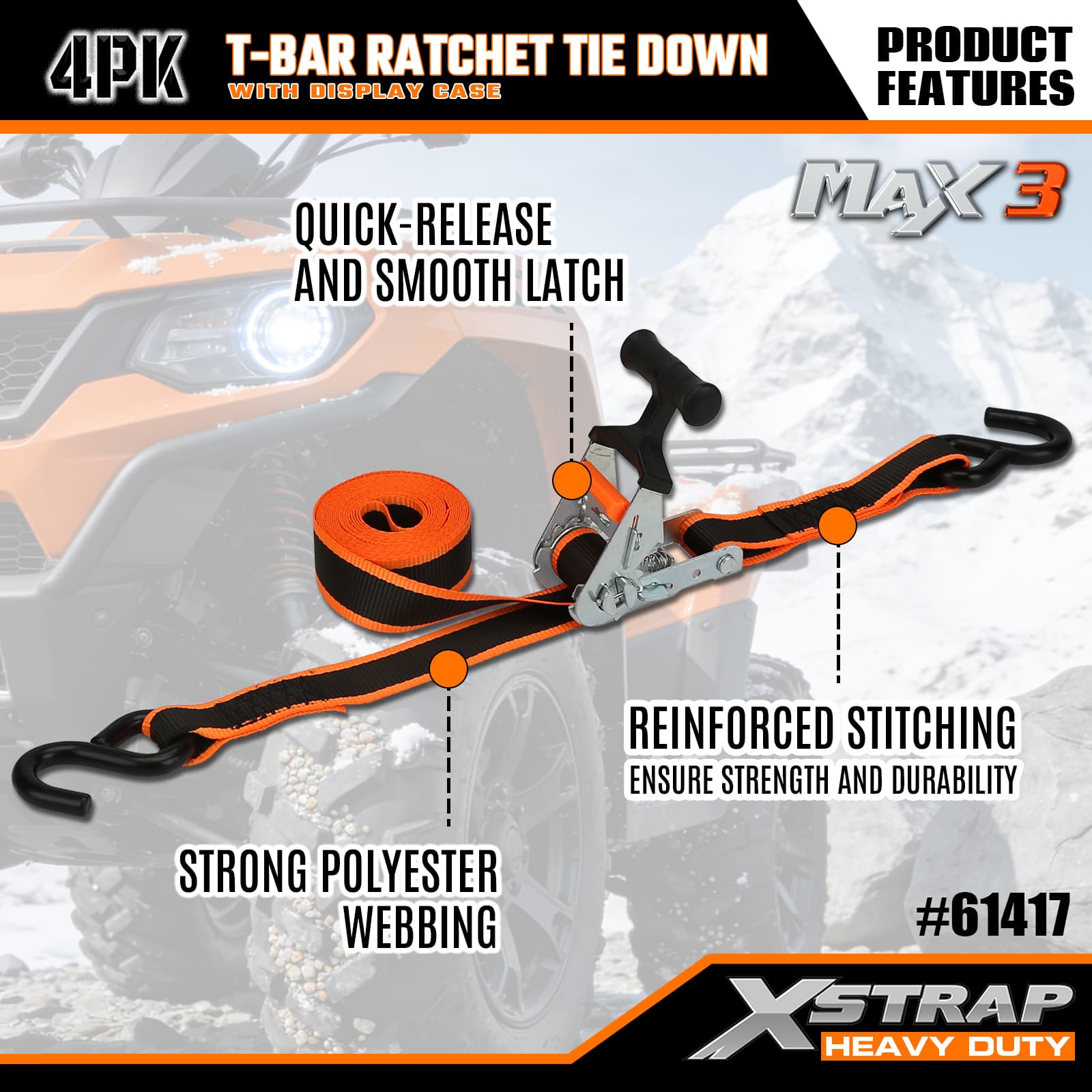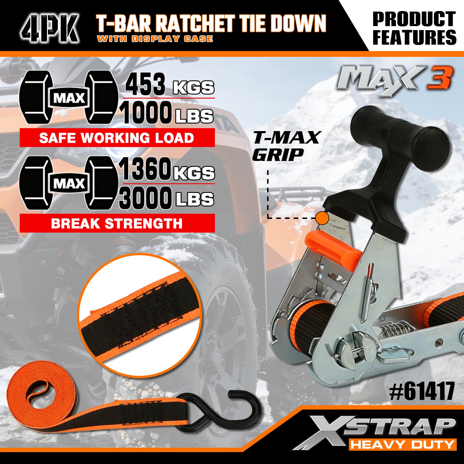 Xstrap 4 عبوات من سقاطة T-Max Grip لأسفل، 1-1/4 بوصة × 14 بوصة من البوليستر، حزام سقاطة للسحب، أشرطة تثبيت لربط البضائع بسعة 1000 رطل مع خطافات على شكل S لشاحنة الالتقاط، وسيارات الدفع الرباعي، والدراجات النارية ذات الرفوف العلوية للسيارة، وقارب صيد خفيف، وجت سكي، وعربة الثلج، وجرار العشب.