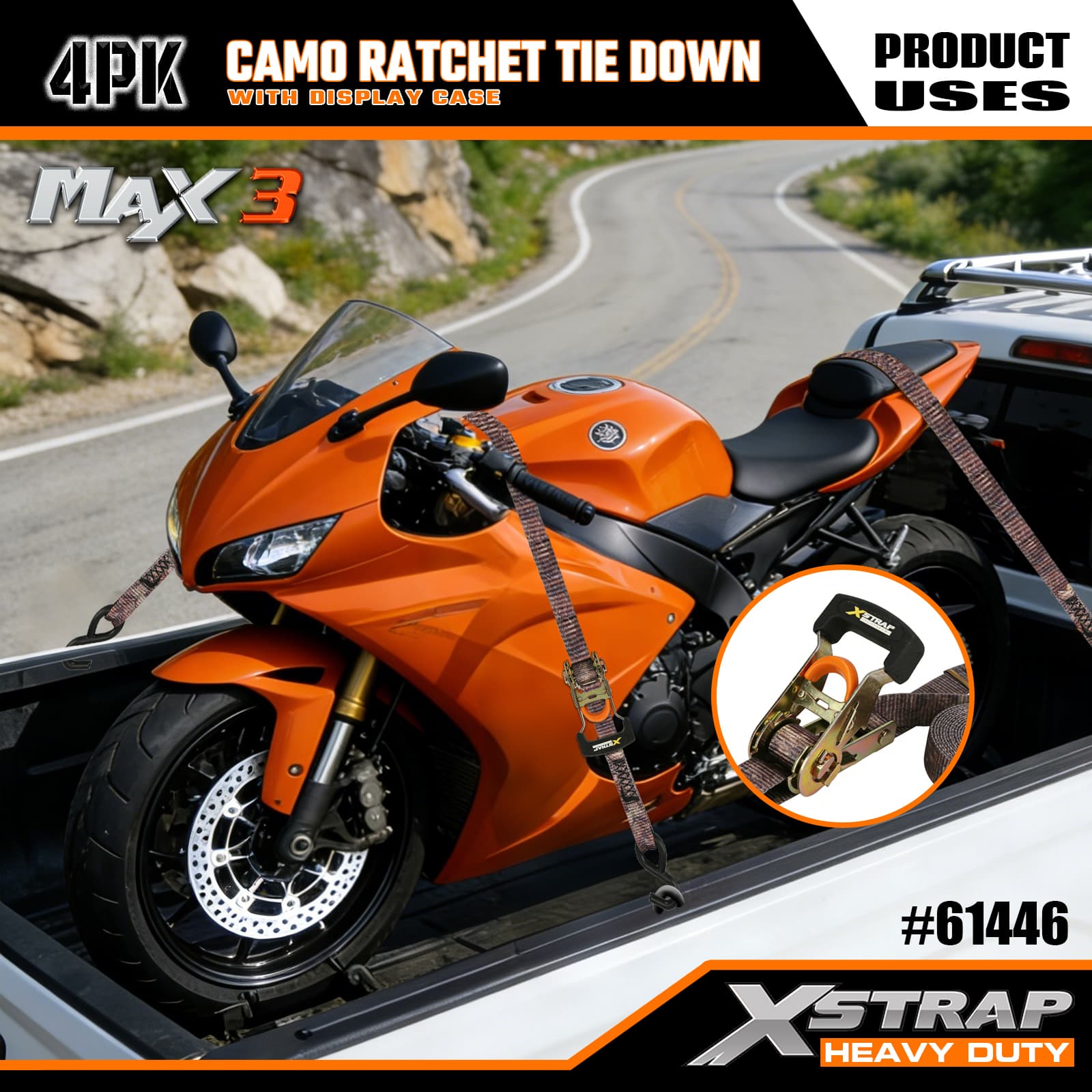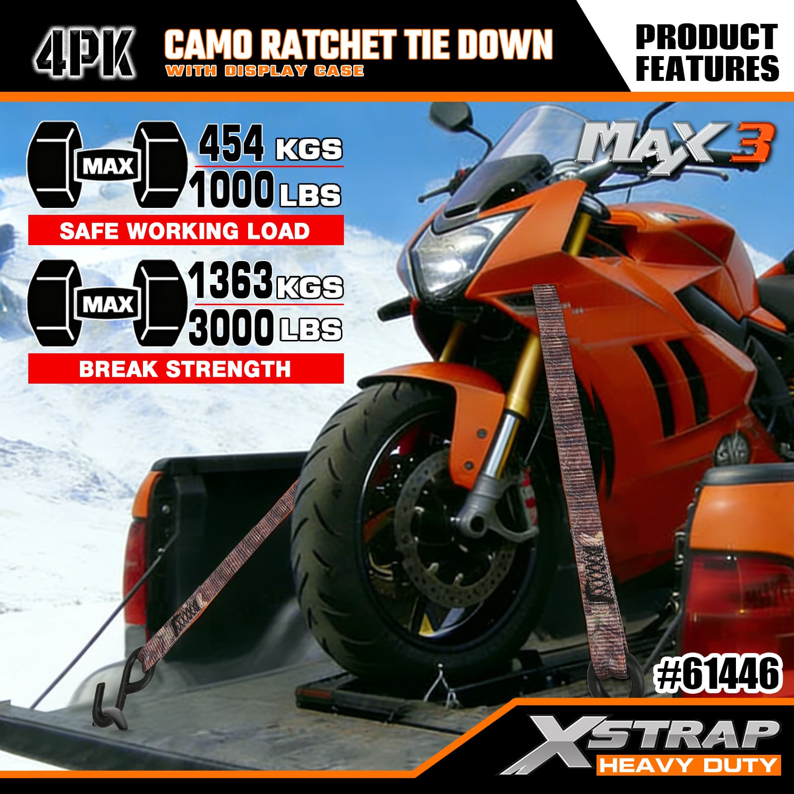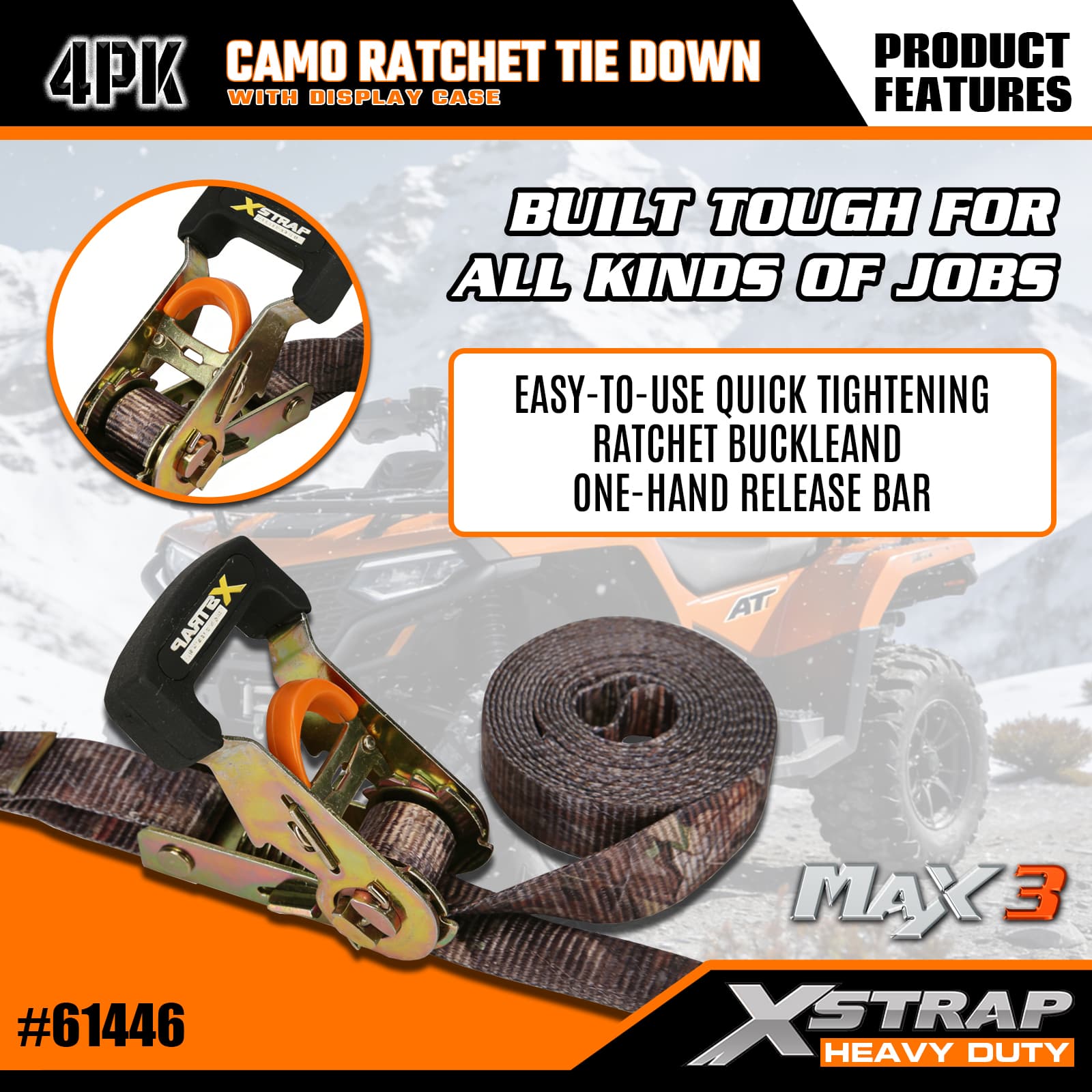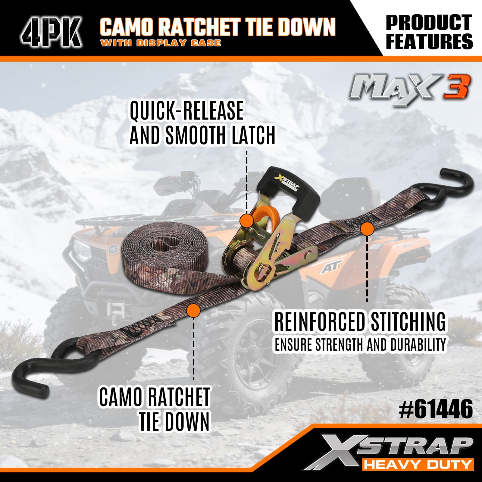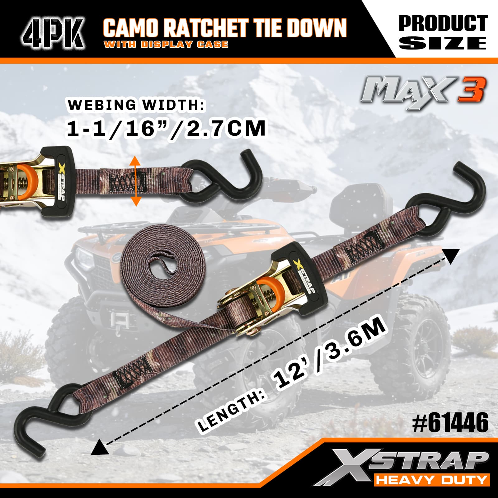 Xstrap 4 قطع مموهة بسقاطة مربوطة للأسفل، 1-1/16 بوصة × 12 بوصة من البوليستر، حزام سحب للأسفل، أشرطة تثبيت لحمل البضائع بسعة 1000 رطل مع خطافات على شكل S لشاحنة الالتقاط، وسيارات الدفع الرباعي، والدراجات النارية ذات الرفوف العلوية للسيارة، وقارب صيد خفيف، وجت سكي، وعربة الثلج، وجرار العشب.