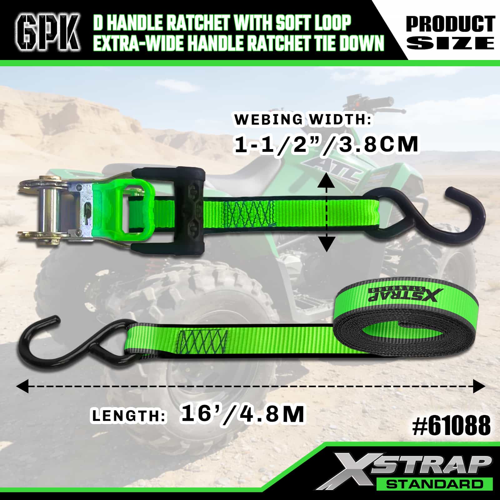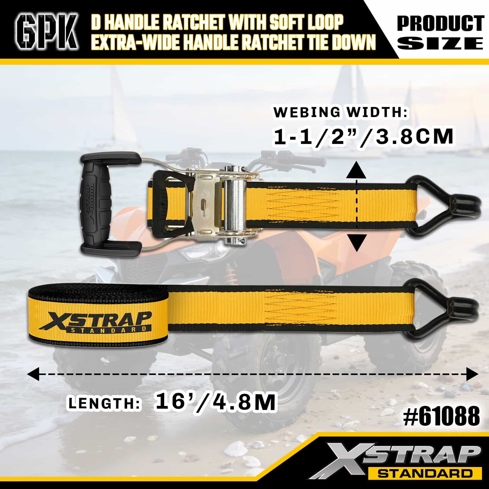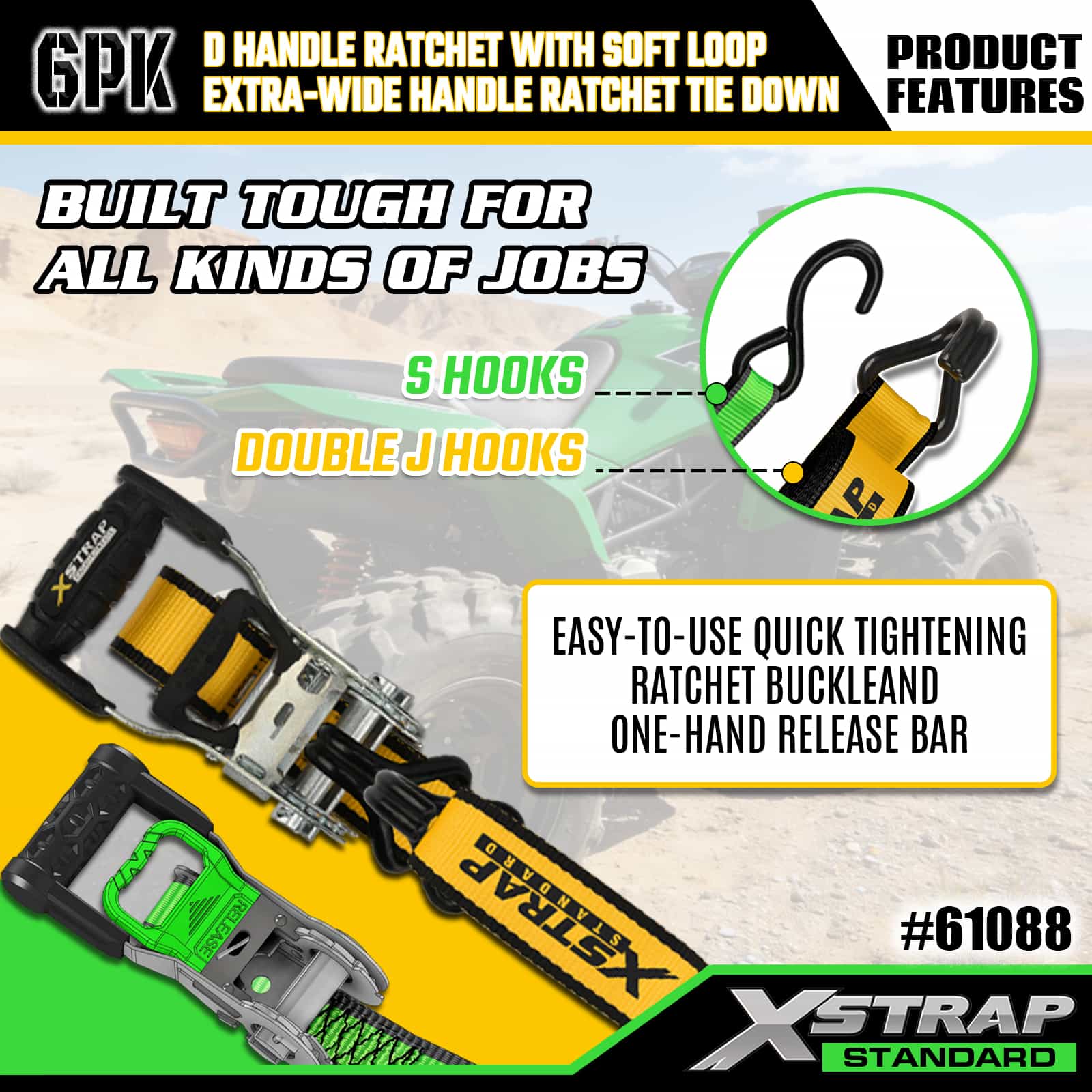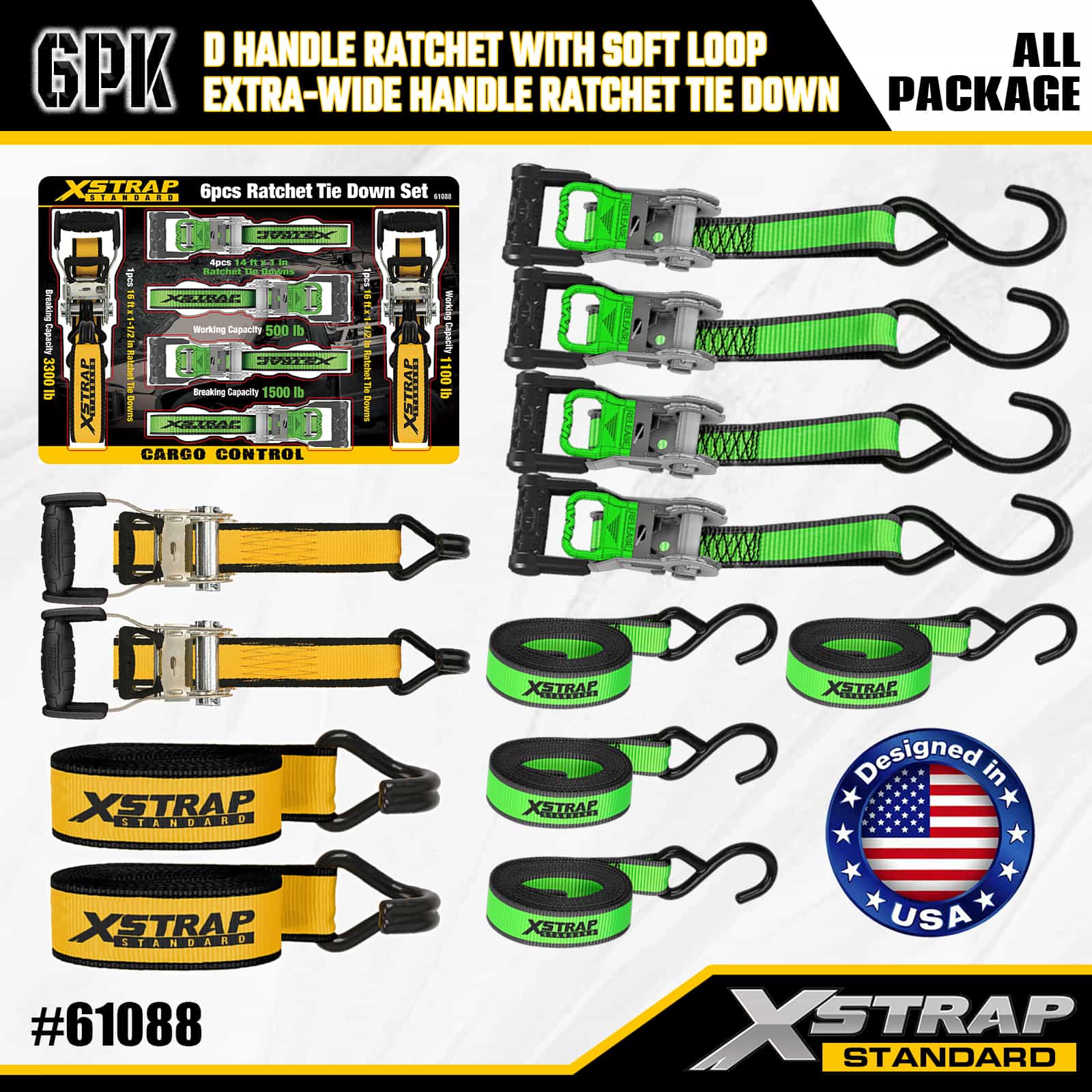 Xstrap 6 عبوات من الألومنيوم بسقاطة ربط للأسفل، 1 بوصة × 14 بوصة و1 بوصة × 16 بوصة حزام ربط من البوليستر للأسفل حزام سحب بسقاطة، 500 رطل و1100 رطل، أشرطة تأمين لربط البضائع بسعة مع خطافات S وخطافات J مزدوجة لشاحنة النقل الصغيرة للتحكم في البضائع، وسيارات الدفع الرباعي، والدراجات النارية ذات الرفوف العلوية للسيارة.