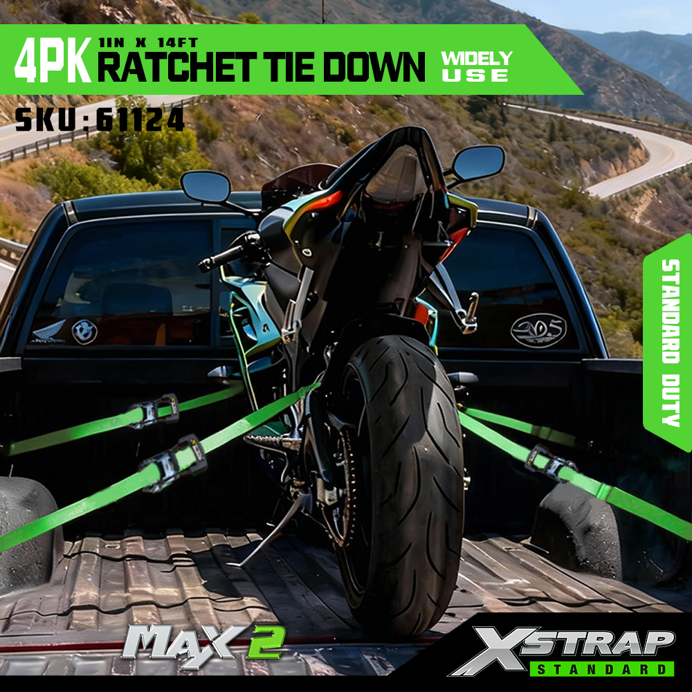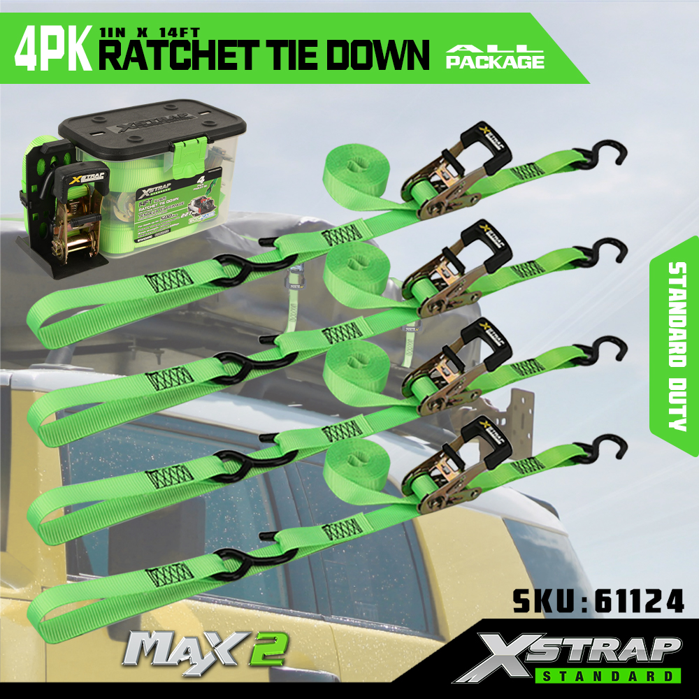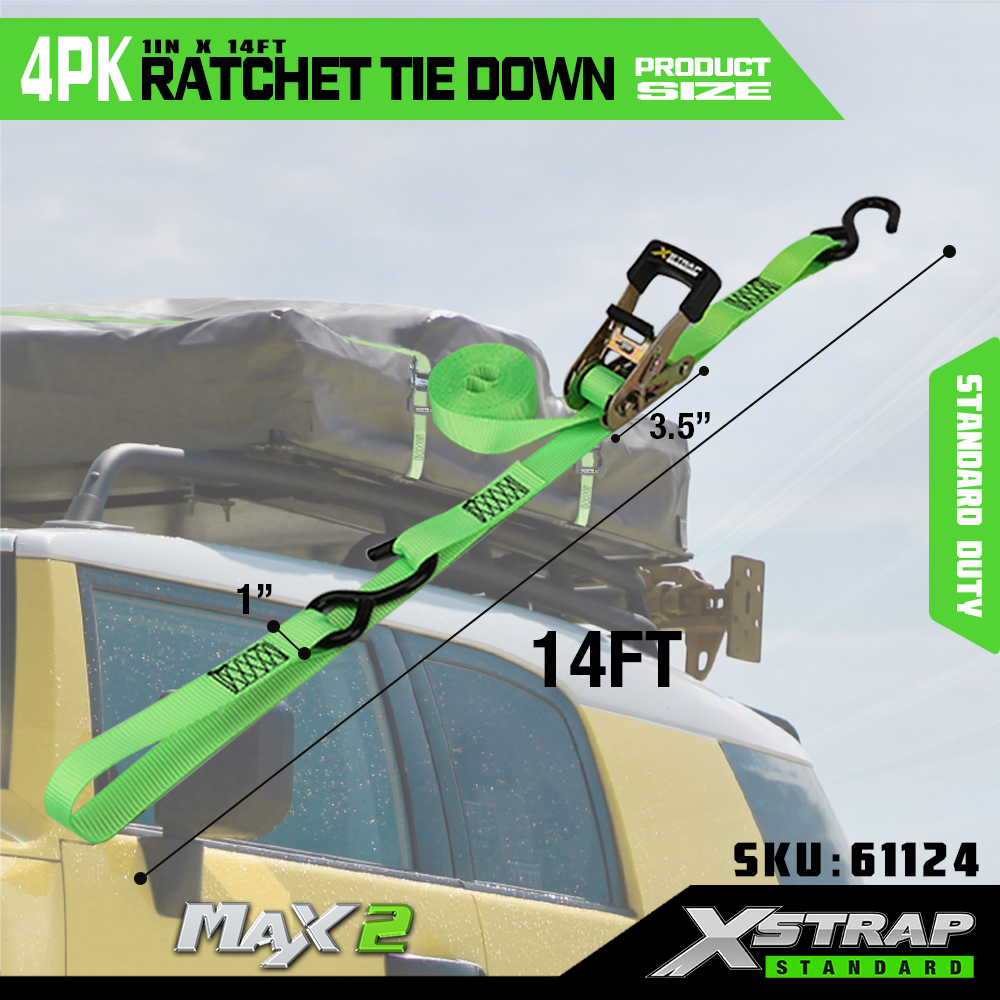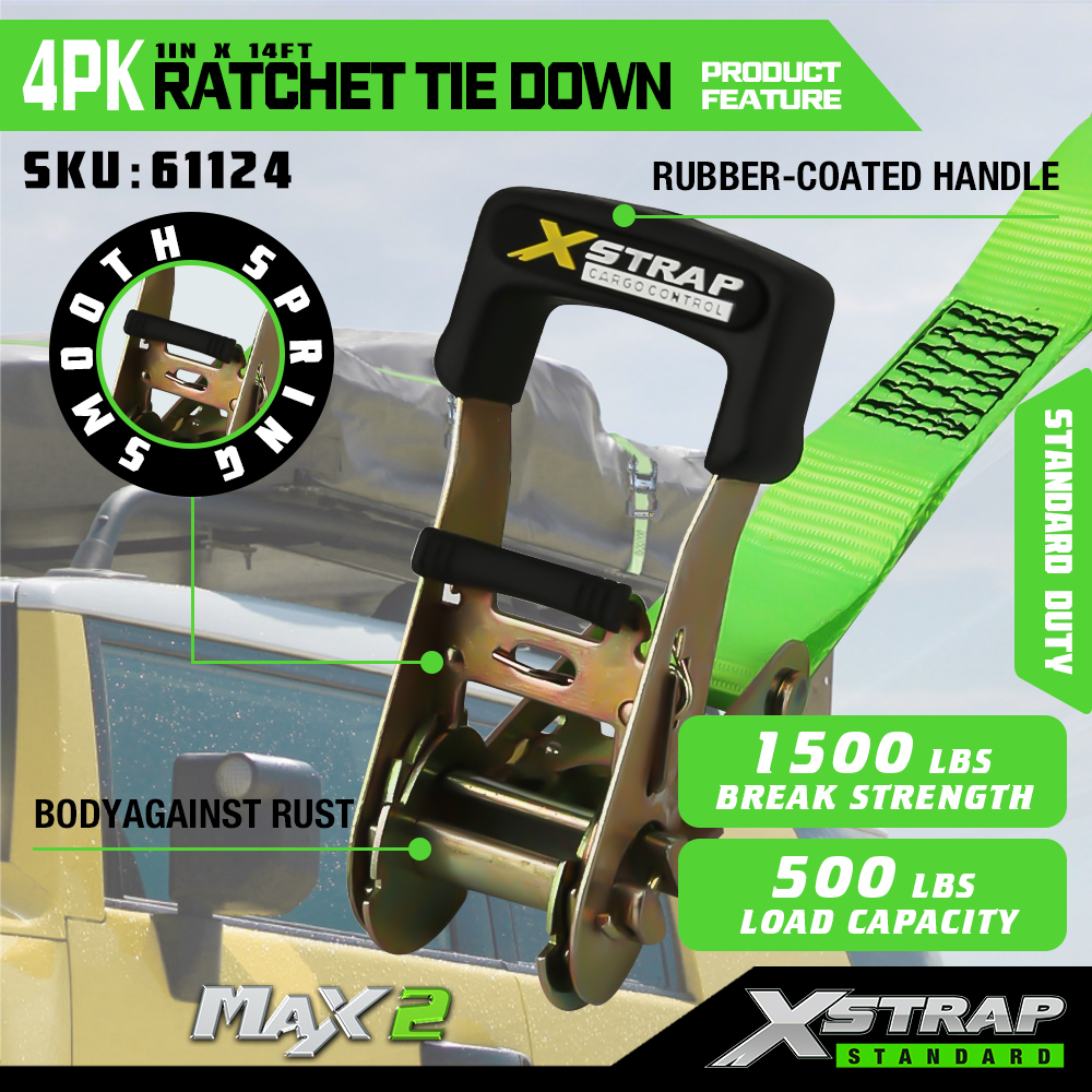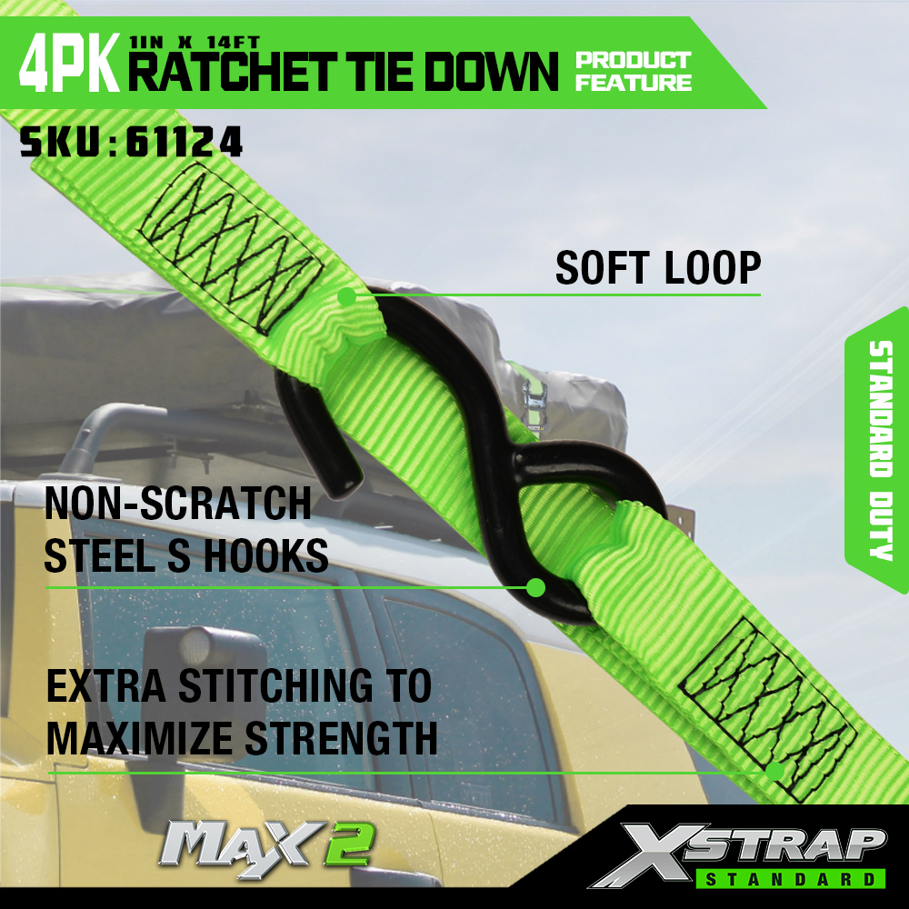 Xstrap 4 عبوات من أشرطة السقاطة، 1 بوصة × 14 بوصة من البوليستر السقاطة مع حلقة ناعمة، سعة 1500 رطل (500 رطل) أشرطة تأمين لربط البضائع مع سقاطة معدنية وخطافات على شكل حرف S للبضائع والشاحنات والجزازة ومركبات ATV.