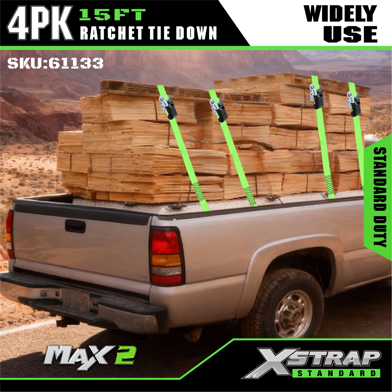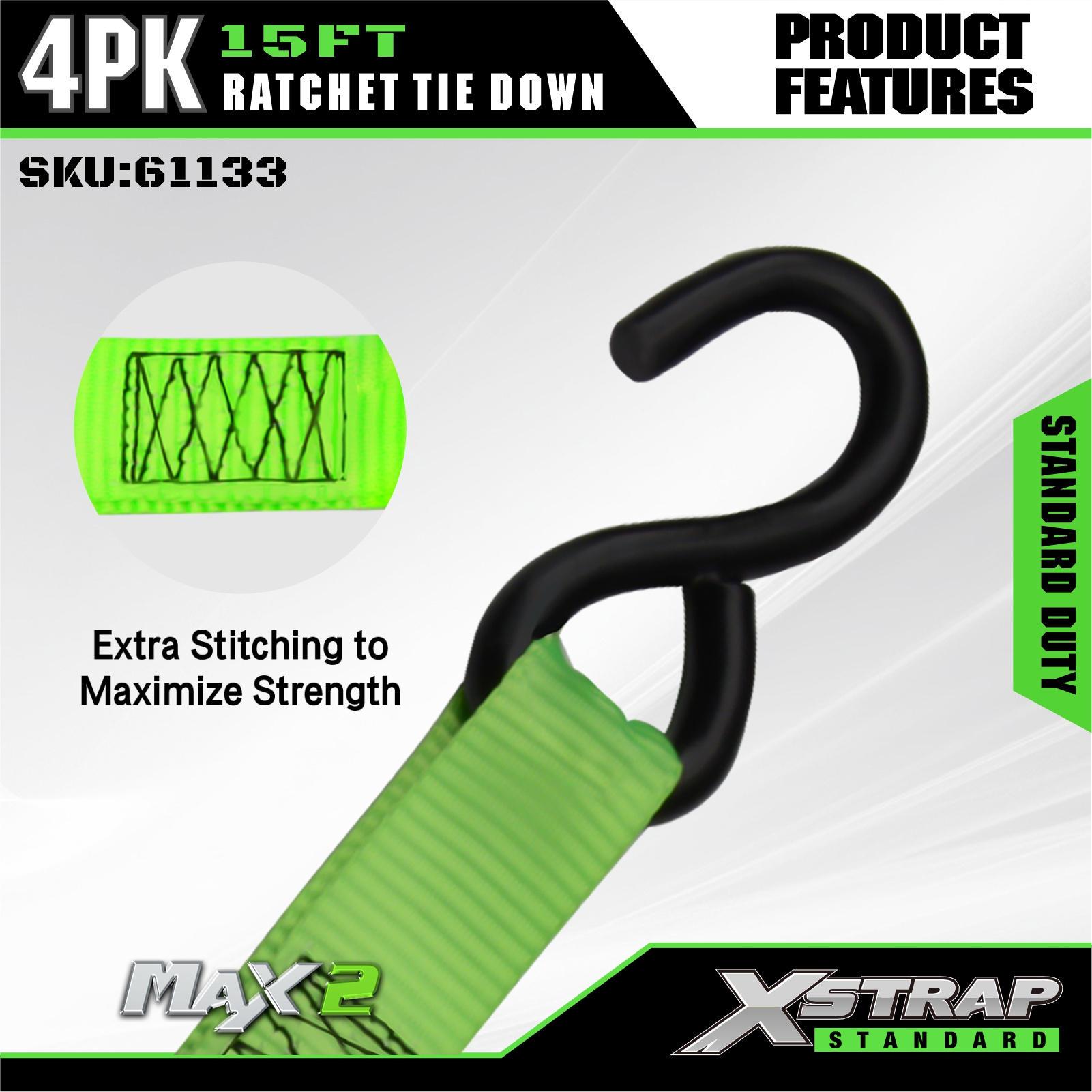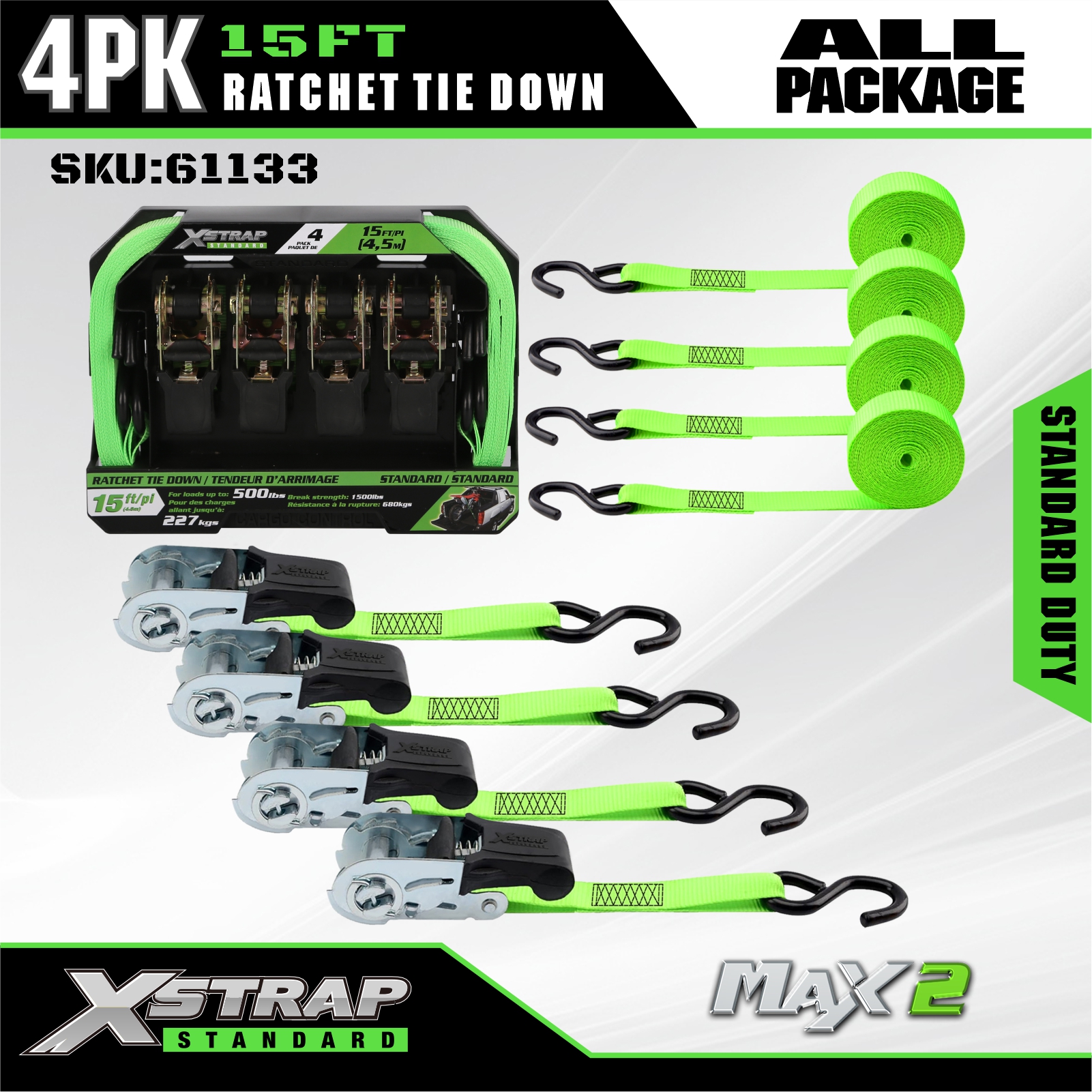 - علامة واضحة لسعة الحمولة: يتم وضع علامة واضحة على كل ربطة سفلية بحمل عمل آمن يبلغ 227 كجم / 500 رطل (SWL) وقوة كسر تبلغ 680 كجم / 1500 رطل، مما يوفر إرشادات سلامة مباشرة لضمان سلامة وخالية من المخاطر.