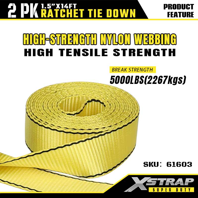 - حزام نايلون عالي الشد (قوة كسر 5000 رطل): مصنوع من أشرطة نايلون صفراء عالية القوة (عرض 1.5 بوصة) - يوفر قوة شد استثنائية (حمل كسر 5000 رطل) ومقاومة للتآكل، مثالي للنقل الثقيل أو مهام التثبيت الصناعية.