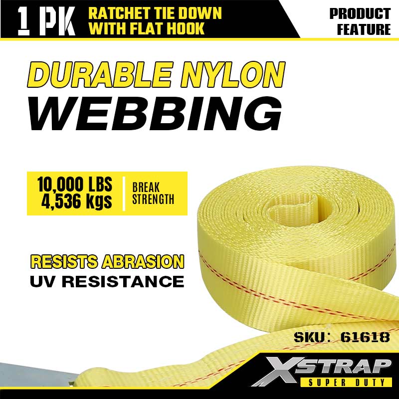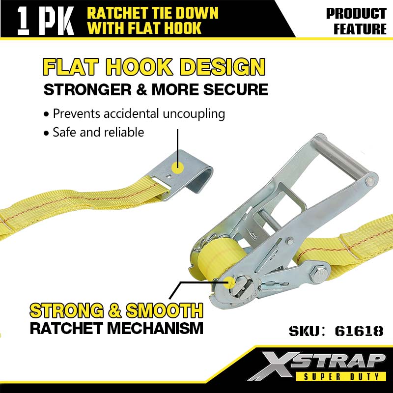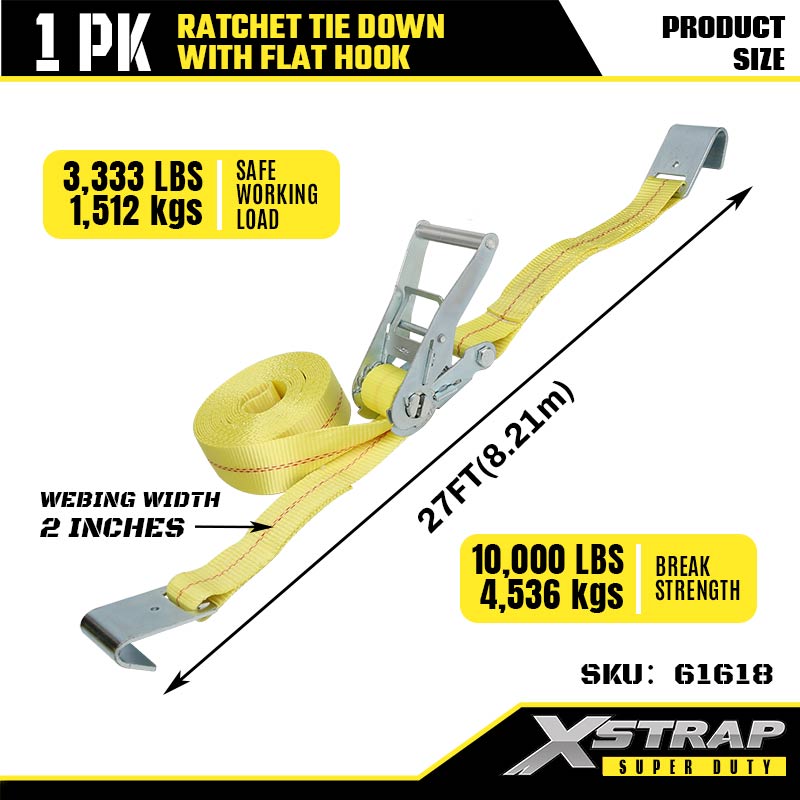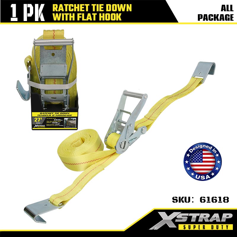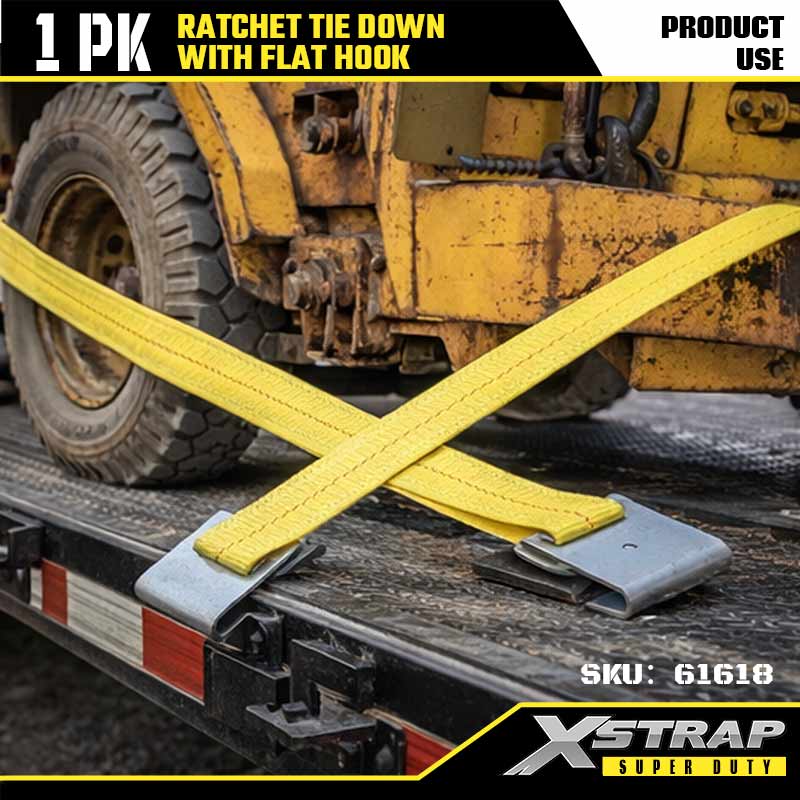 ربط السقاطة Xstrap بخطافات مسطحة، وحزام سقاطة من البوليستر مقاس 2 × 27 بوصة، وأشرطة تثبيت لربط البضائع بسعة 3333 رطلًا مع خطافات مسطحة للمقطورة شديدة التحمل، وقارب تزلج بمقطورة مسطحة، وسيارة صغيرة، ومعدات ثقيلة.
